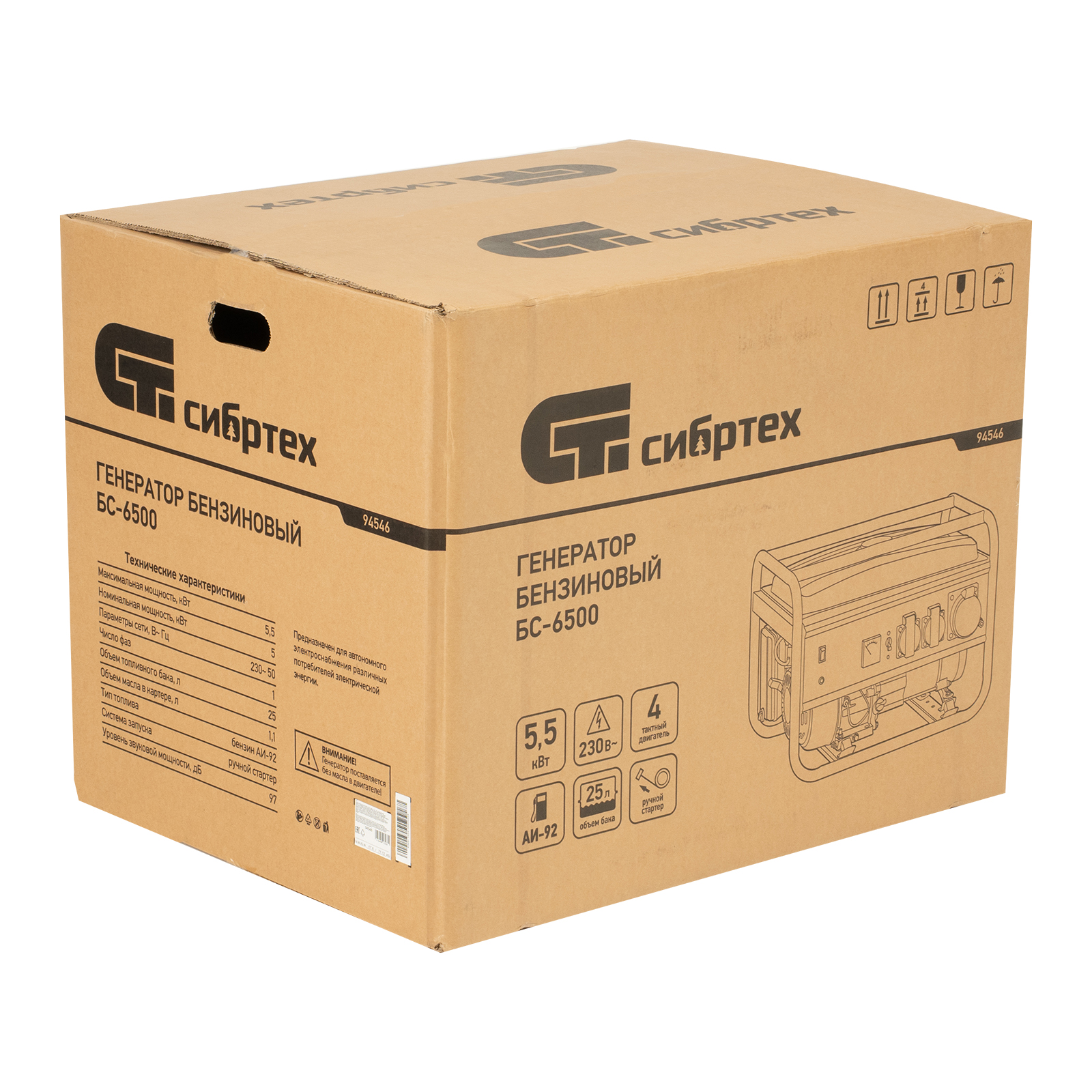 Генератор бензиновый БС-6500, 5.5 кВт, 230В, четырехтактный, 25 л, ручной стартер Сибртех в Краснодаре