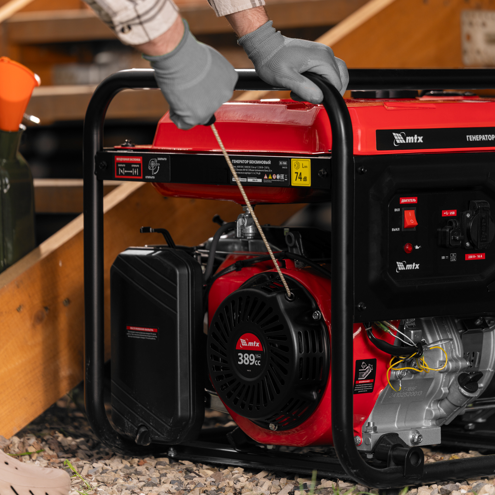 Бензиновый генератор MTX RS-7000 946135 максимальной мощностью 6 кВт, с ручным стартером, поддерживает напряжение 230 В и обеспечивает функционирование бытовой техники, электроинструмента, осветительных приборов и других потребителей в случае отсутствия электросети или перебоев в ее работе. Стабилизатор напряжения AVR защищает чувствительные приборы от поломки. Для подключения потребителей служат 2 розетки 230 В/16 А, для питания мощной техники предназначена силовая розетка 230 В/32 А. На панели управления также предусмотрен выход постоянного тока USB/TYPE-C 5 В, позволяющий заряжать смартфоны, планшеты и другие гаджеты. Генератор пригодится владельцам загородных участков.