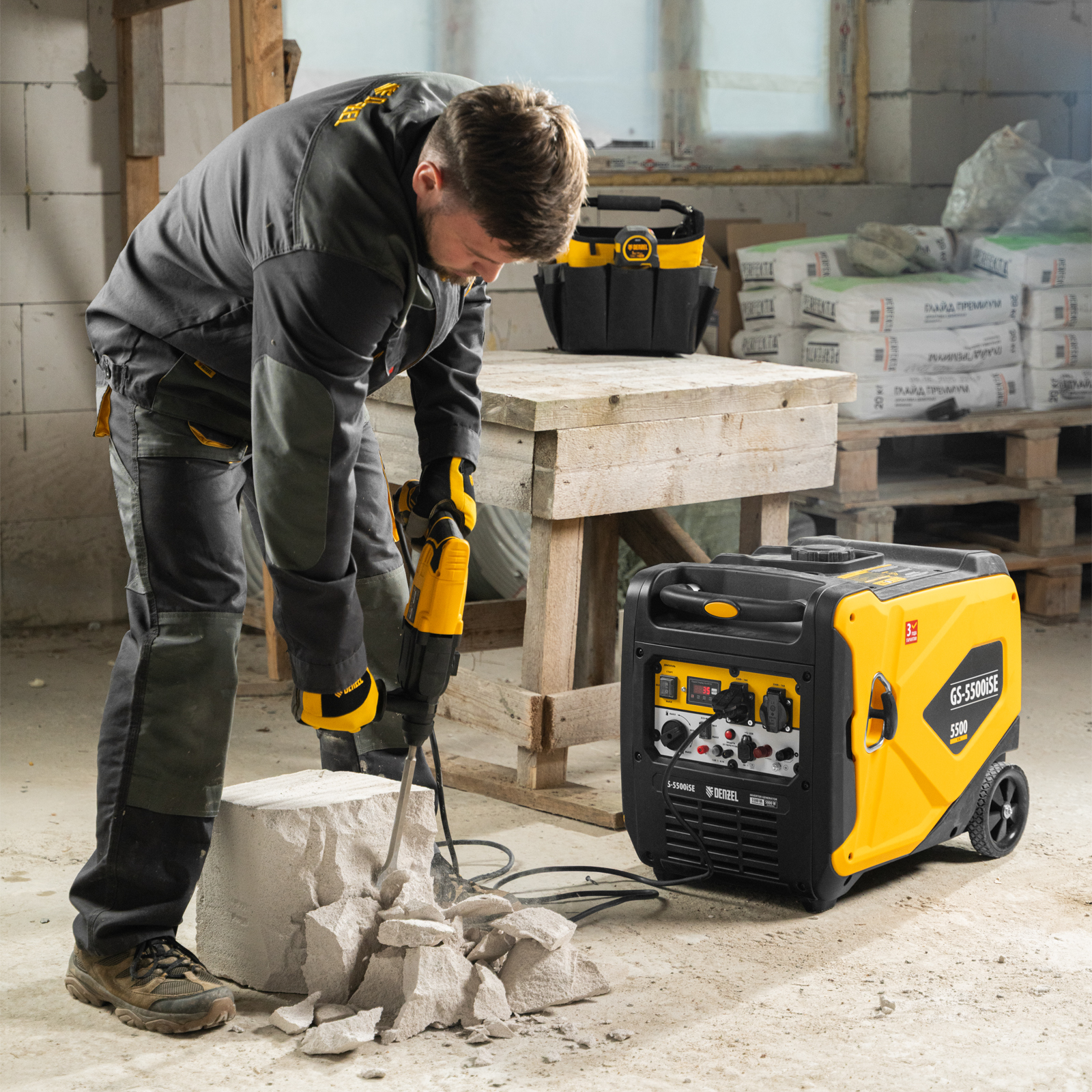 Генератор инверторный Denzel GS-5500iSE 94712 максимальной мощностью 5,5 кВт, в закрытом корпусе, с электростартером, поддерживает напряжение в сети 230 В и используется для обеспечения работоспособности бытовой техники, электроинструмента и осветительных приборов в условиях отсутствия бытовой сети. Для подключения потребителей предусмотрено две розетки 230 В / 16 А. Выход USB 5 В позволяет подключать мобильное устройство, например, смартфон или планшет, а клеммы постоянного тока 12 В служат для зарядки автомобильных аккумуляторов. Предусмотрена возможность снятия полной мощности одним потребителем: на панели управления имеются силовые клеммы. Генератор незаменим в загородном доме.