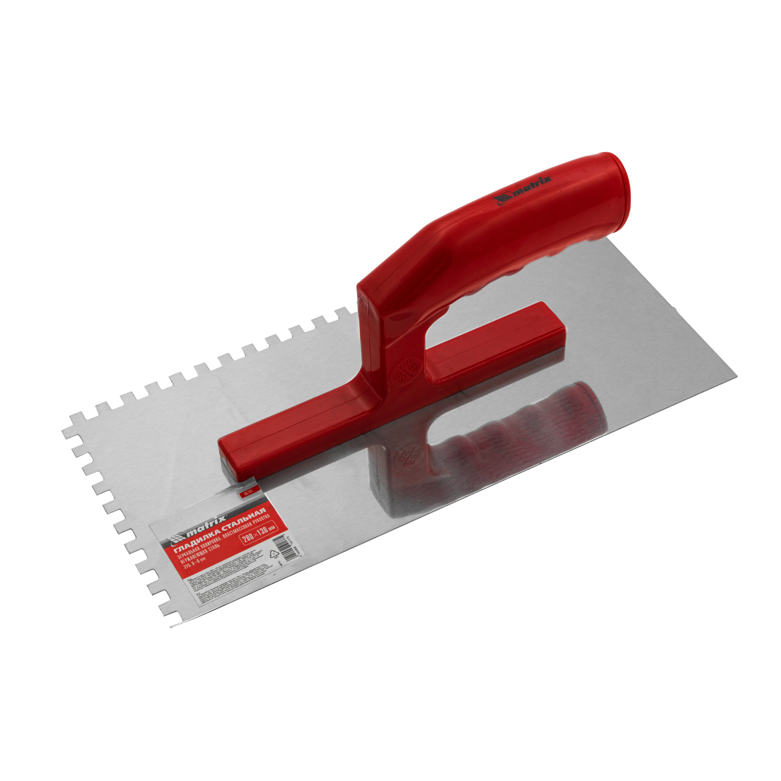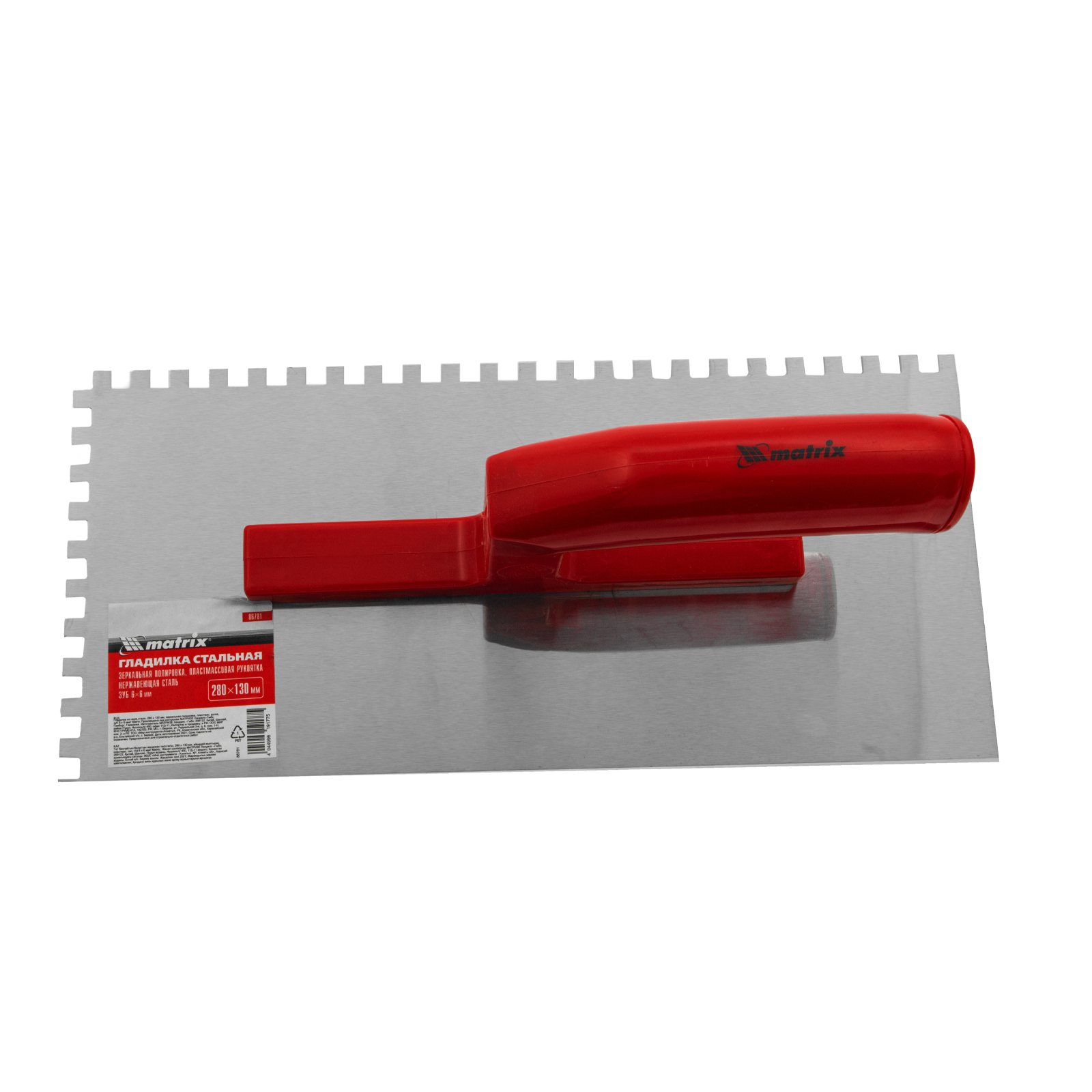 Гладилка Matrix 86781 размером 280 x 130 мм, из нержавеющей стали, с зубьями 6 x 6 мм, зеркальной полировкой и пластмассовой ручкой, пригодится любителям и частным мастерам при проведении ремонтных работ. Она позволяет равномерно наносить строительные растворы и плиточный клей на подготовленные под отделку поверхности.