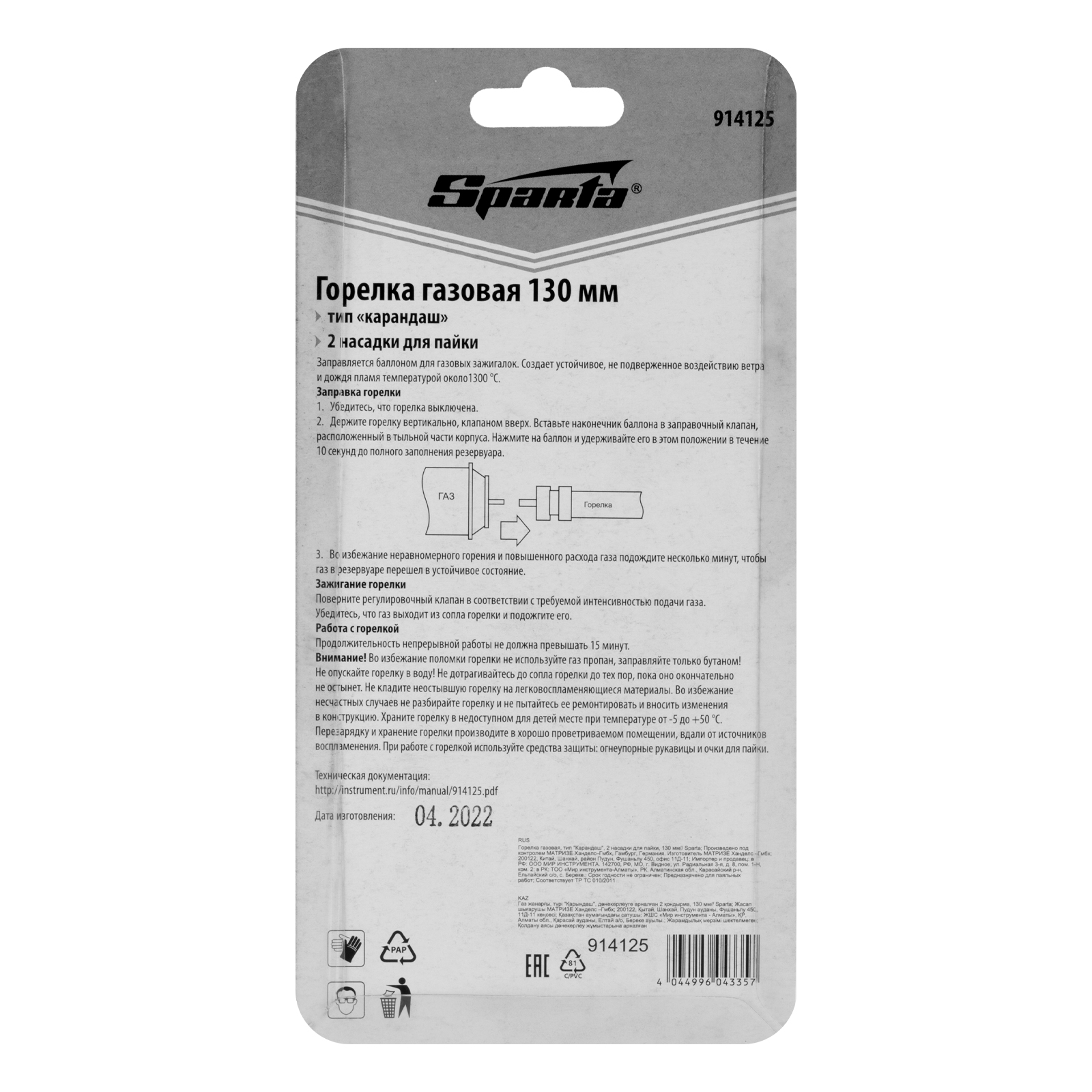 Газовая горелка Sparta 914125 типа «Карандаш», длиной 130 мм, с 2 насадками для пайки, предназначена для получения узкого ровного устойчивого пламени. Может использоваться для розжига костра или мангала, нагрева различных материалов, размораживания замков. Пламя горелки не боится ветра, поэтому ее можно использовать на улице. Горелка подойдет для бытовых целей, будет полезна туристу или радиолюбителю.