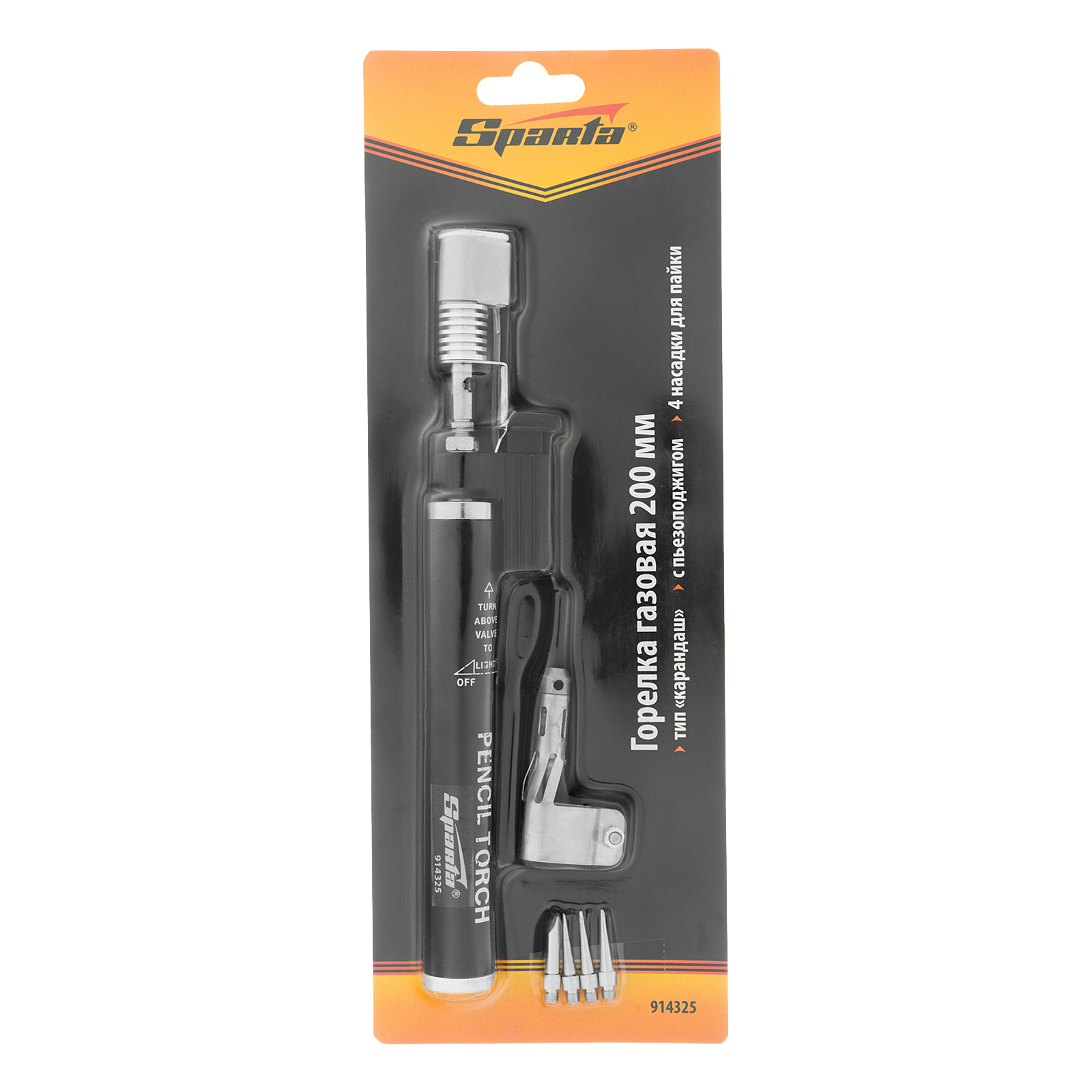 Горелка газовая, тип "Карандаш" c пьезоподжигом + 4 насадки для пайки, 200 мм Sparta в Краснодаре