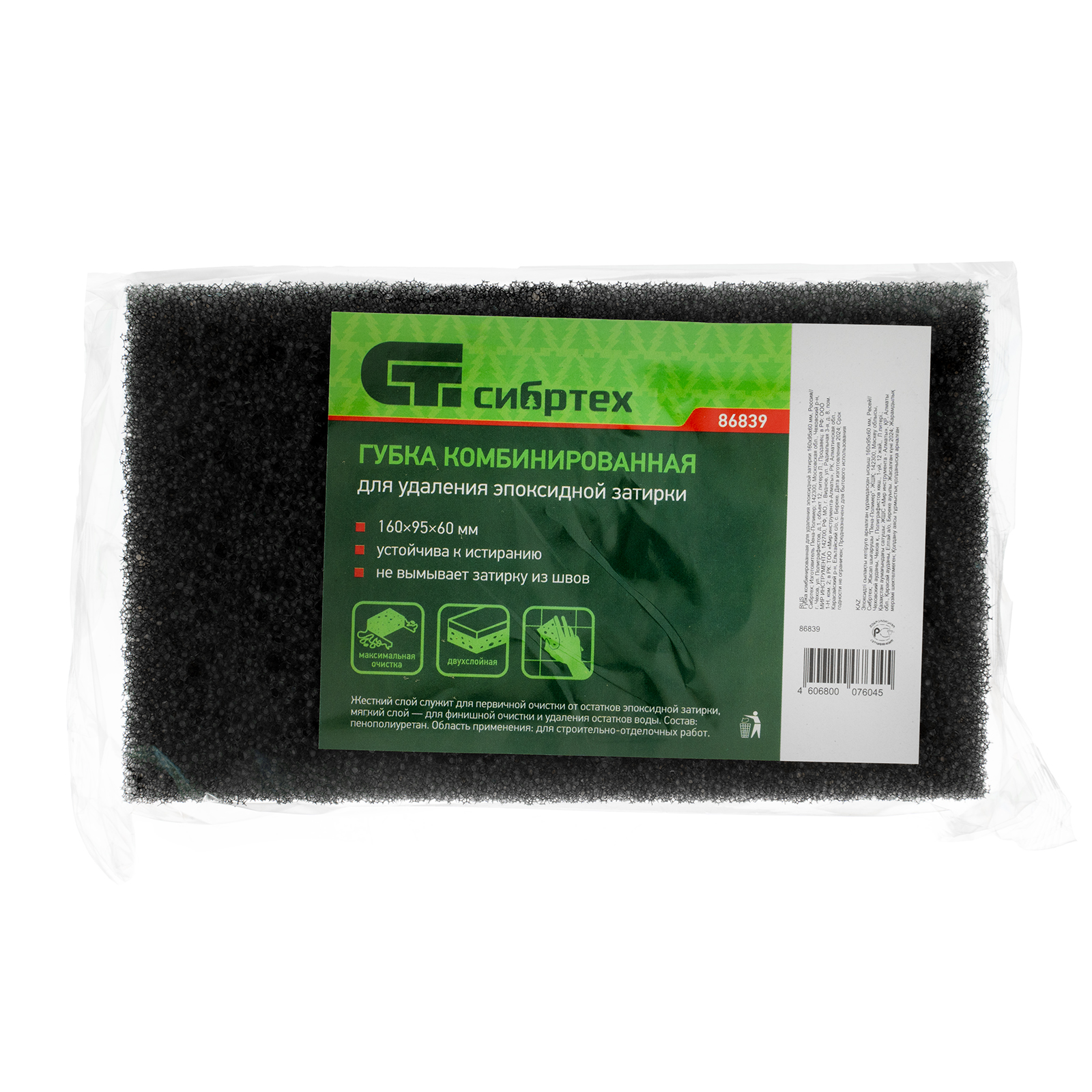 Комбинированная губка Сибртех 86839 размером 160 х 95 х 60 мм применяется для удаления излишков эпоксидной затирки. Она имеет двухслойную структуру: жесткий слой из ретикулированного поролона используется для первичной очистки, а мягкий — для финишной обработки поверхности и удаления воды.
