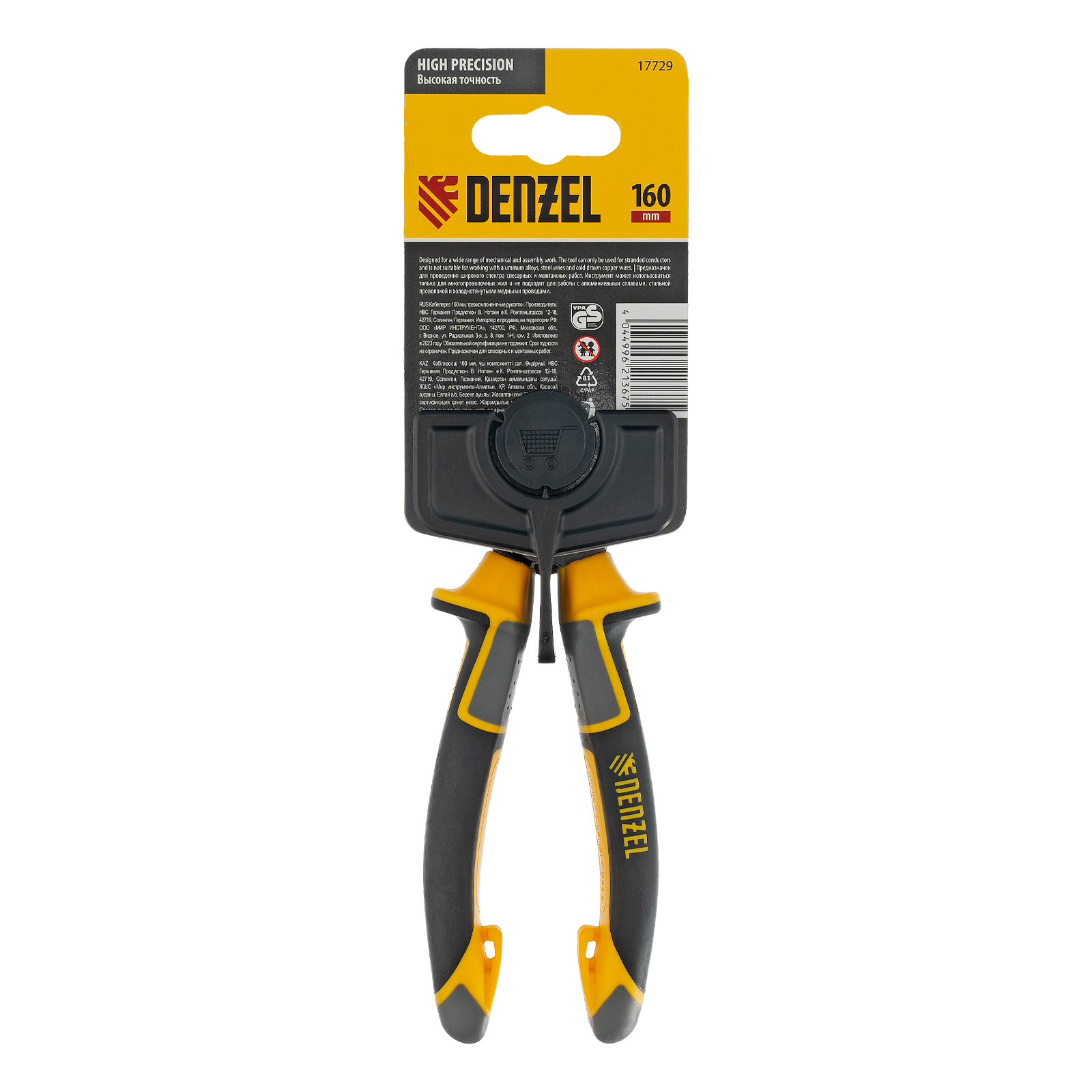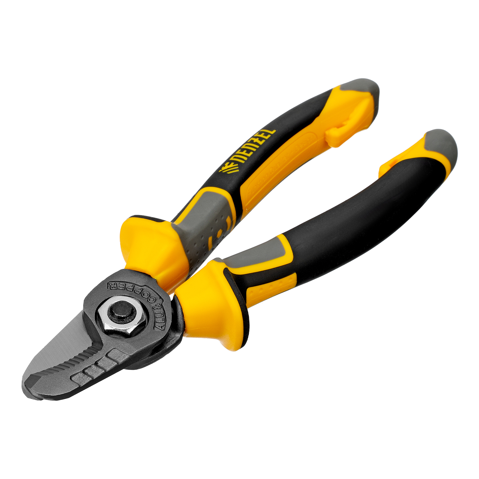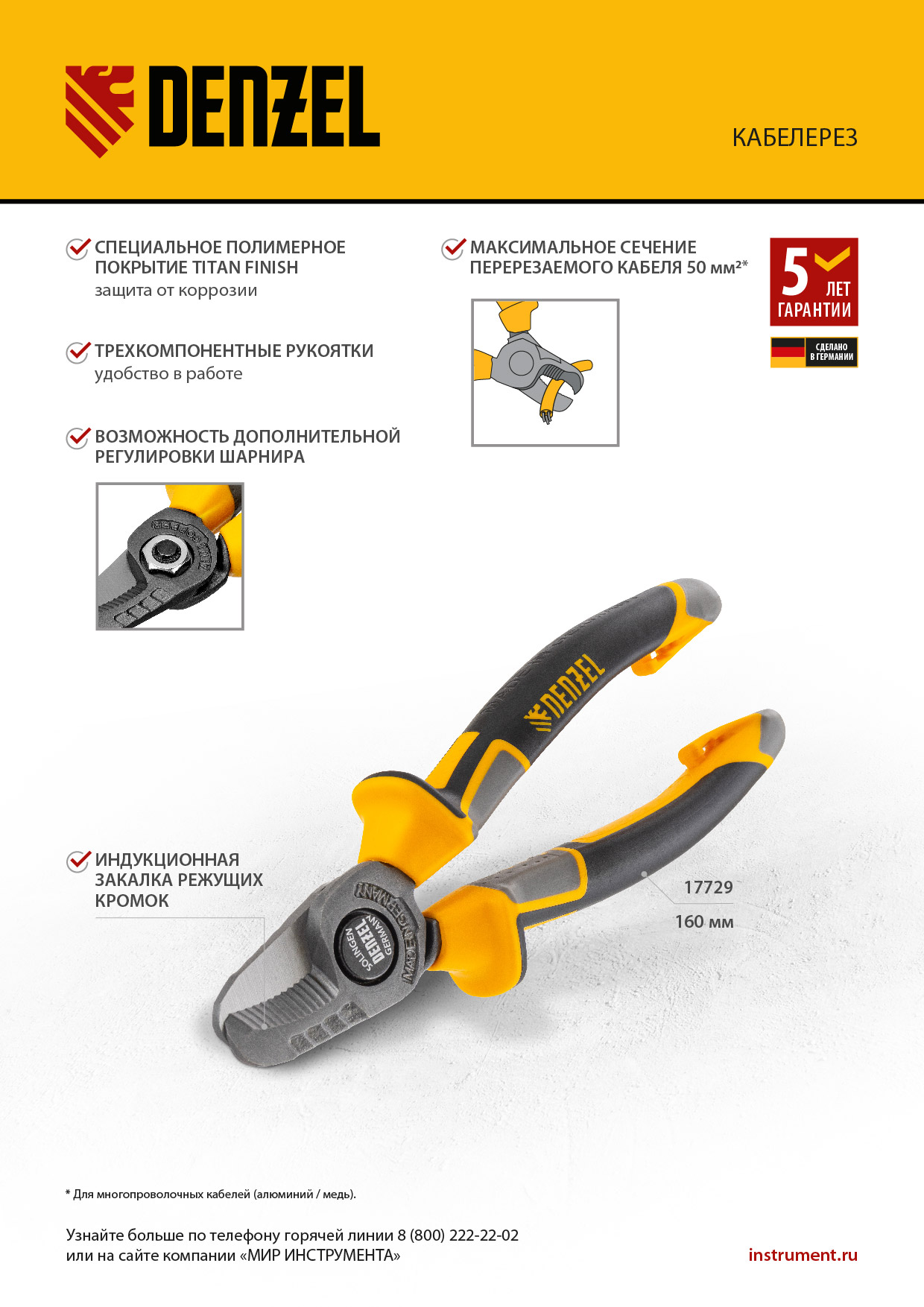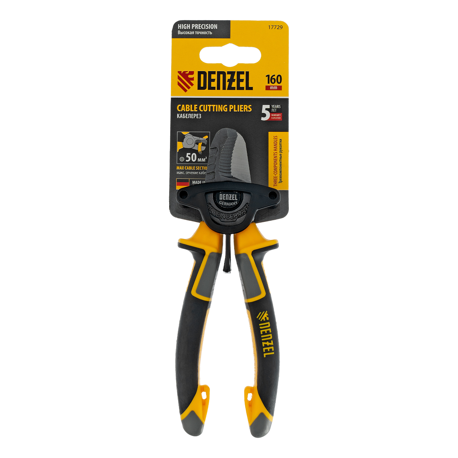 Кабелерез Denzel 17729 длиной 160 мм, с трехкомпонентными рукоятками, — инструмент для зачистки проводов и разрезания электрических кабелей. Способен перерезать кабель из алюминия и меди диаметром до 16 мм или сечением 50 кв. мм.