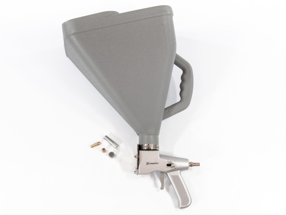 Картушный пистолет для штукатурки Matrix 57350 используется на финишном этапе отделочных работ. Комплектуется насадкой с соплами разного диаметра: 7/32, 1/4, 9/32, 5/16, 11/32, 3/8 и 13/32 дюйма, поэтому подходит для нанесения различных составов: гранитной и мраморной крошки, грунтовки, красок повышенной вязкости, шпатлевки и жидких обоев.