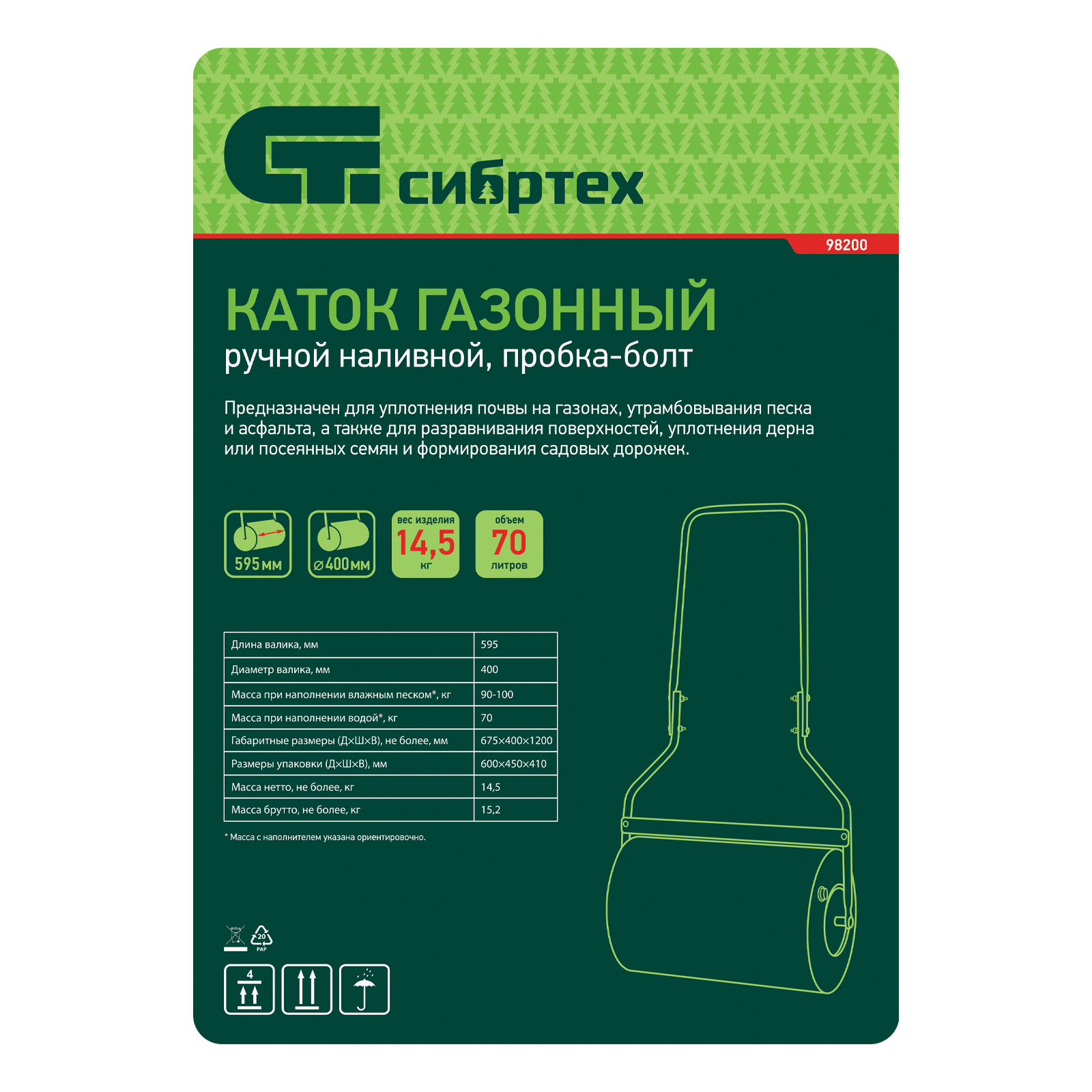 Наливной газонный каток Сибртех 98200 объемом 70 л, с пробкой-болтом, позволяет получить аккуратную лужайку на придомовой территории. Широкая рабочая часть уплотняет и выравнивает газон до и после настила и стрижки, обеспечивая необходимые для быстрого роста травы условия. Также каток можно применять для прессования асфальта, слоя песка перед укладкой плитки, формирования садовых дорожек и решения других задач.