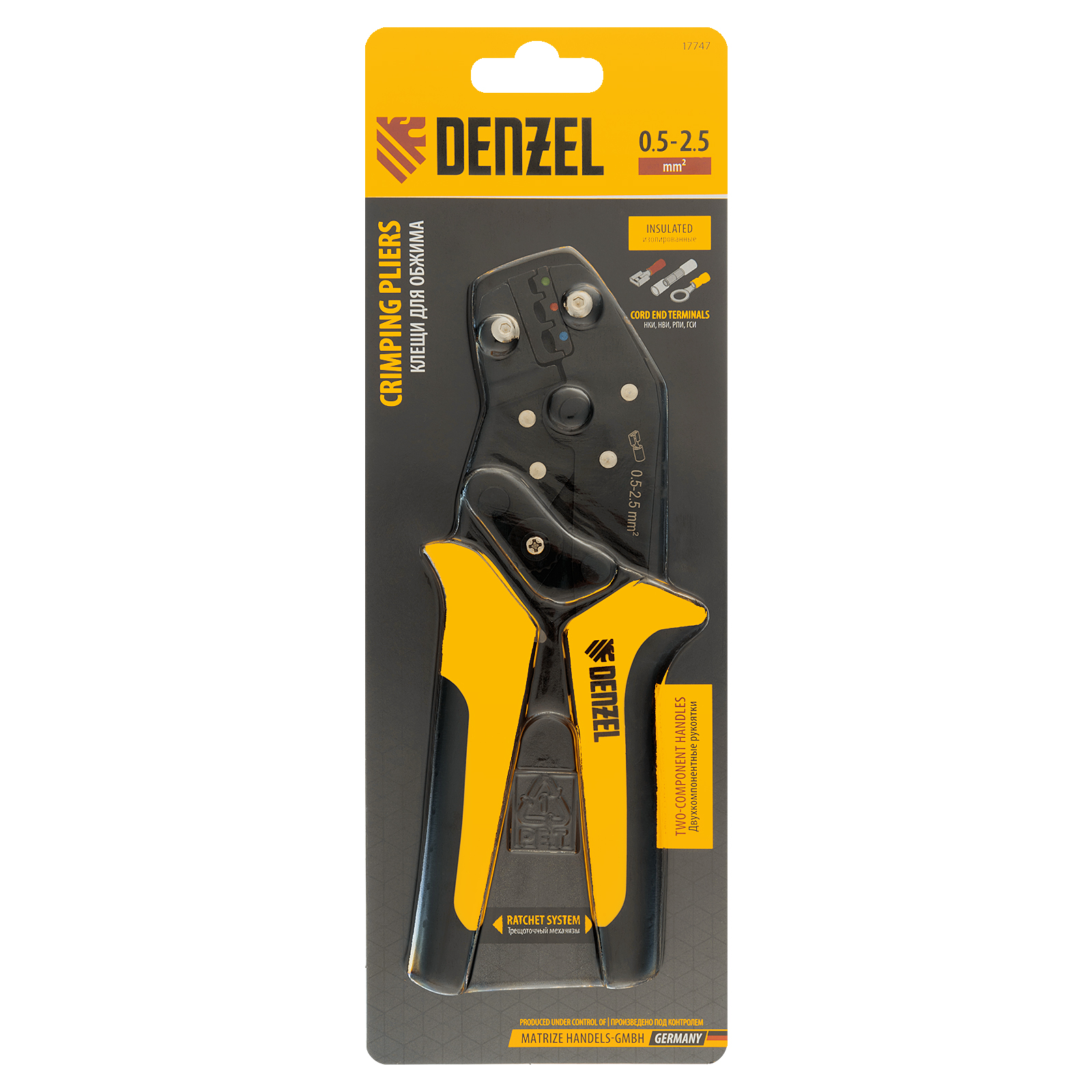 Клещи Denzel 17747 предназначены для обжима изолированных кольцевых наконечников НКИ и вилочных НВИ, разъемов плоских РПИ, гильз соединительных ГСИ сечением 0,5-2,5 мм². Инструмент пригодится частным и профессиональным мастерам при проведении электромонтажных работ.