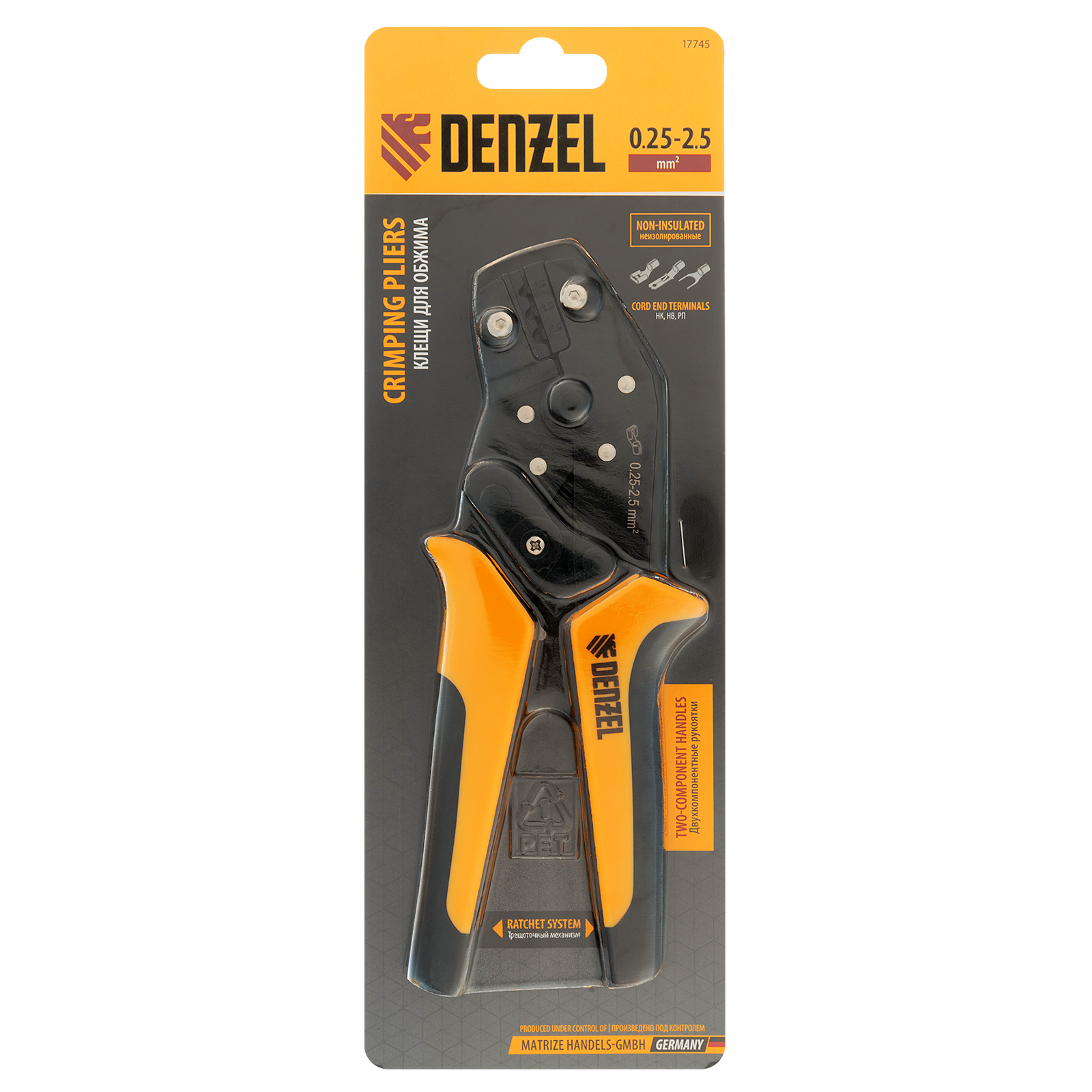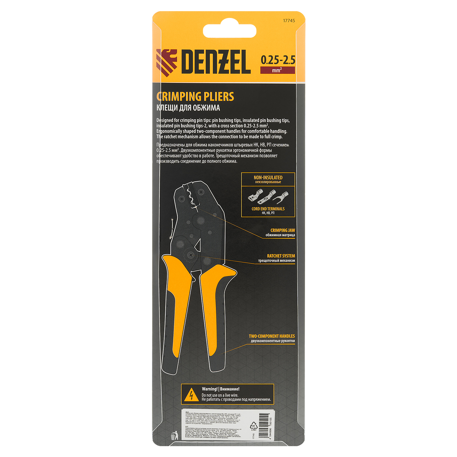 Клещи Denzel 17745 предназначены для обжима неизолированных наконечников кольцевых НК и вилочных НВ, разъемов плоских РП сечением 0,25-2,5 мм². Инструмент пригодится частным и профессиональным мастерам при проведении электромонтажных работ.