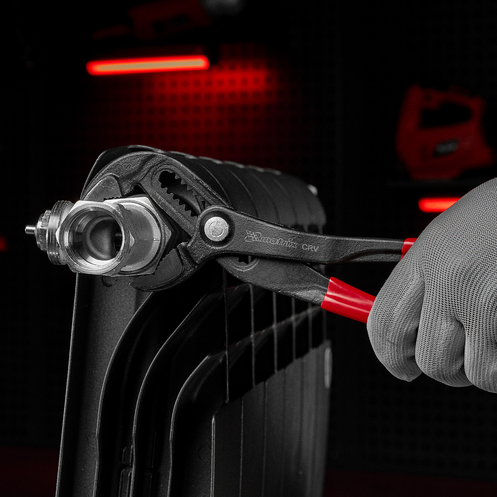 Переставные клещи Matrix 17927 длиной 300 мм, выполненные из хромованадиевой стали, с кнопочным механизмом и обливными рукоятками, используются для проведения монтажных и слесарных работ. Универсальный инструмент заменяет ключи различных размеров и применяется для фиксации заготовок, откручивания гаек, зажима и удержания труб диаметром до 64 мм.