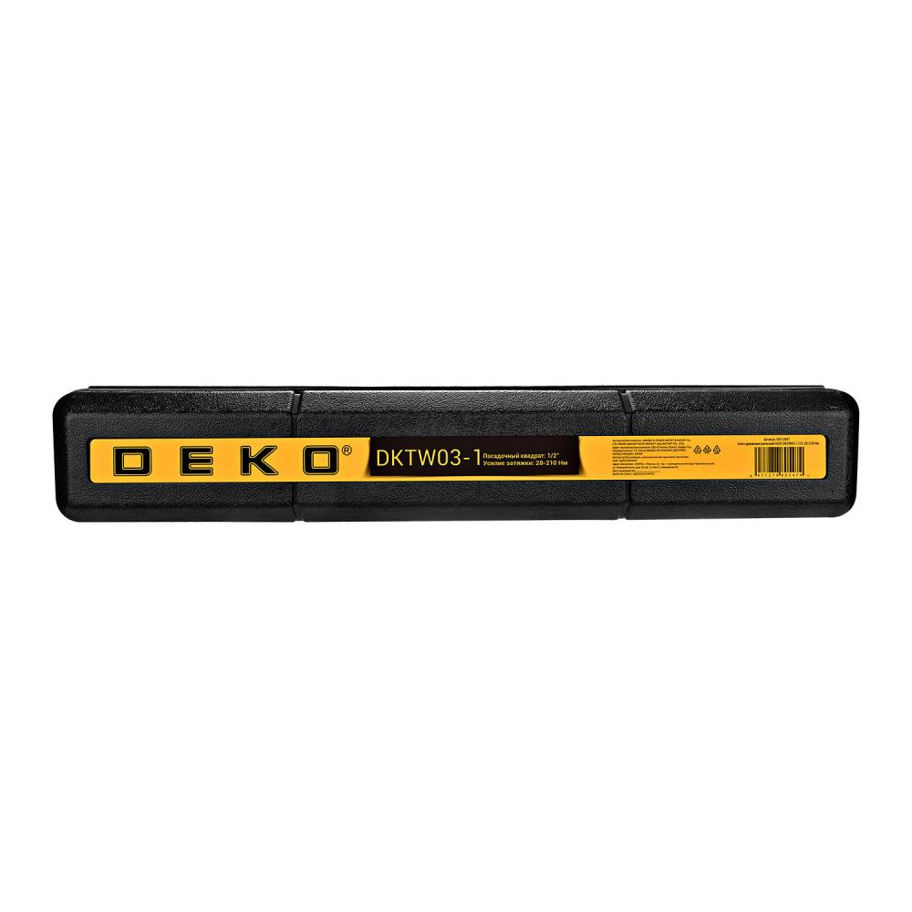 Ключ динамометрический DEKO DKTW03-1 1/2, 28-210 Нм используется в автомастерских для закручивания резьбовых соединения с нужным крутящим моментом. Технические характеристики:  Посадочный квадрат: 1/2"