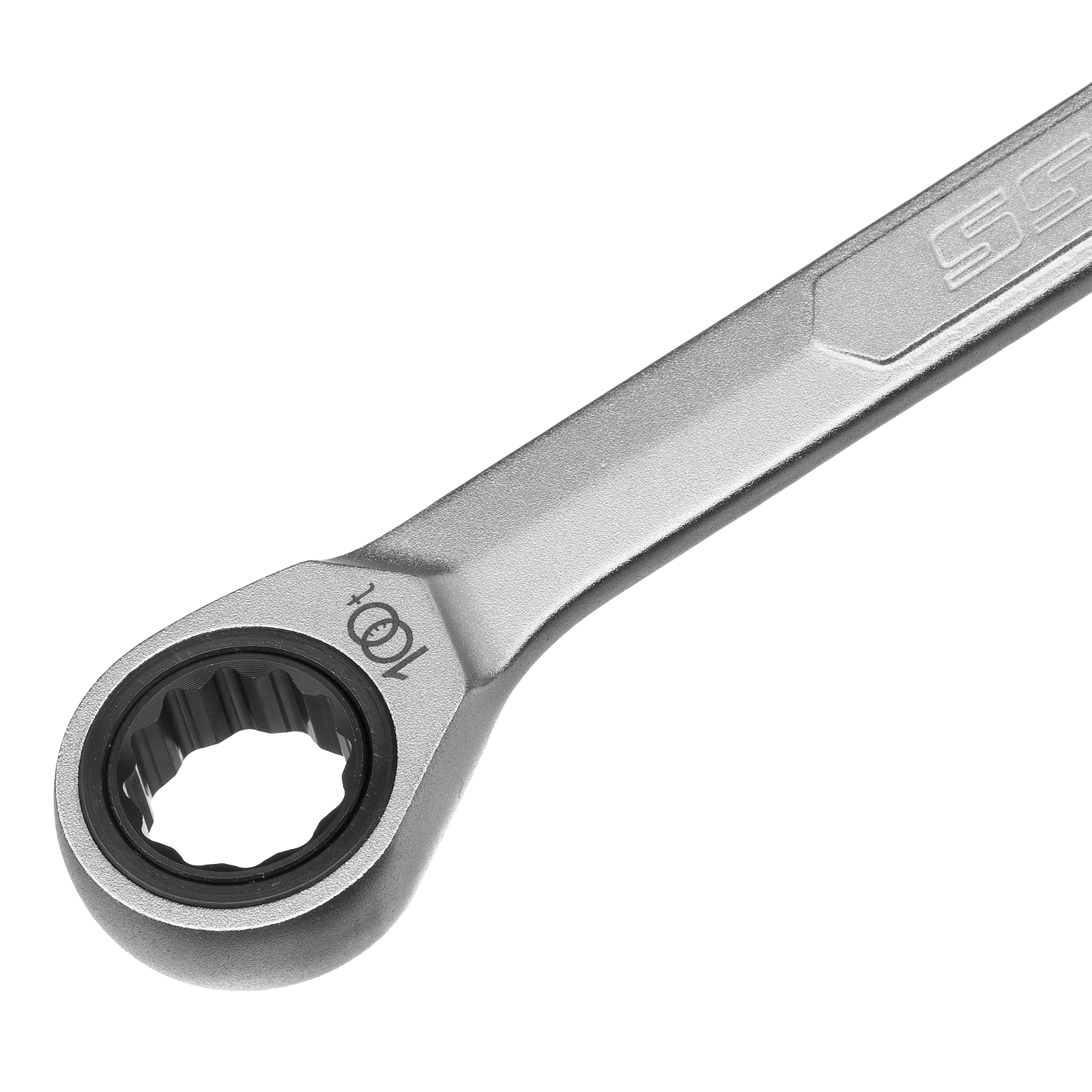 - Храповый механизм оснащен 100 зубцами, что обеспечивает плавность хода инструмента (шаг трещотки всего 3,6 градусов) и делает его удобным для работы в ограниченном пространстве.