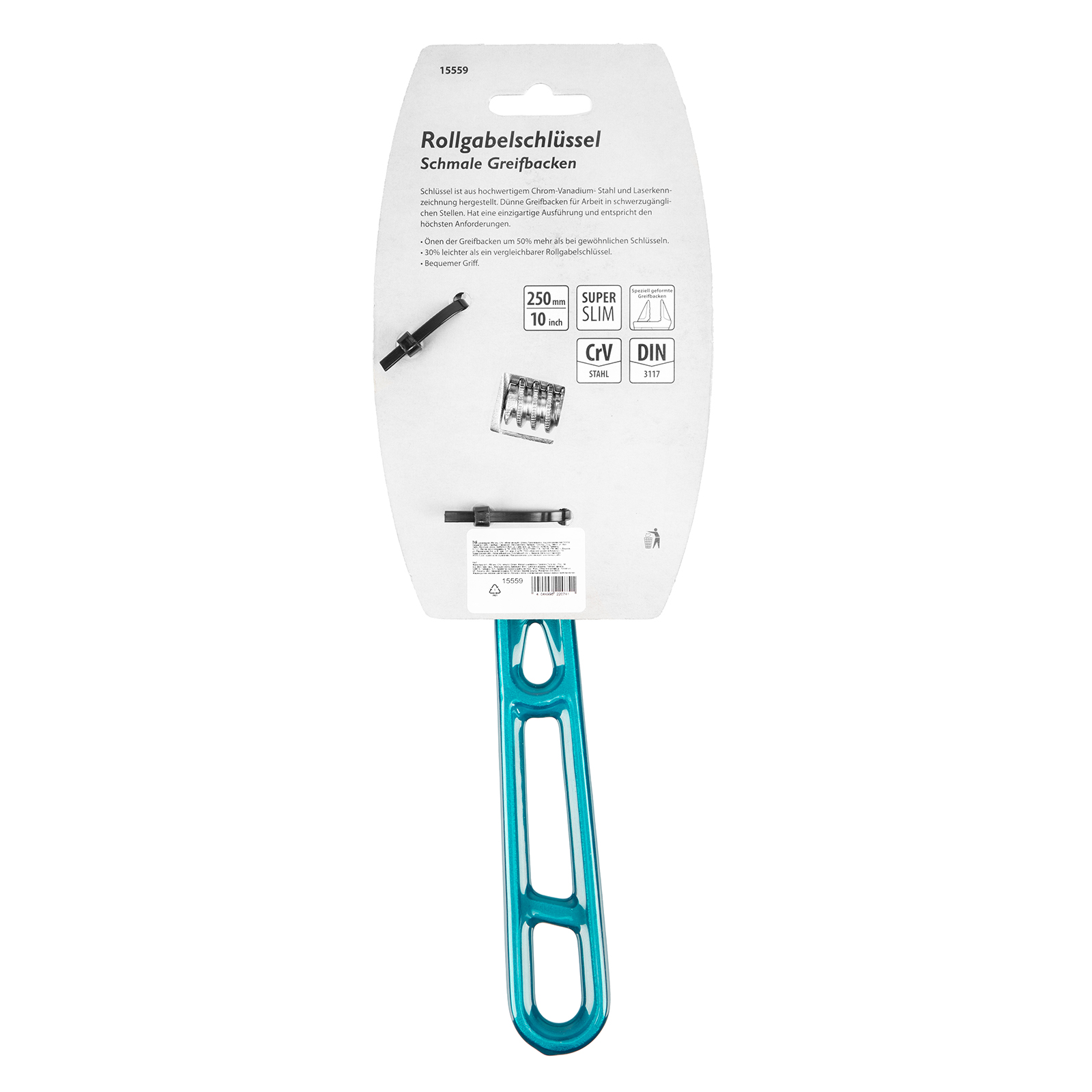 Облегченный разводной ключ Gross 15559 длиной 250 мм, из стали CrV, подходит для работы как с мелкими, так и с крупными крепежными элементами. Максимальный диапазон раскрытия зева составляет 43 мм. Конструкция инструмента усилена благодаря дополнительным ребрам жесткости на рукоятке. Ребристая рабочая поверхность губок обеспечивает надежный захват деталей и повышает точность работы.