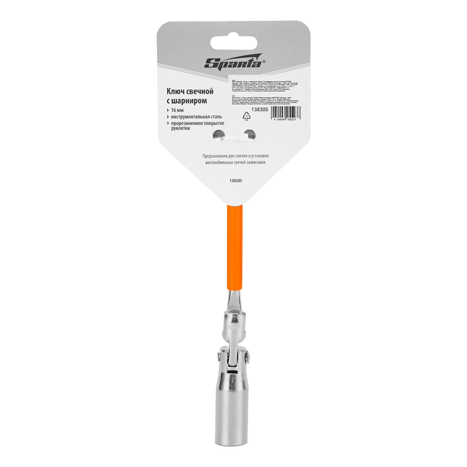 Свечной ключ с шарниром Sparta 138305, 16 мм, предназначен для замены автомобильных свечей зажигания. Он пригодится автолюбителям для самостоятельного ремонта авто и работникам СТО. Ключ легко проникает в труднодоступные места благодаря наличию двойного шарнира. Свеча не выпадает из ключа за счет встроенного резинового кольца.