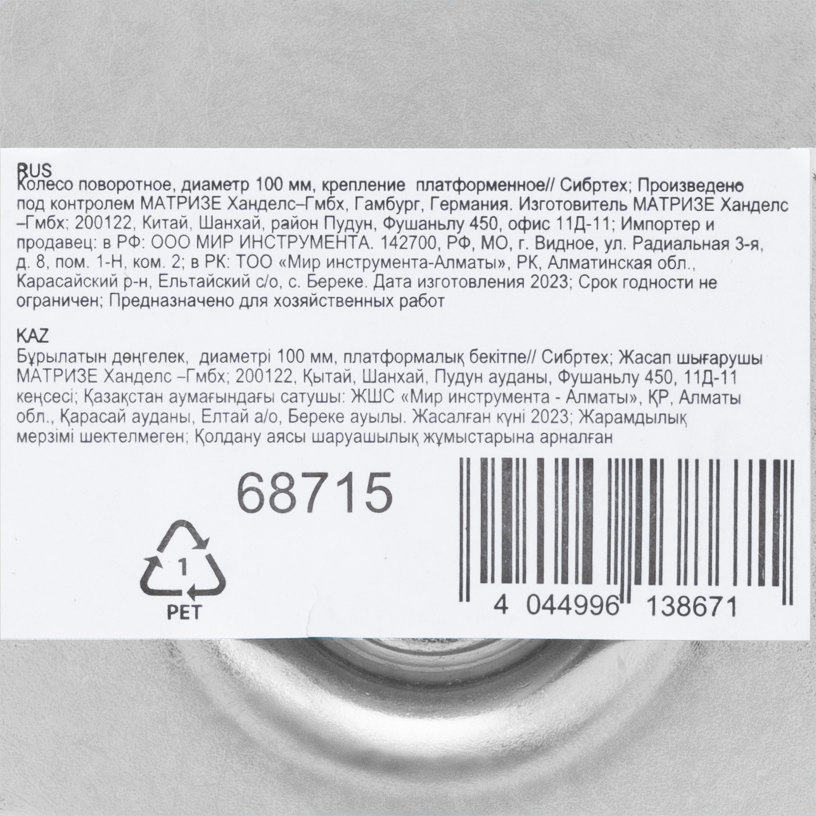 Колесо поворотное Сибртех 68715 диаметром 100 мм, с платформенным креплением, имеет грузоподъемность 65 кг и устанавливается на ручные промышленные тележки. Выдерживает температуру от -25 до +50 °C, устойчиво к воздействию ультрафиолета и влаги, поэтому подходит для эксплуатации как внутри помещения, так и снаружи. Поворотный механизм облегчает маневрирование. Колесо используется для перемещения грузов на производстве или на складах.