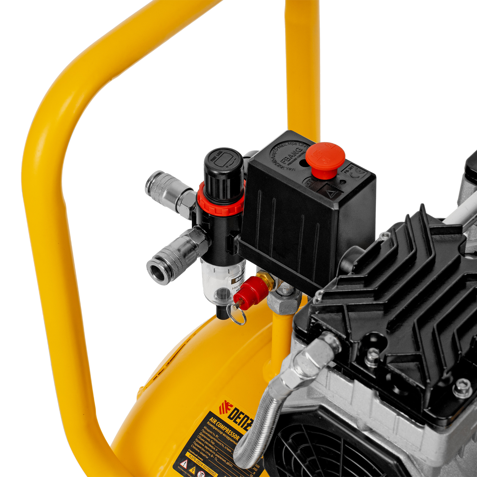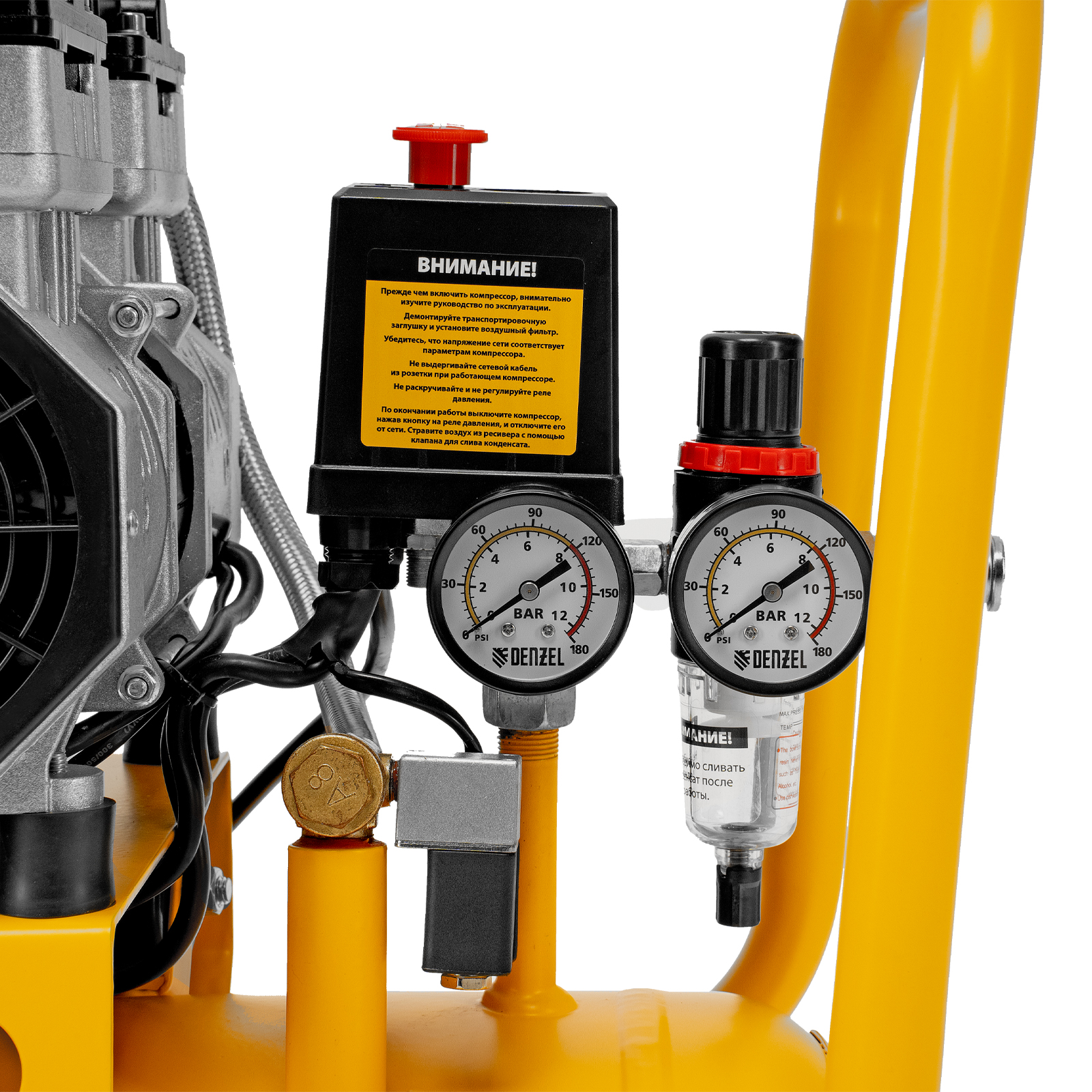 - Контроль давления в ресивере и на выходной магистрали — компрессор оборудован двумя манометрами.