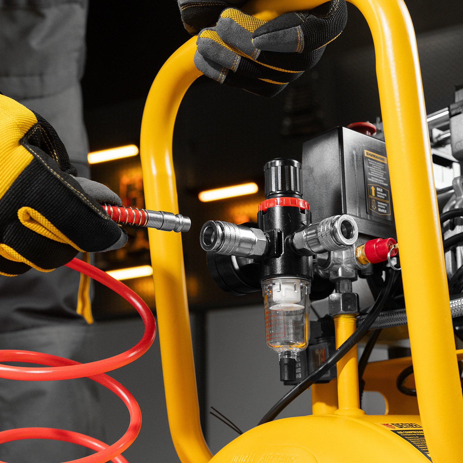 - Простая подготовка к работе — благодаря быстросъемному выходному коннектору подключение пневмоинструмента занимает несколько секунд.