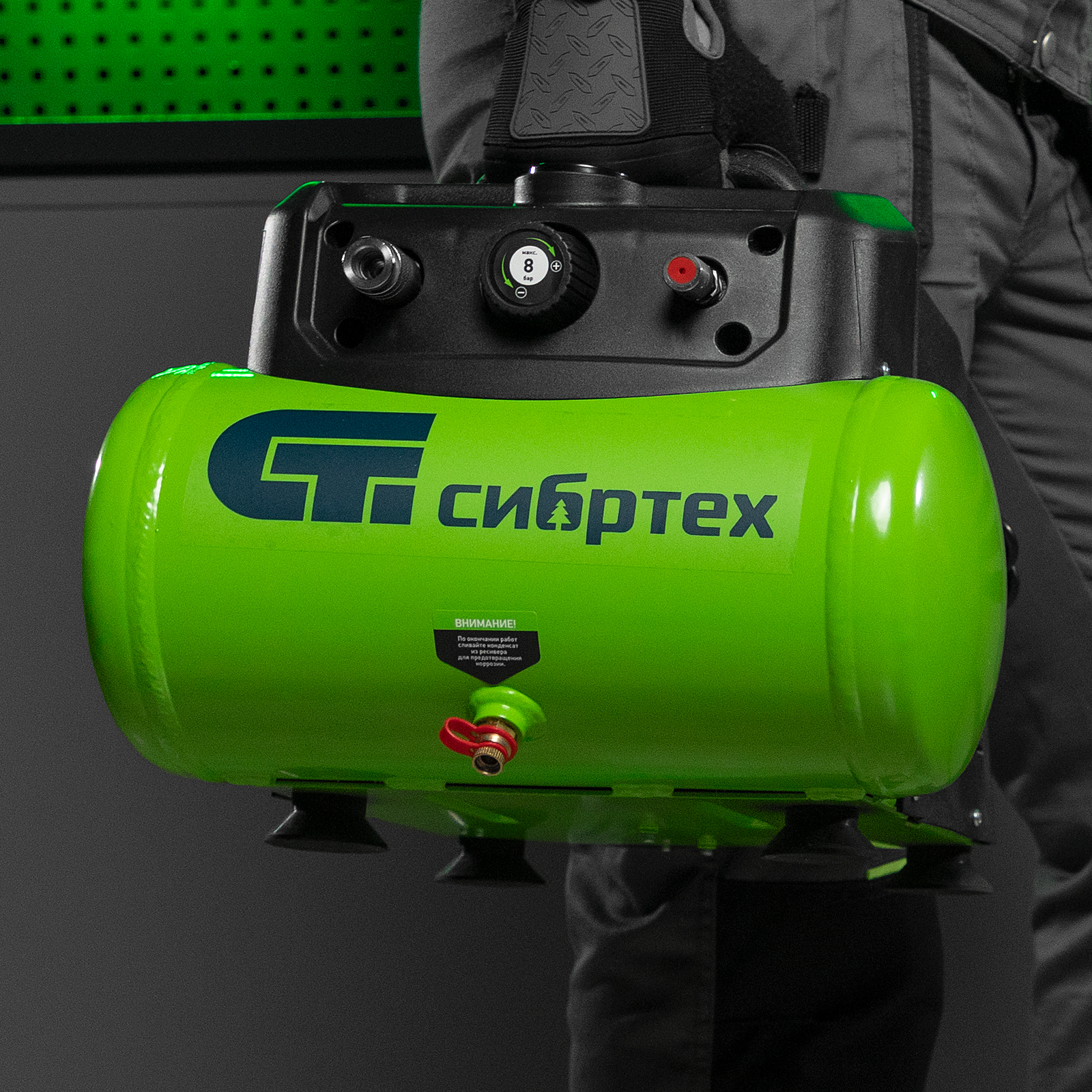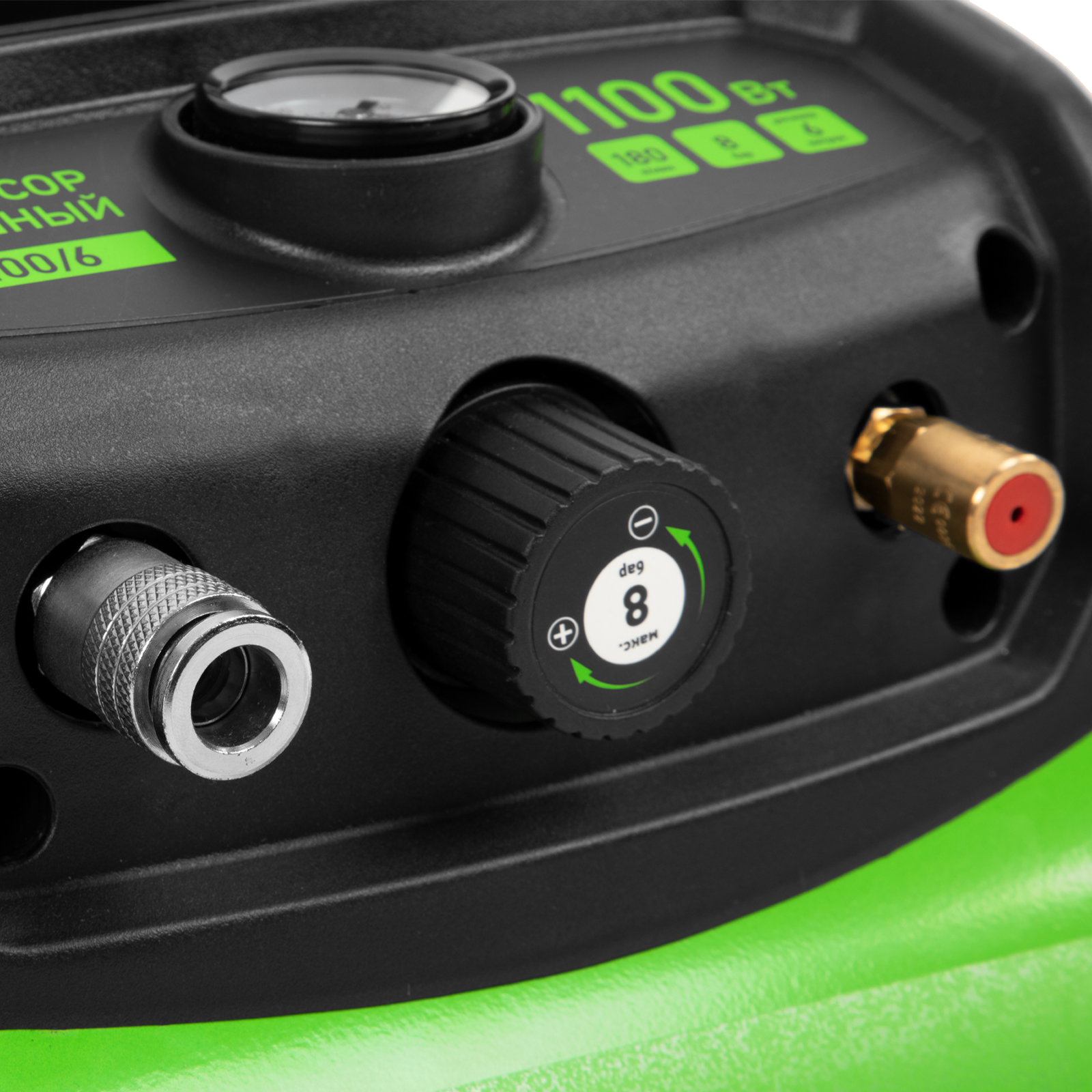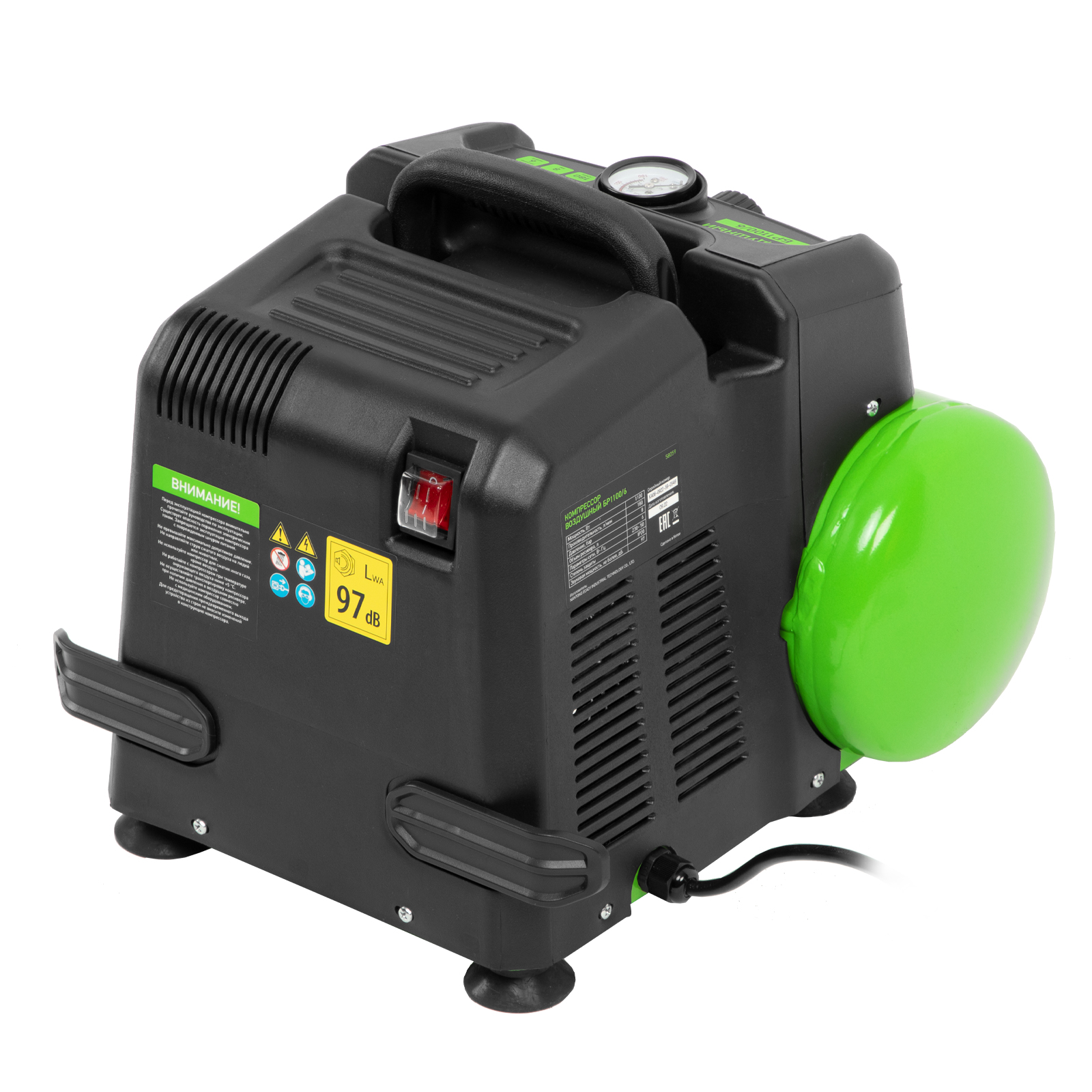 Воздушный безмасляный компрессор Сибртех BL 1100/6 58059 мощностью 1100 Вт, с ресивером емкостью 6 литров, служит для подачи сжатого воздуха под давлением до 8 бар со скоростью 180 л/мин. К нему можно подключить краскораспылитель, продувочный пистолет, заклепочник, пистолет для накачки шин и другой пневмоинструмент. Отсутствие масла делает компрессор оптимальным для выполнения покрасочных работ и продувки электронных компонентов. Устройство предназначено для бытового использования.,Одна из основных особенностей данной модели — компактность и удобство в перевозке. Компрессор отличается небольшим весом и дополнен эргономичной транспортировочной ручкой.