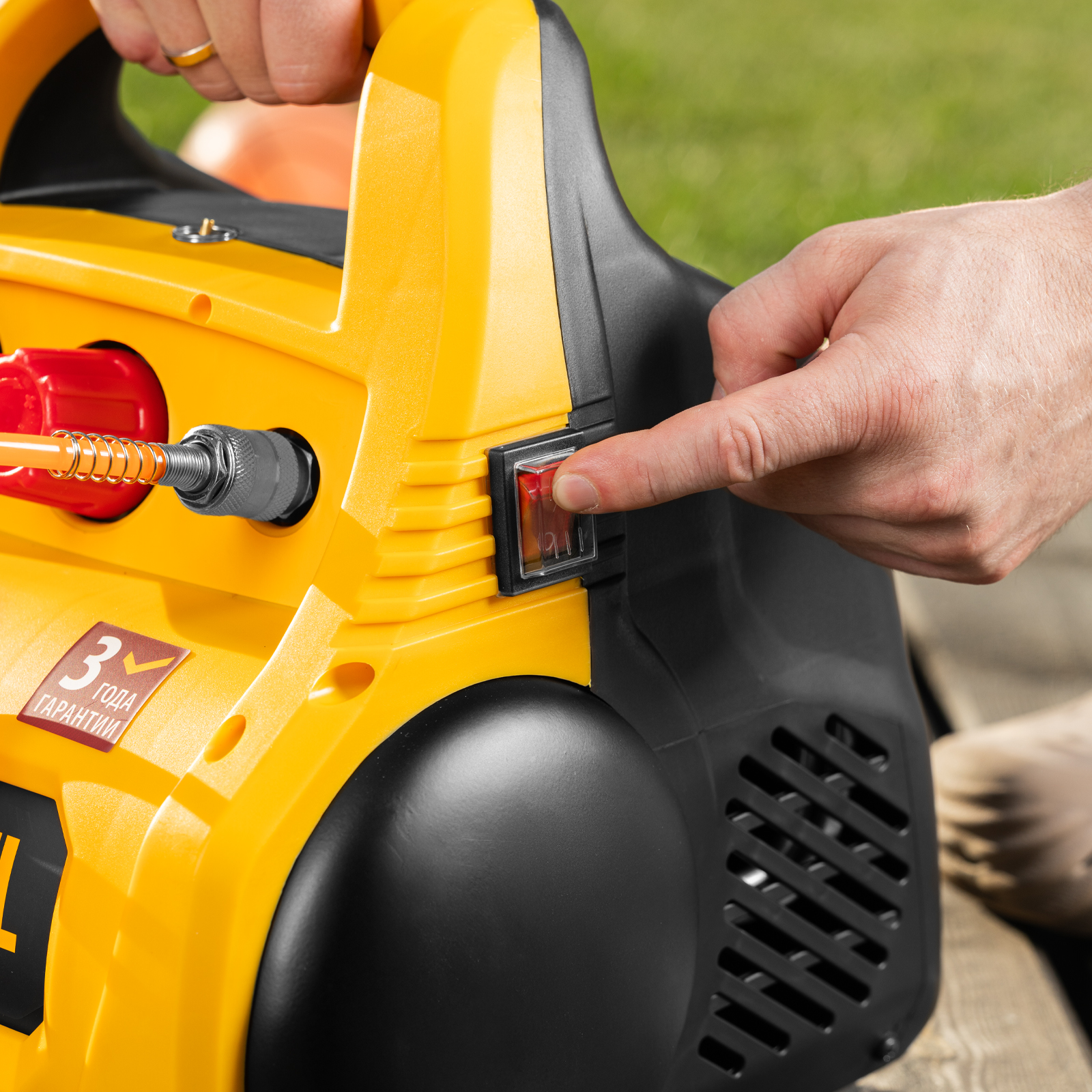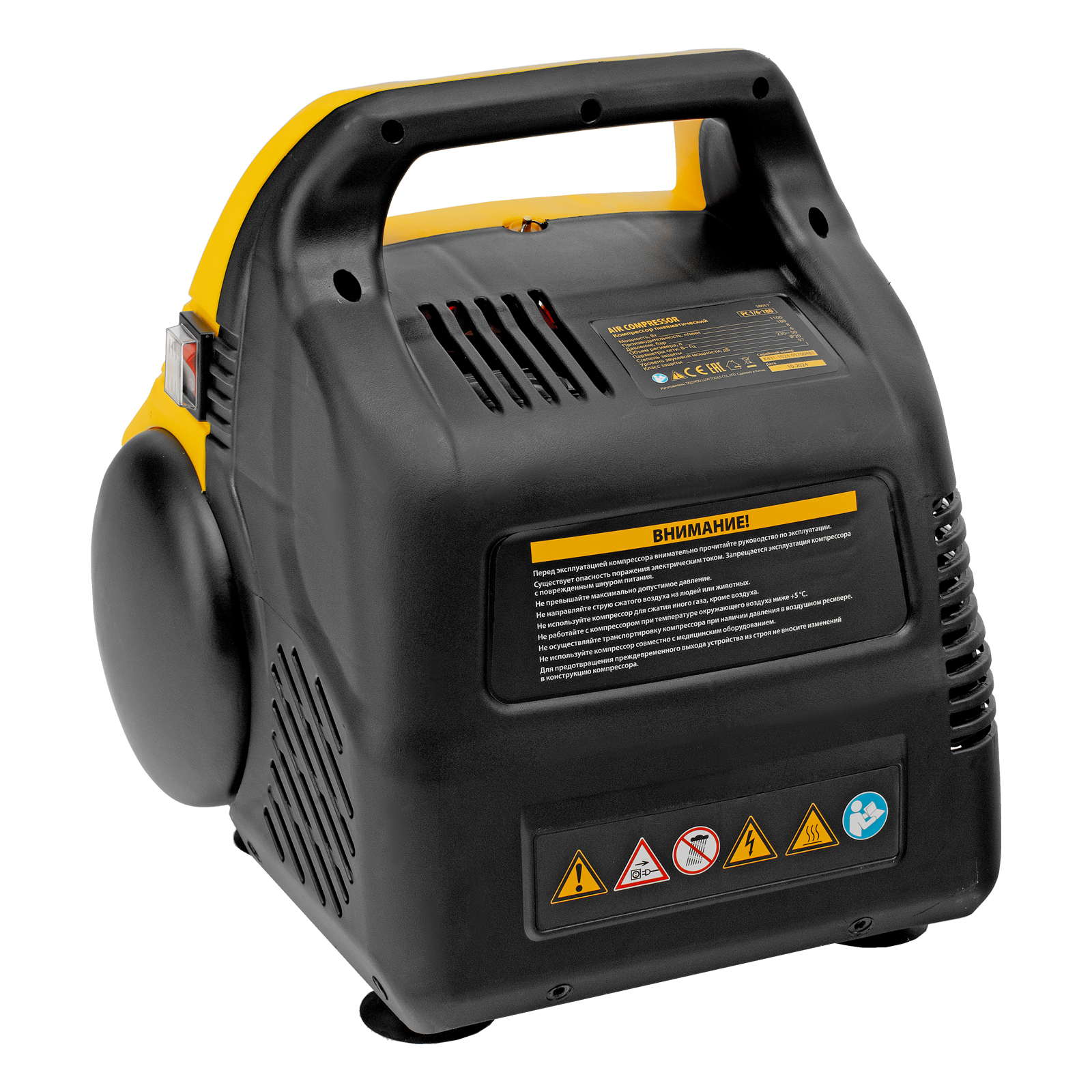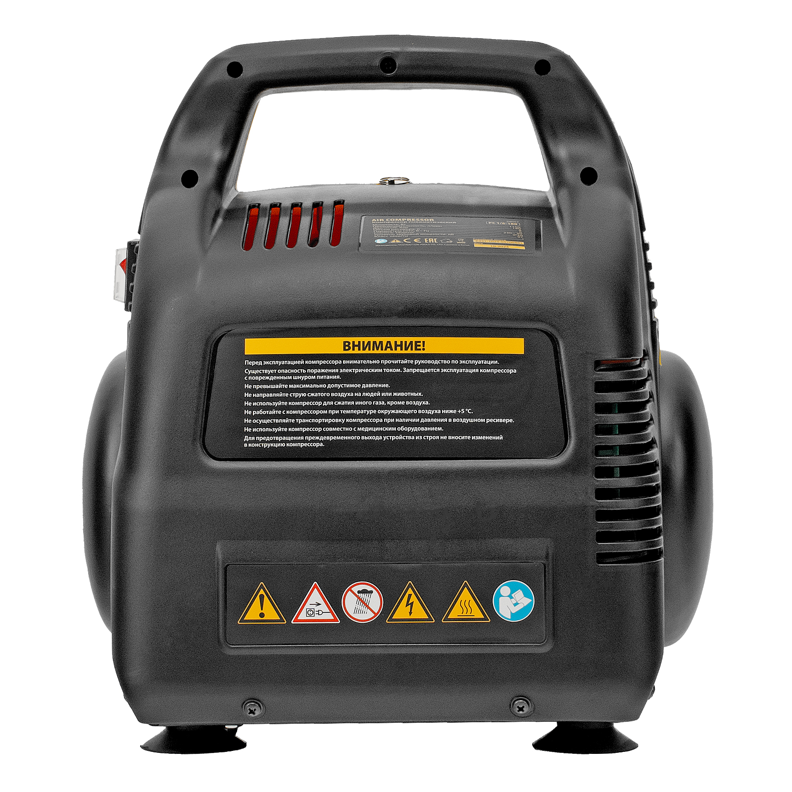 - Безопасность использования — конструкция корпуса исключает вероятность ожога об двигатель и компрессорную головку, поскольку все элементы находятся внутри.