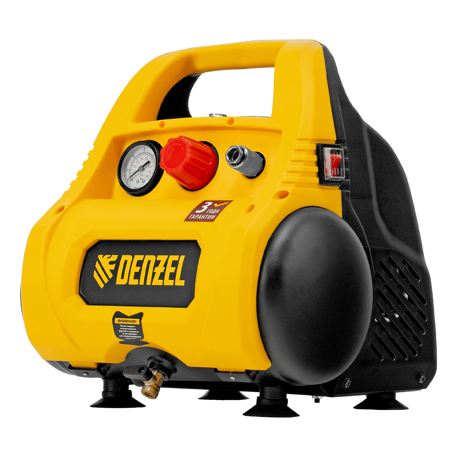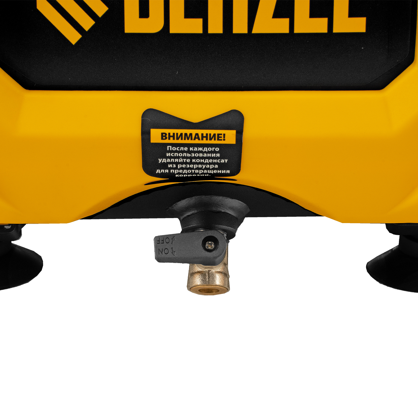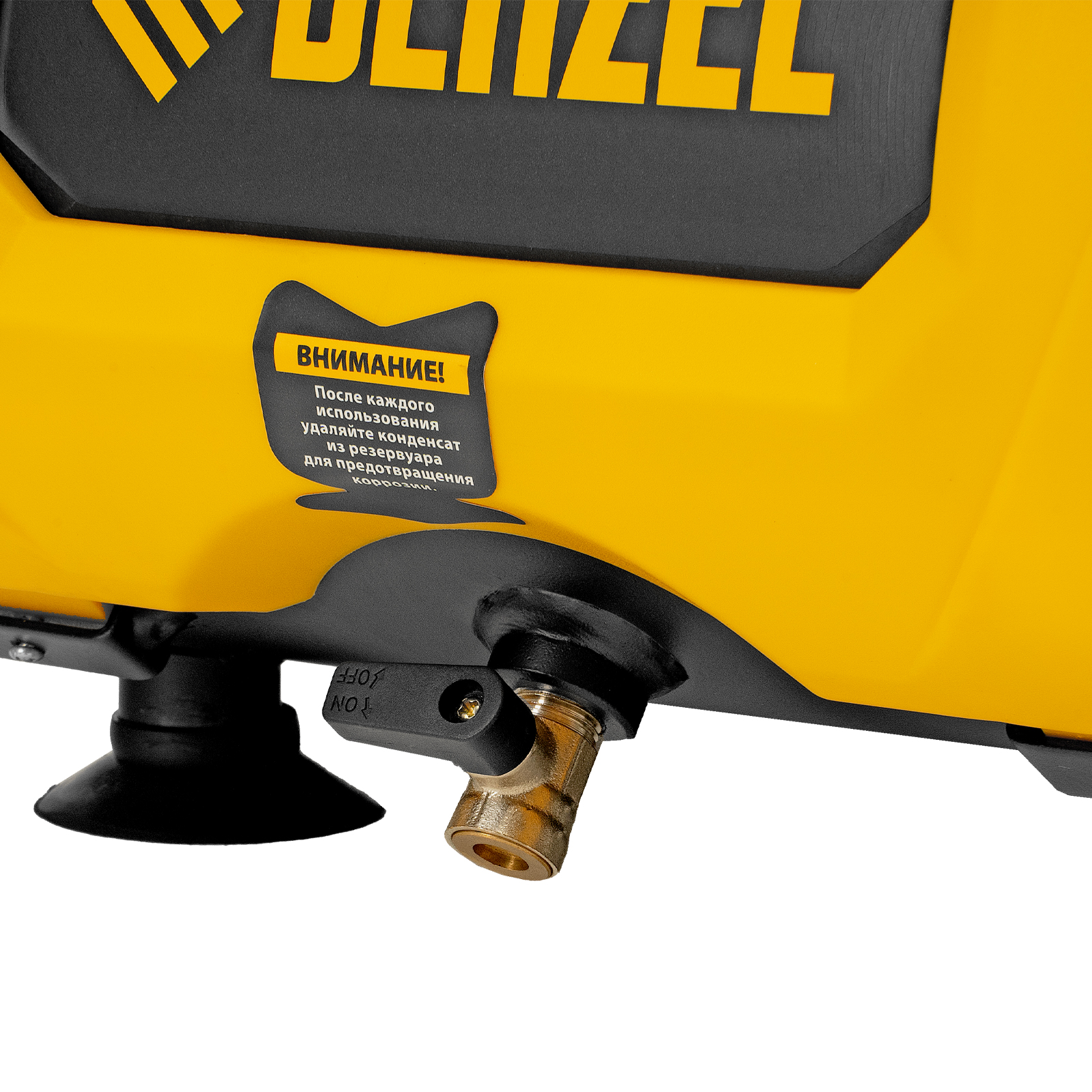 - Быстрое избавление от конденсата — влага из ресивера удаляется в два счета простым поворотом вентиля, без использования гаечного ключа.