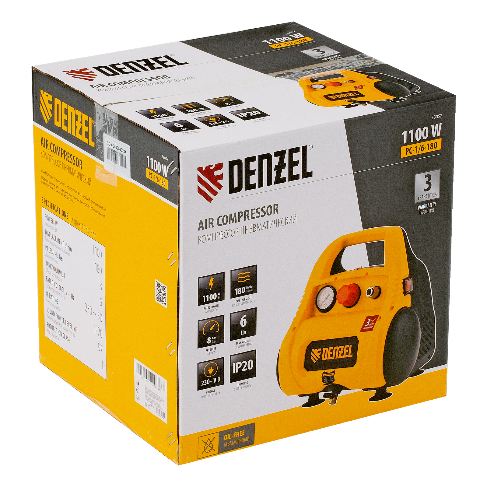 Компрессор воздушный безмасляный РС 1/6-180,1, 1 кВт, 180 л/мин, 6 л Denzel в Краснодаре