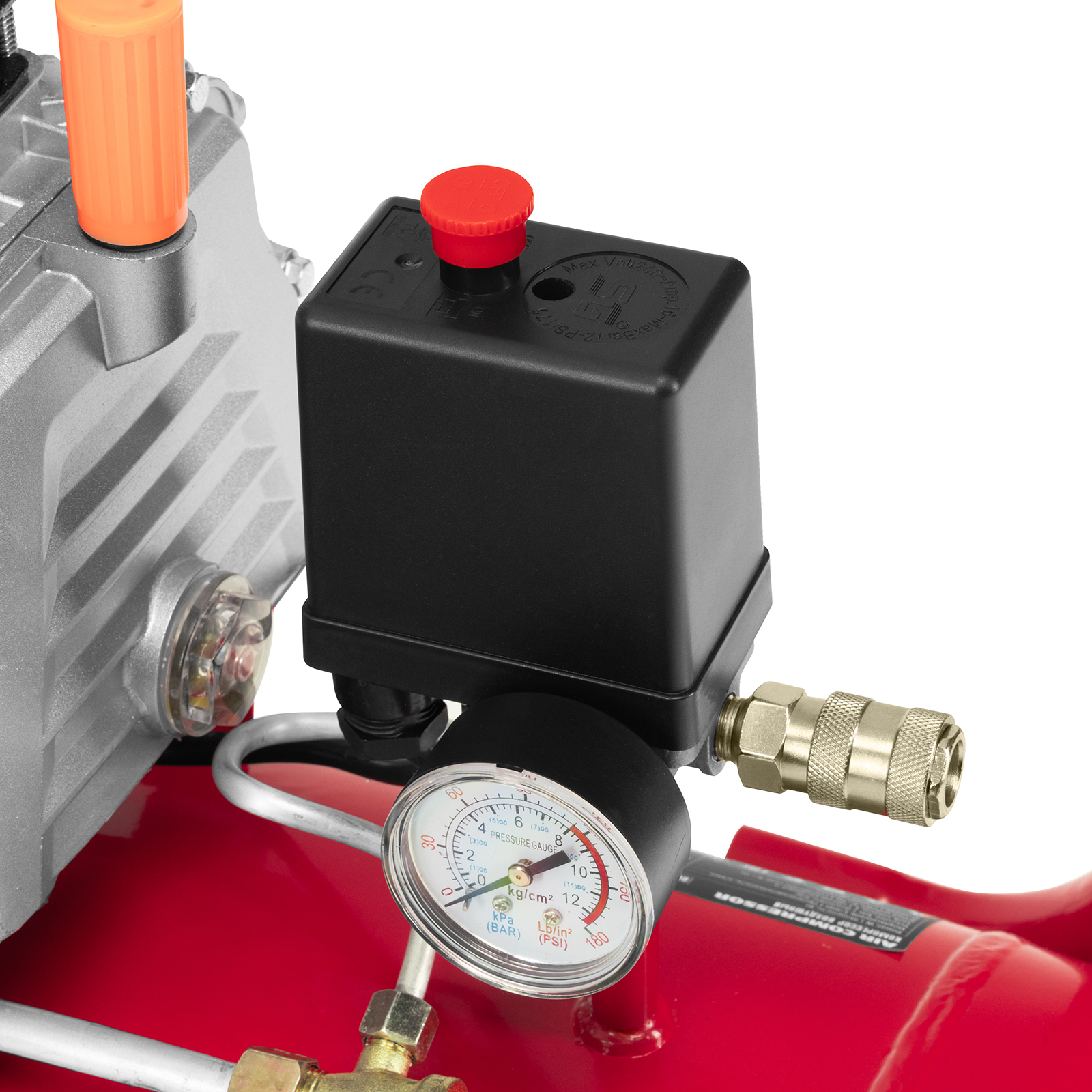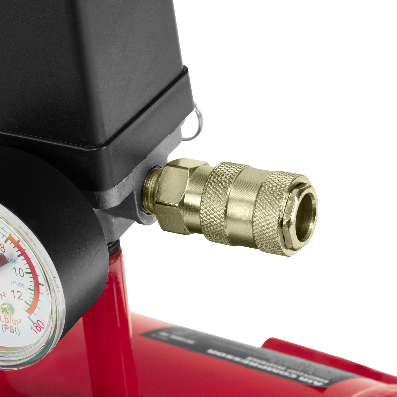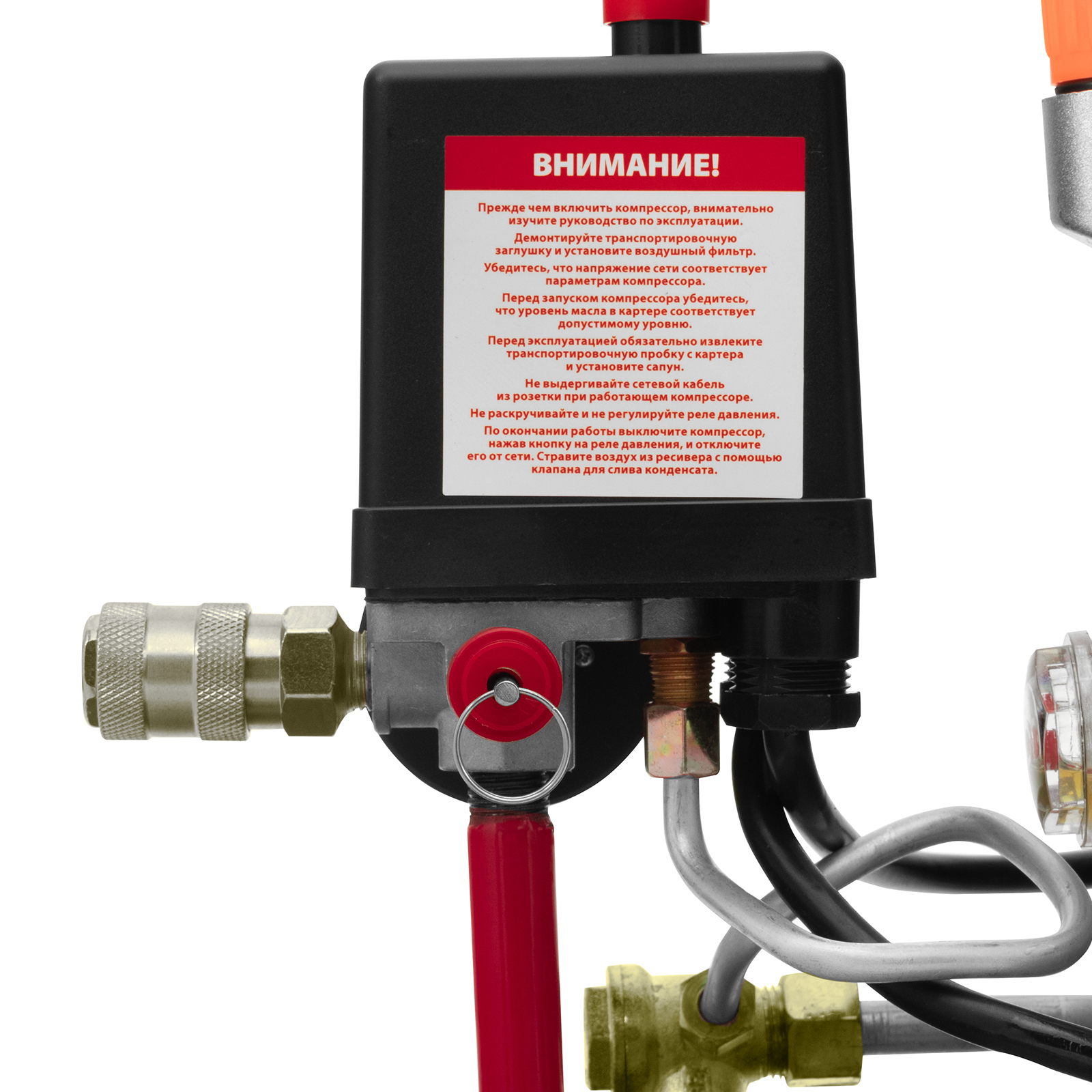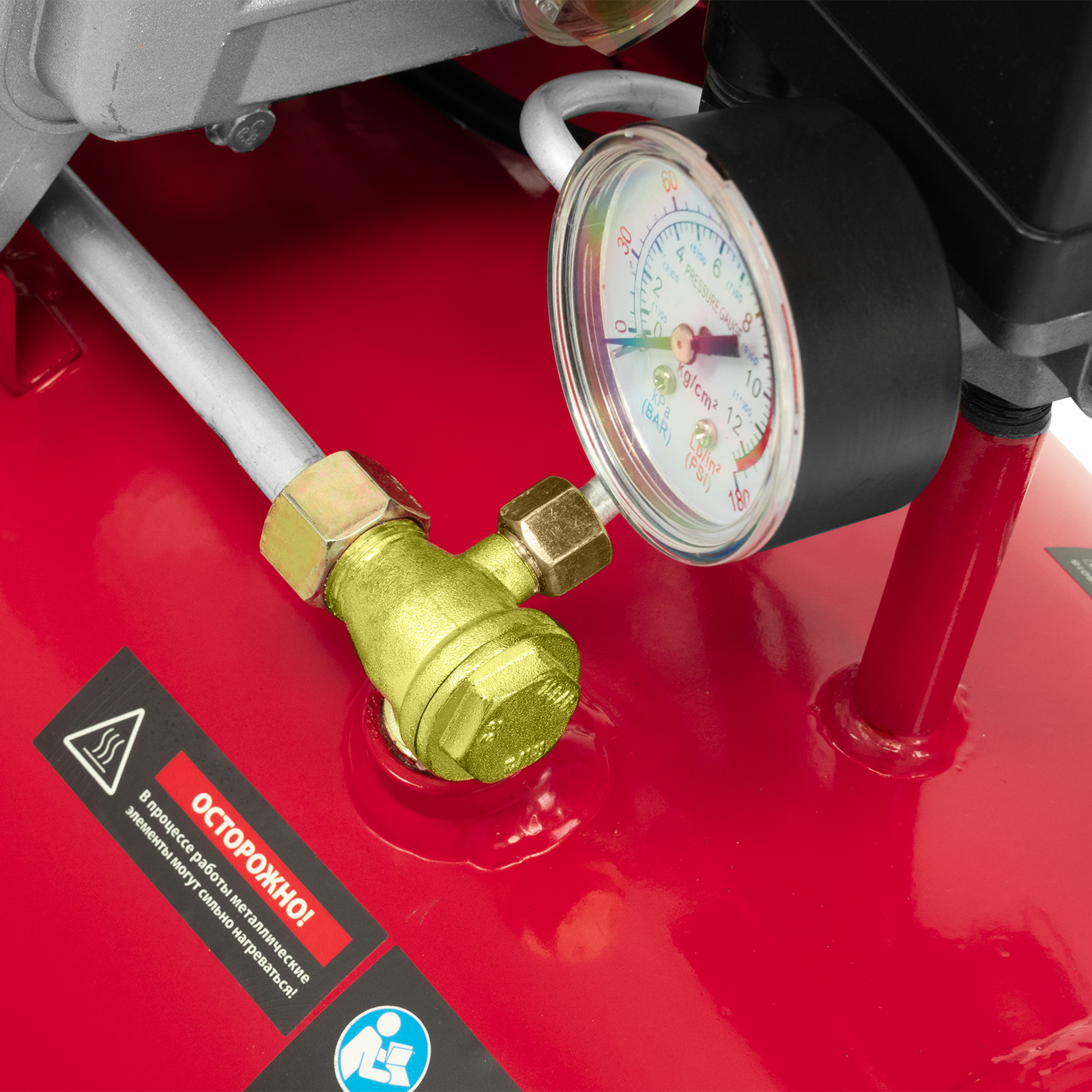 - Удобный контроль давления в ресивере — компрессор оснащен механическим манометром.