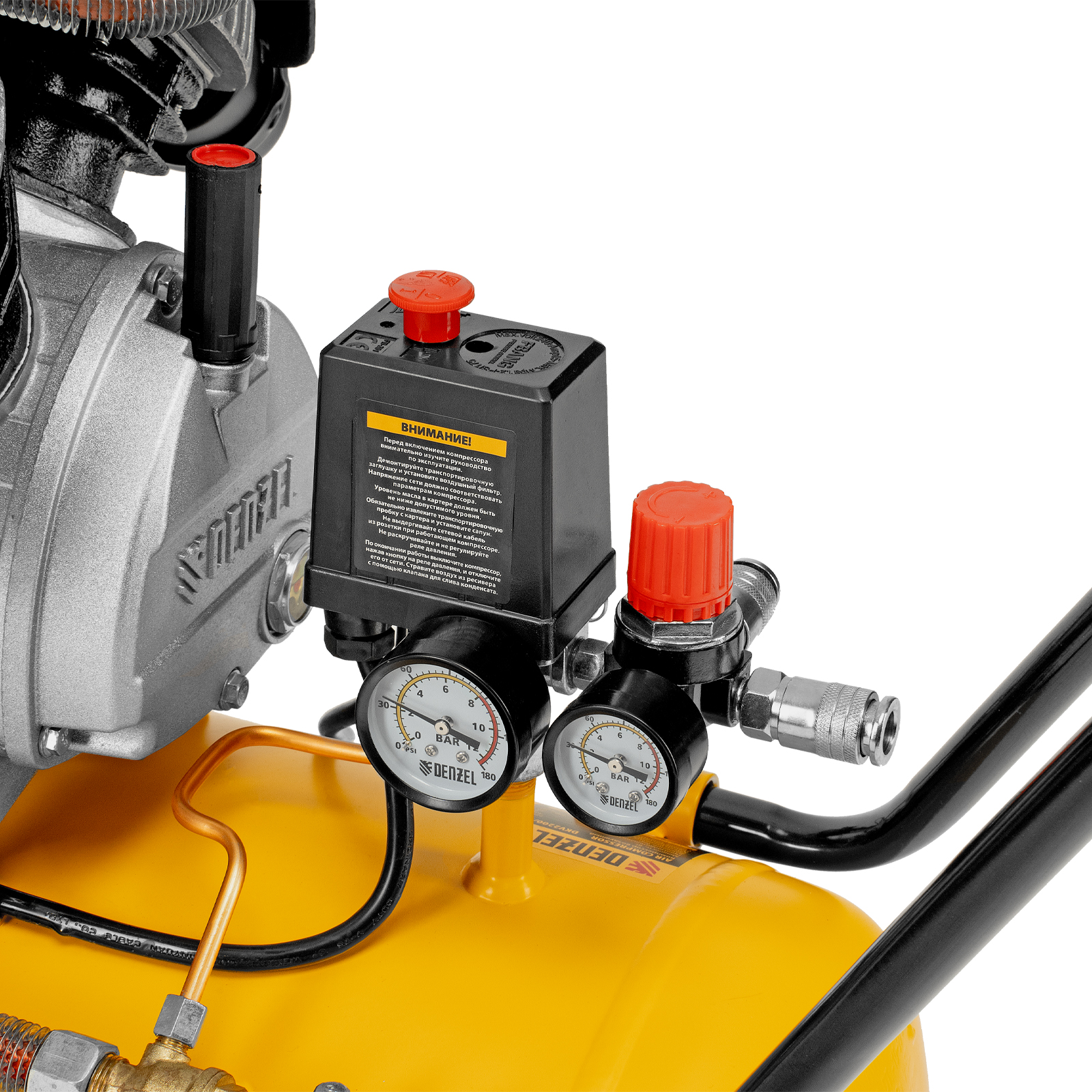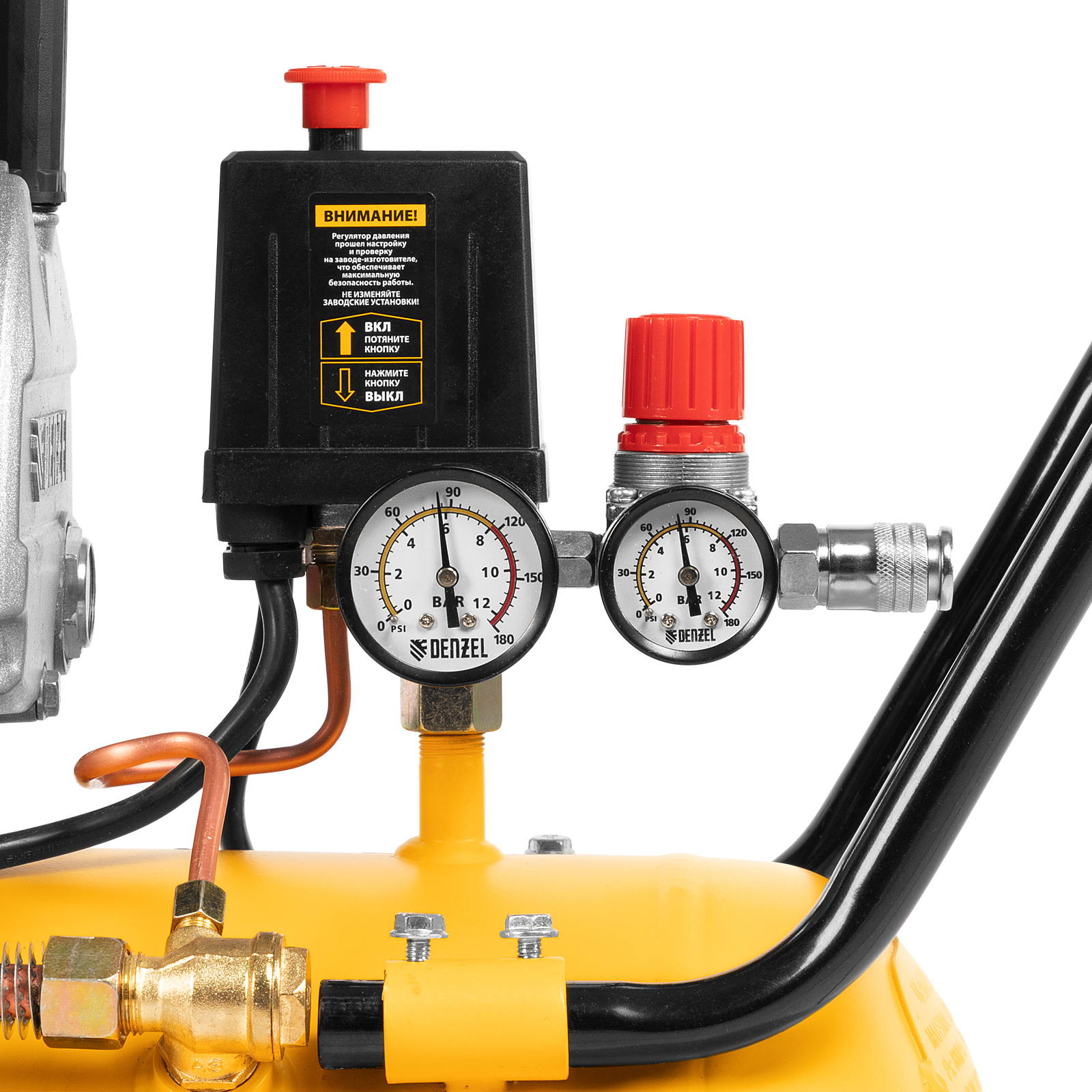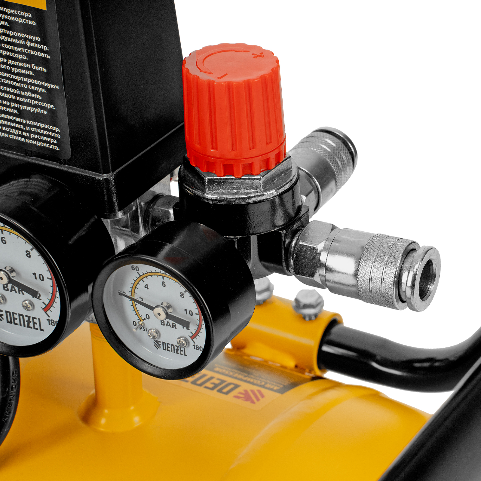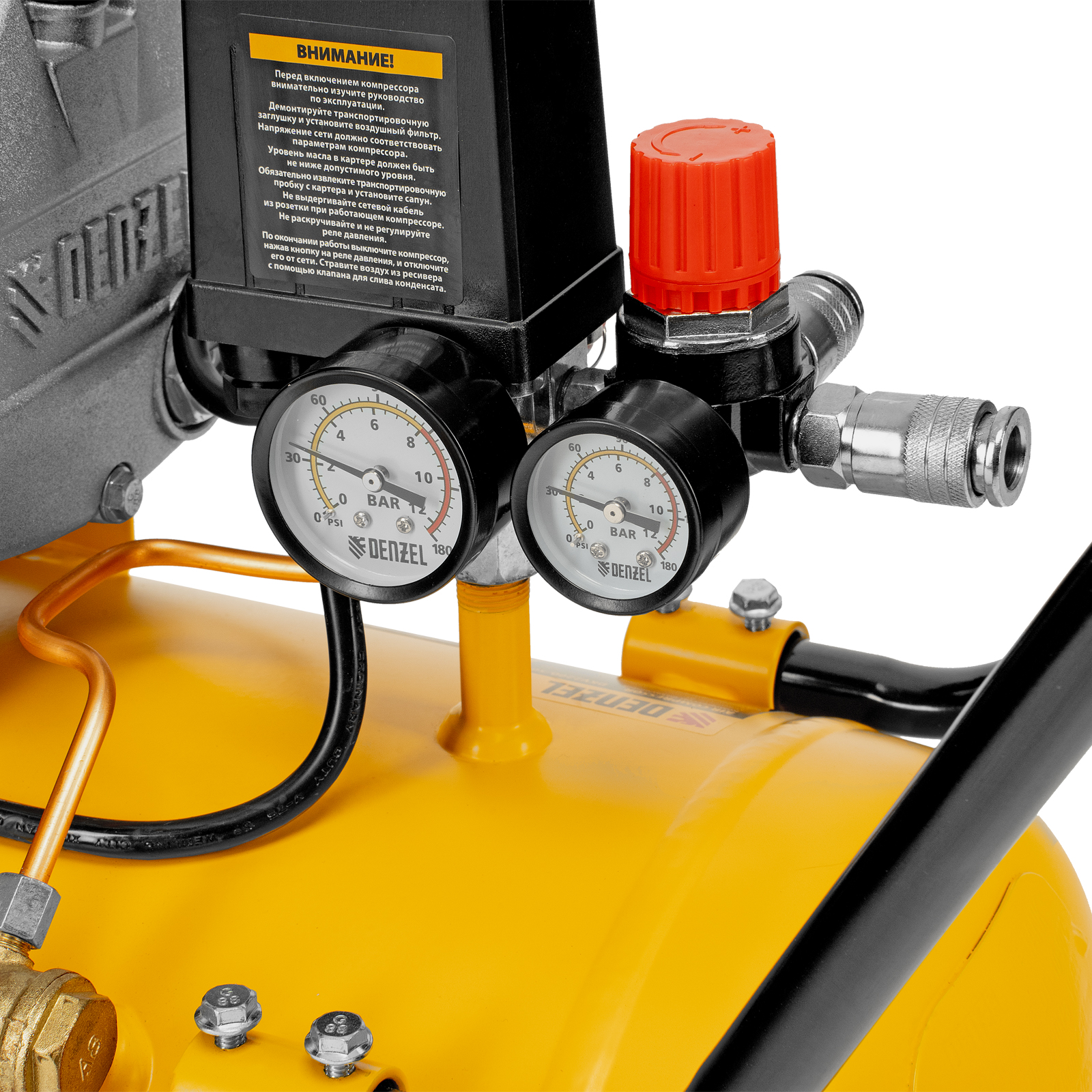- Контроль рабочих параметров — 2 манометра облегчают отслеживание давления в ресивере и пневмомагистрали.