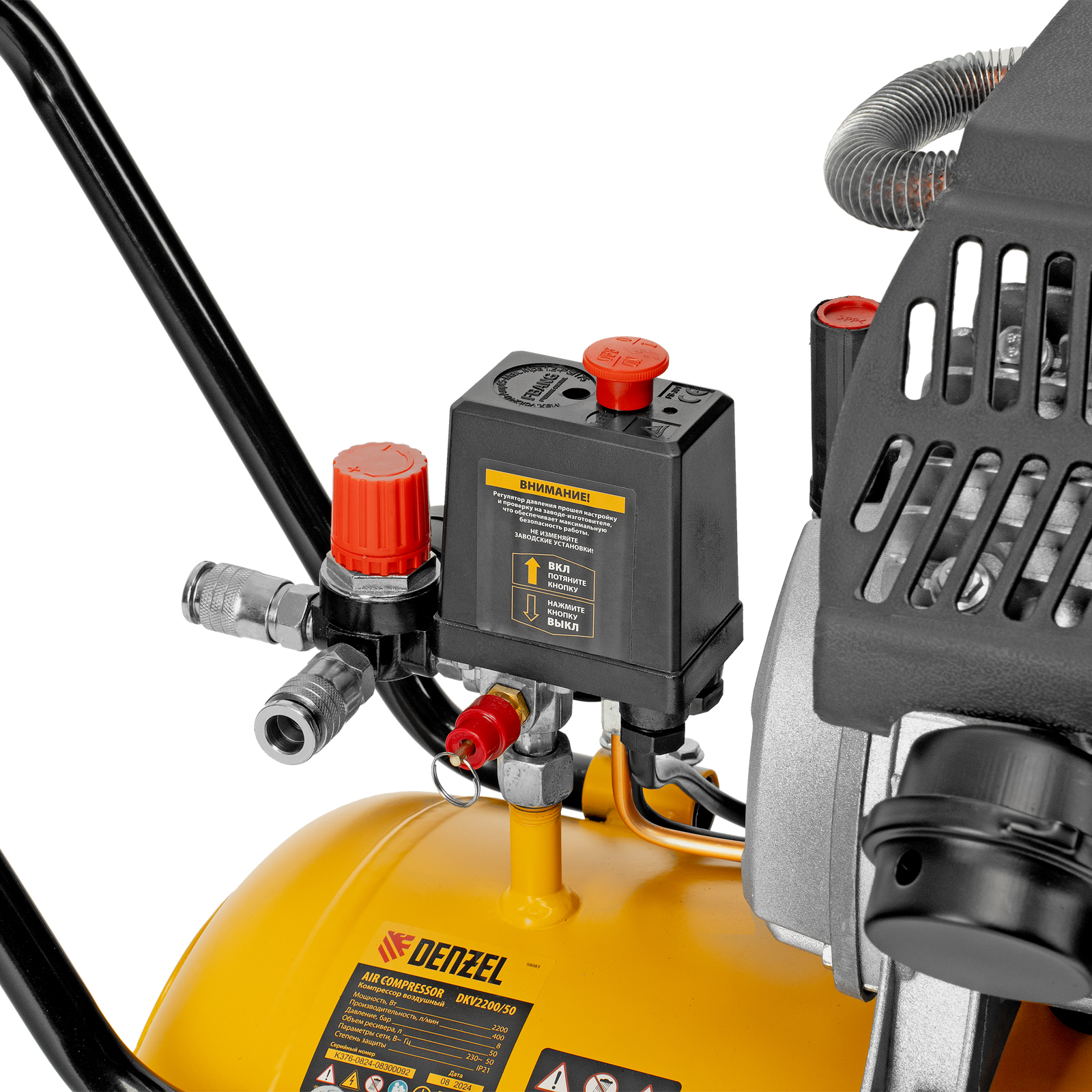 Воздушный компрессор Denzel DKV2200/50 Х-PRO 58083 мощностью 2,2 кВт, с объемом ресивера 50 л сжимает за минуту до 400 л воздуха и предназначен для применения в быту, на станции СТО и строительной площадке. Используется для обеспечения сжатым воздухом пневмоинструмента, например, пневмозубила, пневмогайковерта, пневмомолотка, пневмодрели. 2 евроконнектора позволяют подключить одновременно несколько инструментов для повышения эффективности работы.