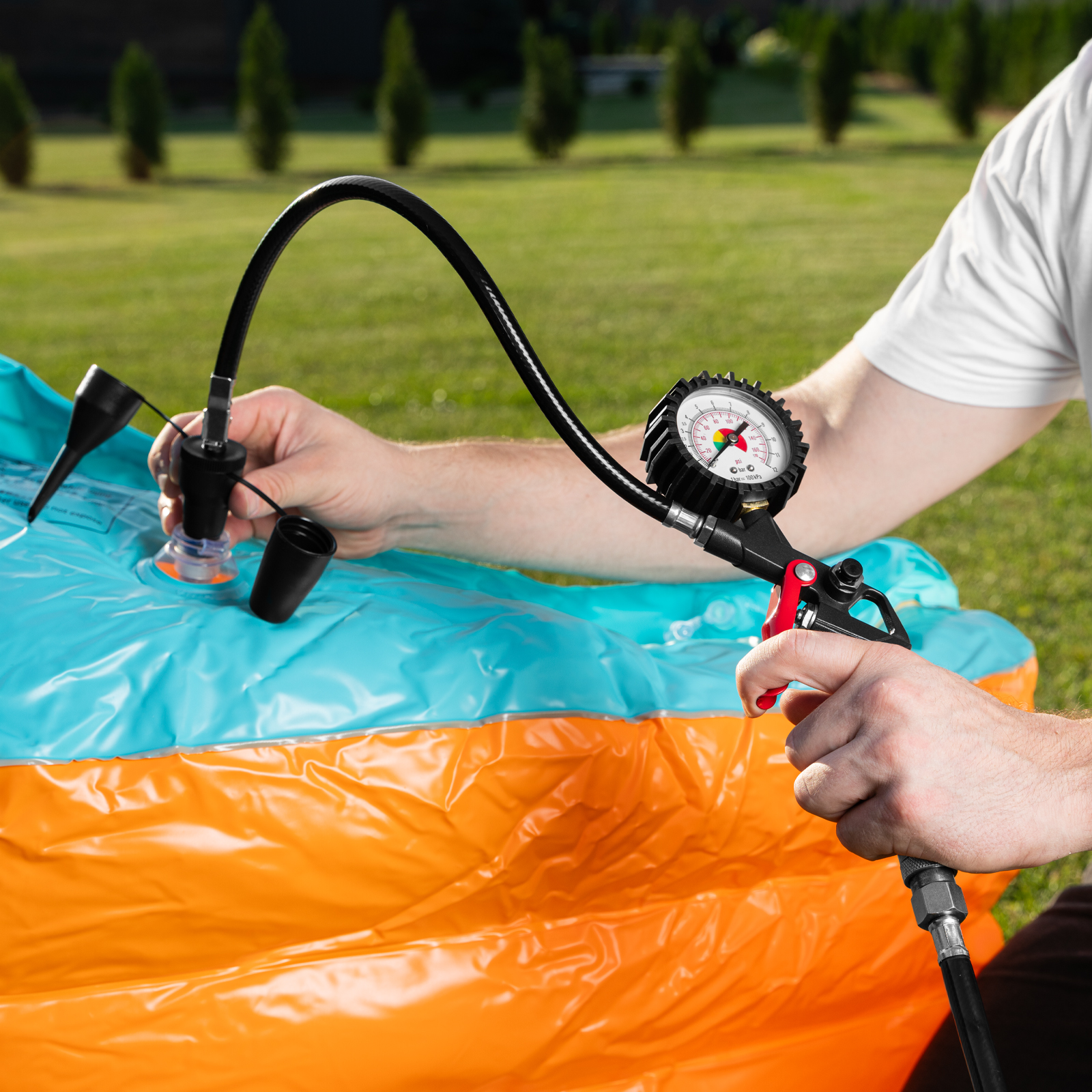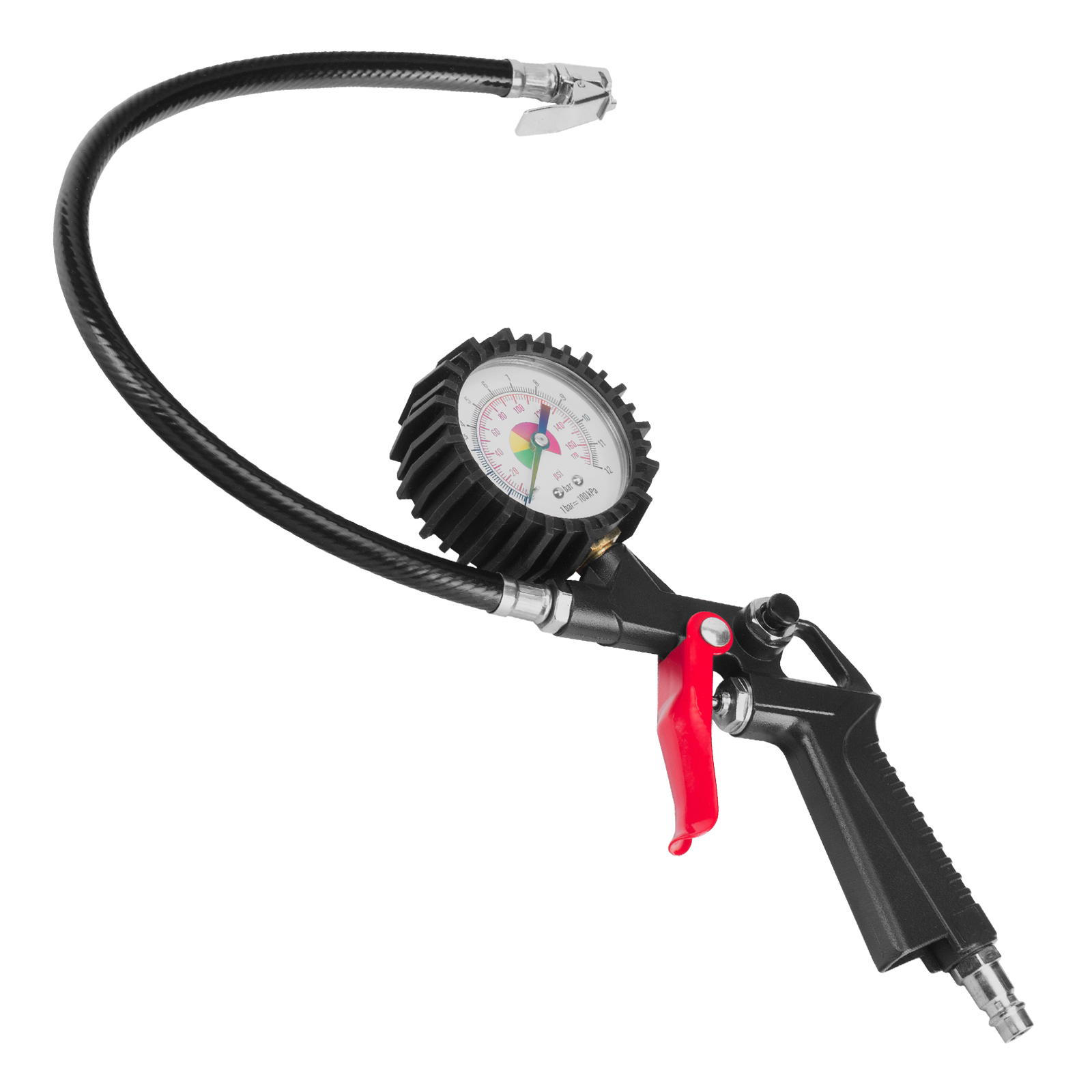 - Манометр пневмопистолета — несмотря на отсутствие ресивера, к которому обычно крепится измерительный прибор, контролировать давление сжатого воздуха можно по манометру, расположенному на корпусе пневмопистолета.