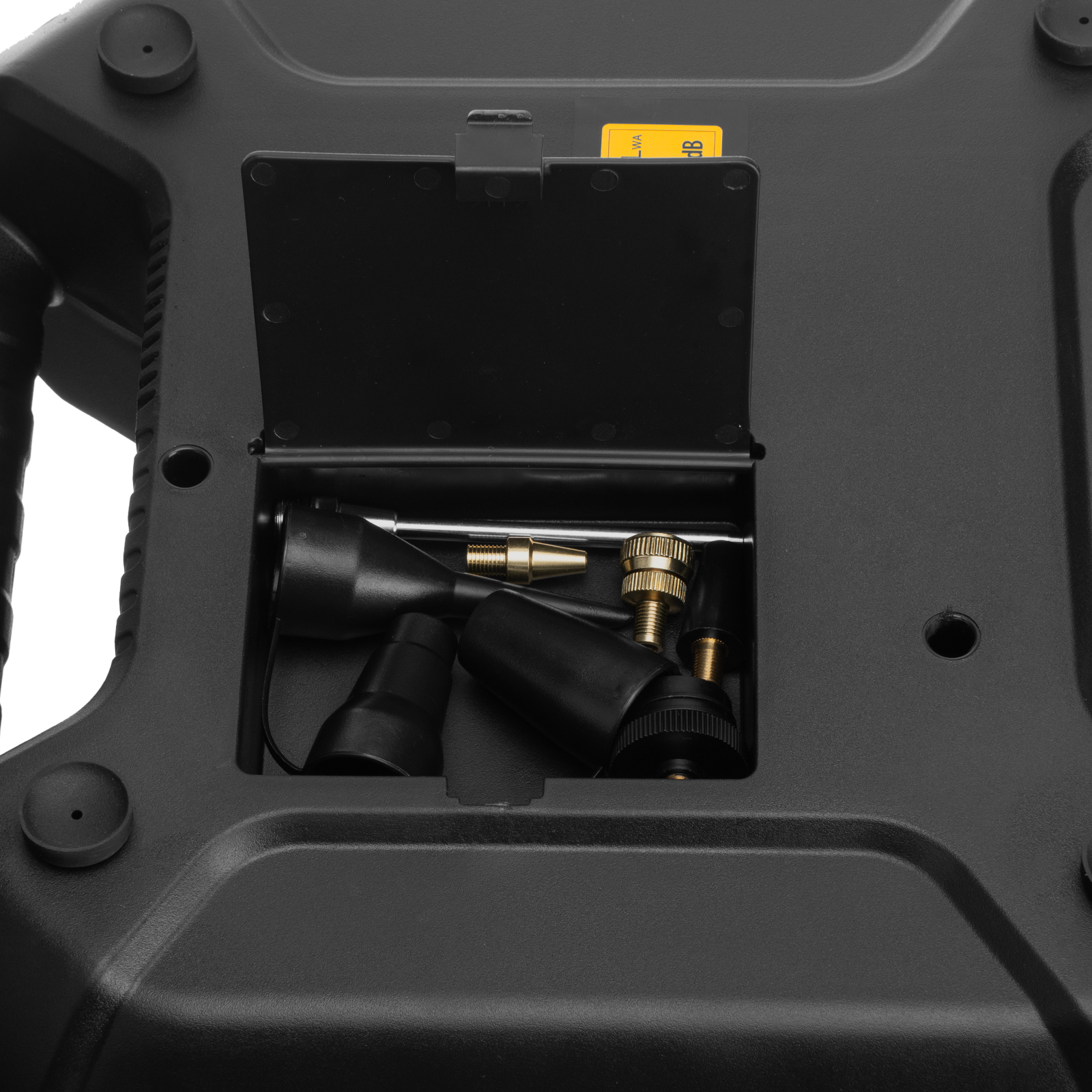 - Легкость перемещения — ребристая транспортировочная ручка делает переноску кейса-компрессора простой и удобной.