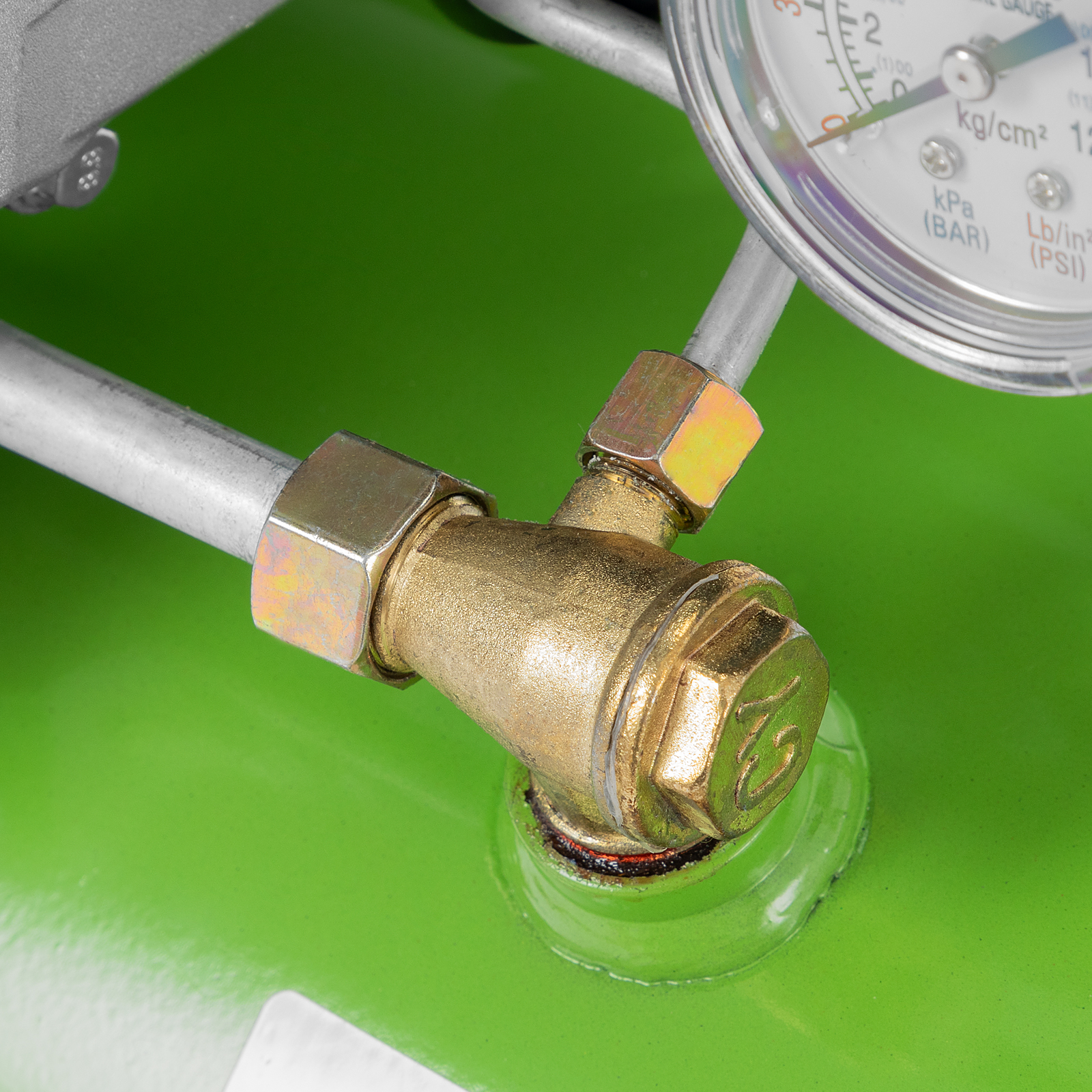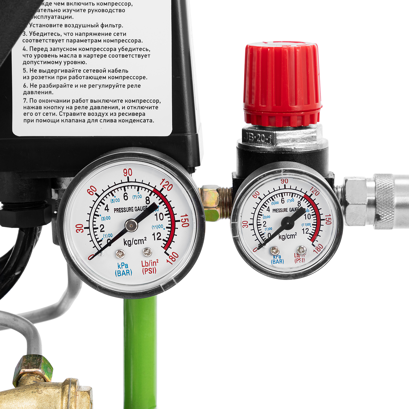 - 2 манометра: оператор может контролировать давление сжатого воздуха в ресивере и на выходе, и корректировать работу компрессора в зависимости от показаний.