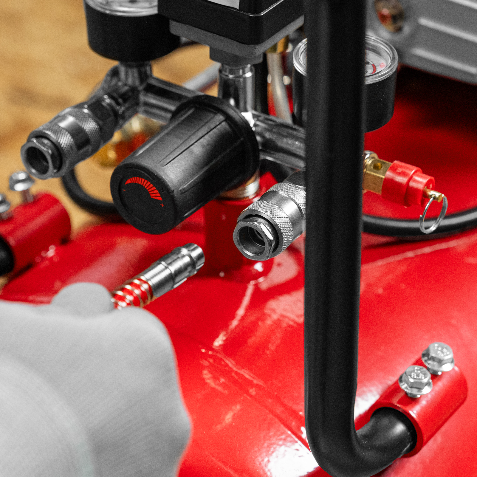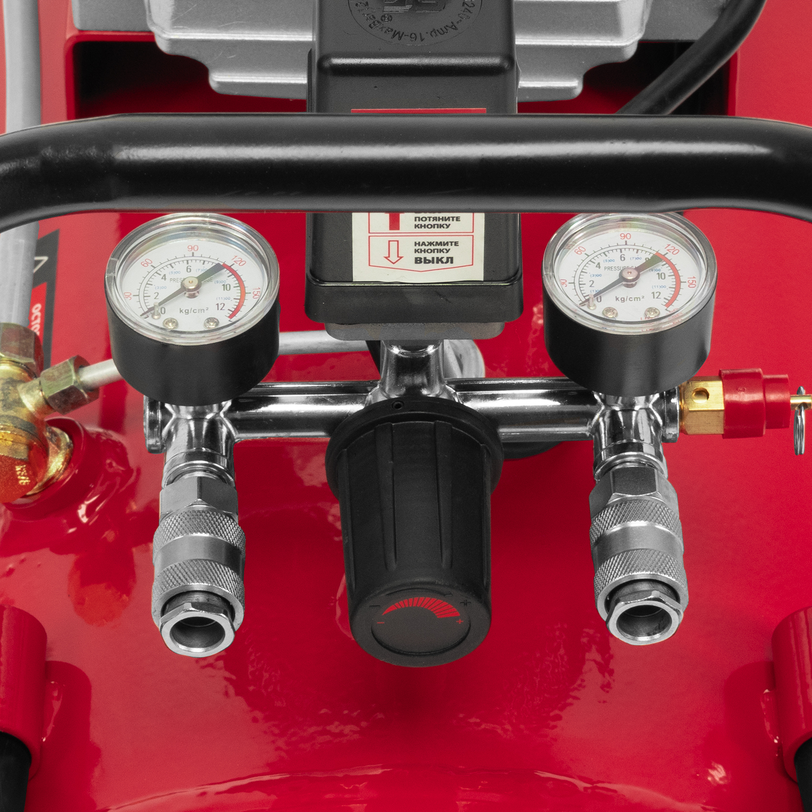 - Удобный контроль рабочих параметров — 2 манометра и регулятор позволяют отслеживать и корректировать давление для корректной работы пневмоинструмента.