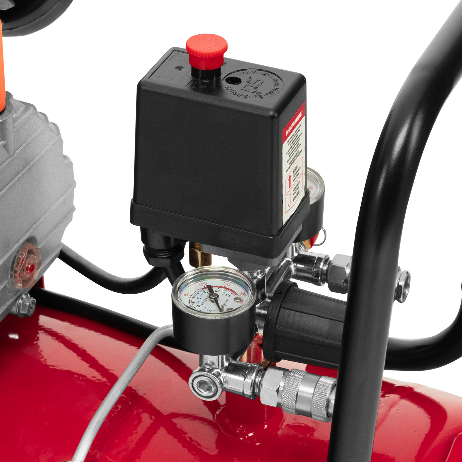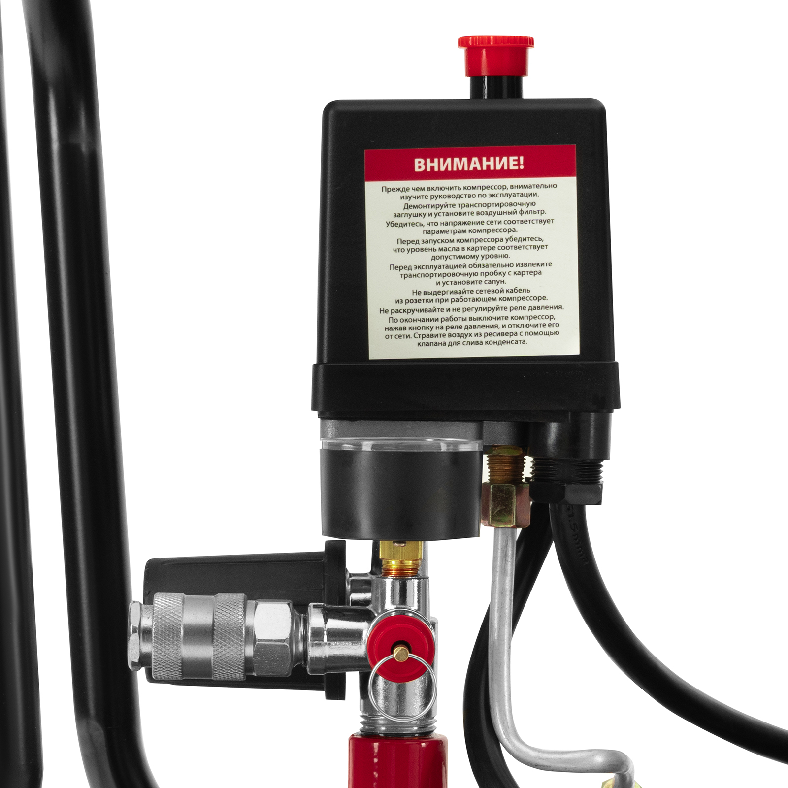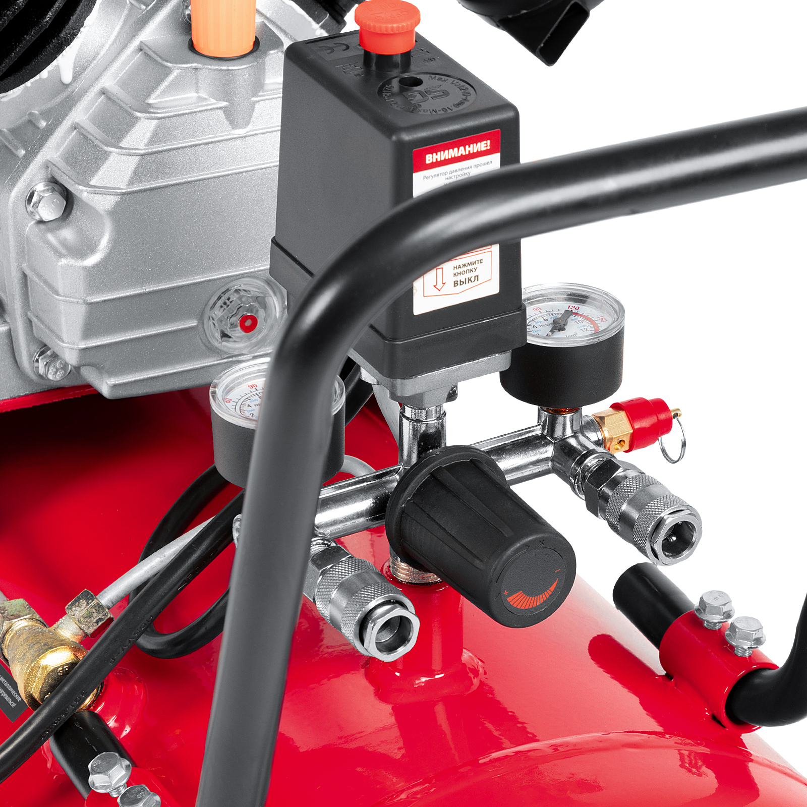 - Автономная работа — прессостат обеспечивает автоматическую остановку двигателя по достижении максимального рабочего давления и запуск при падении давления до минимального уровня.