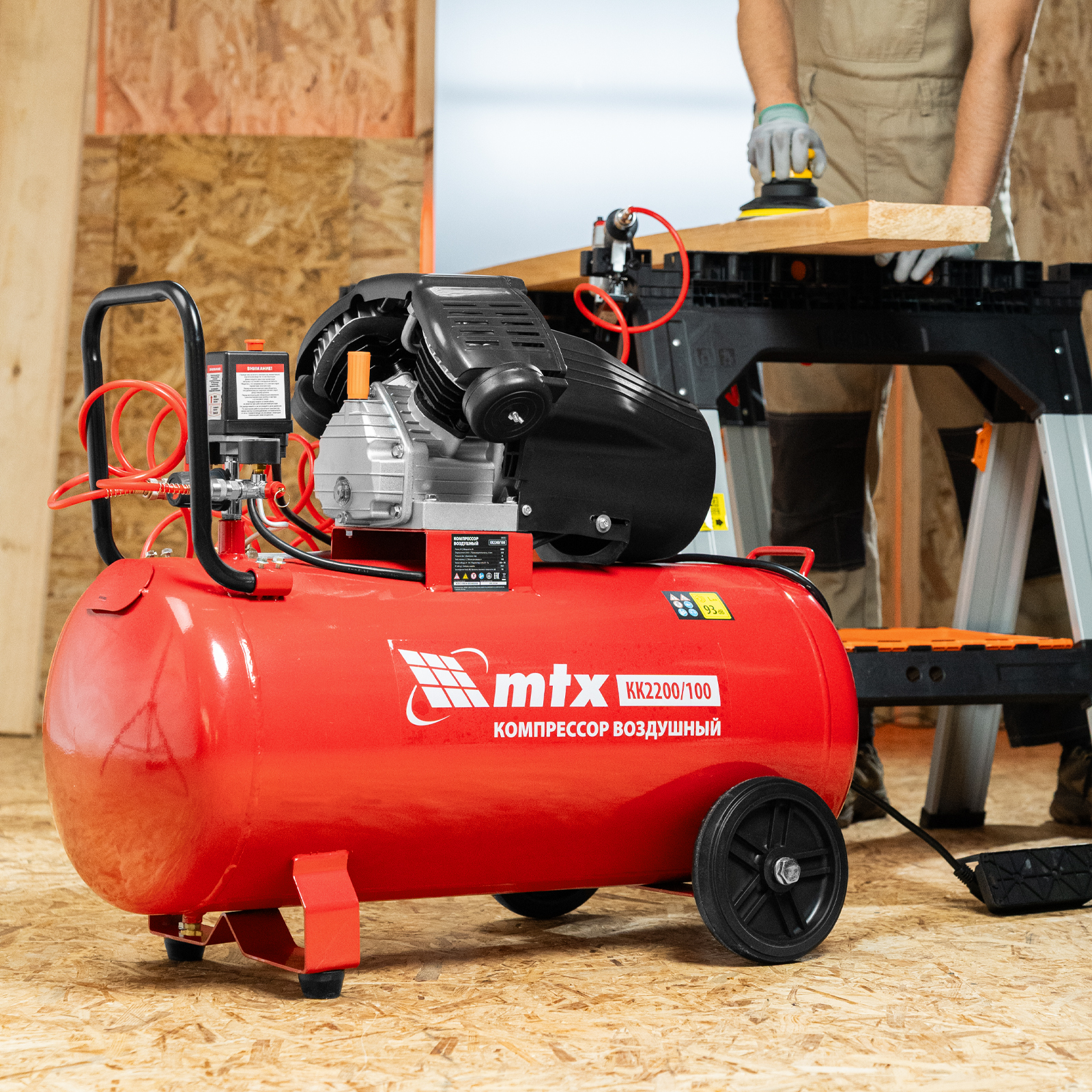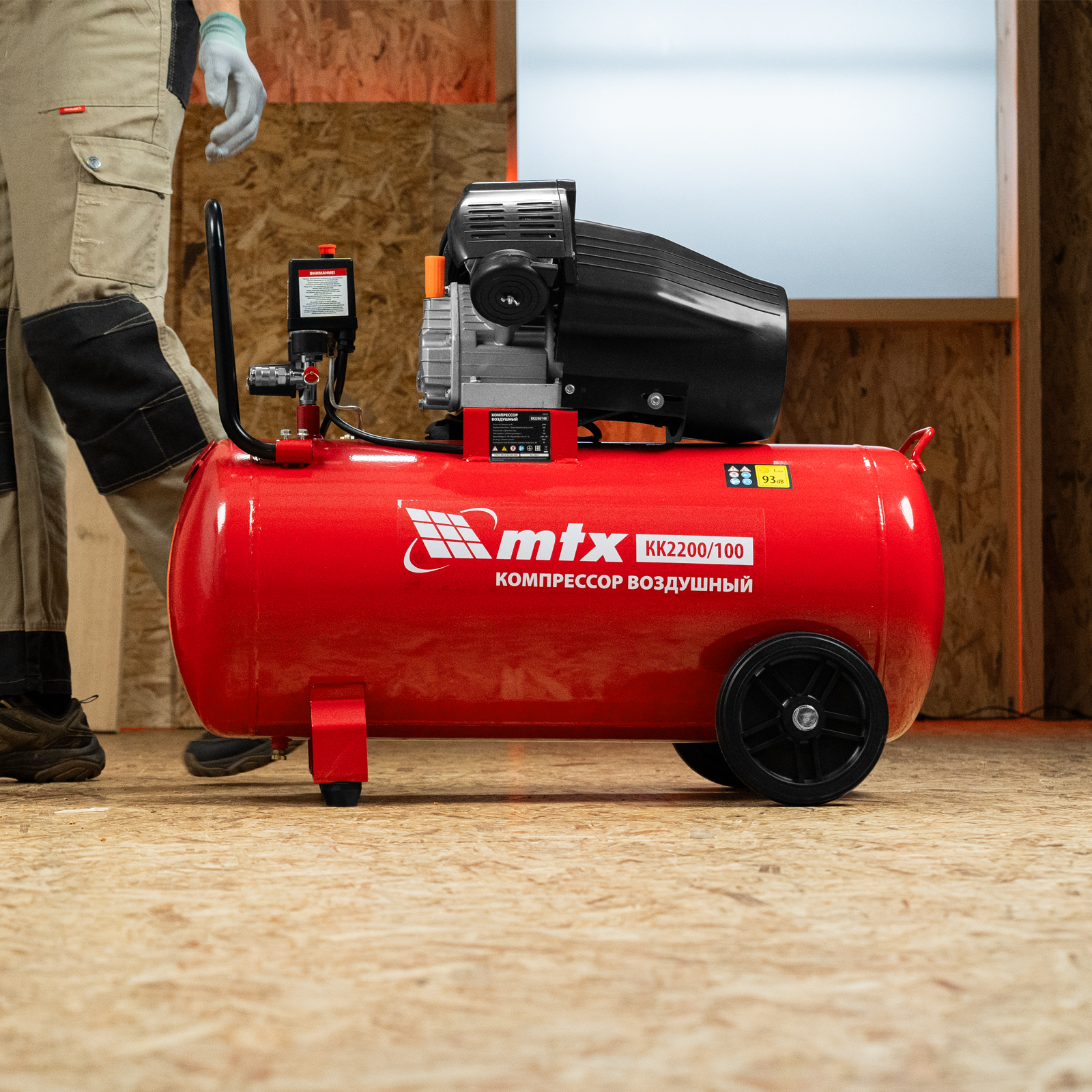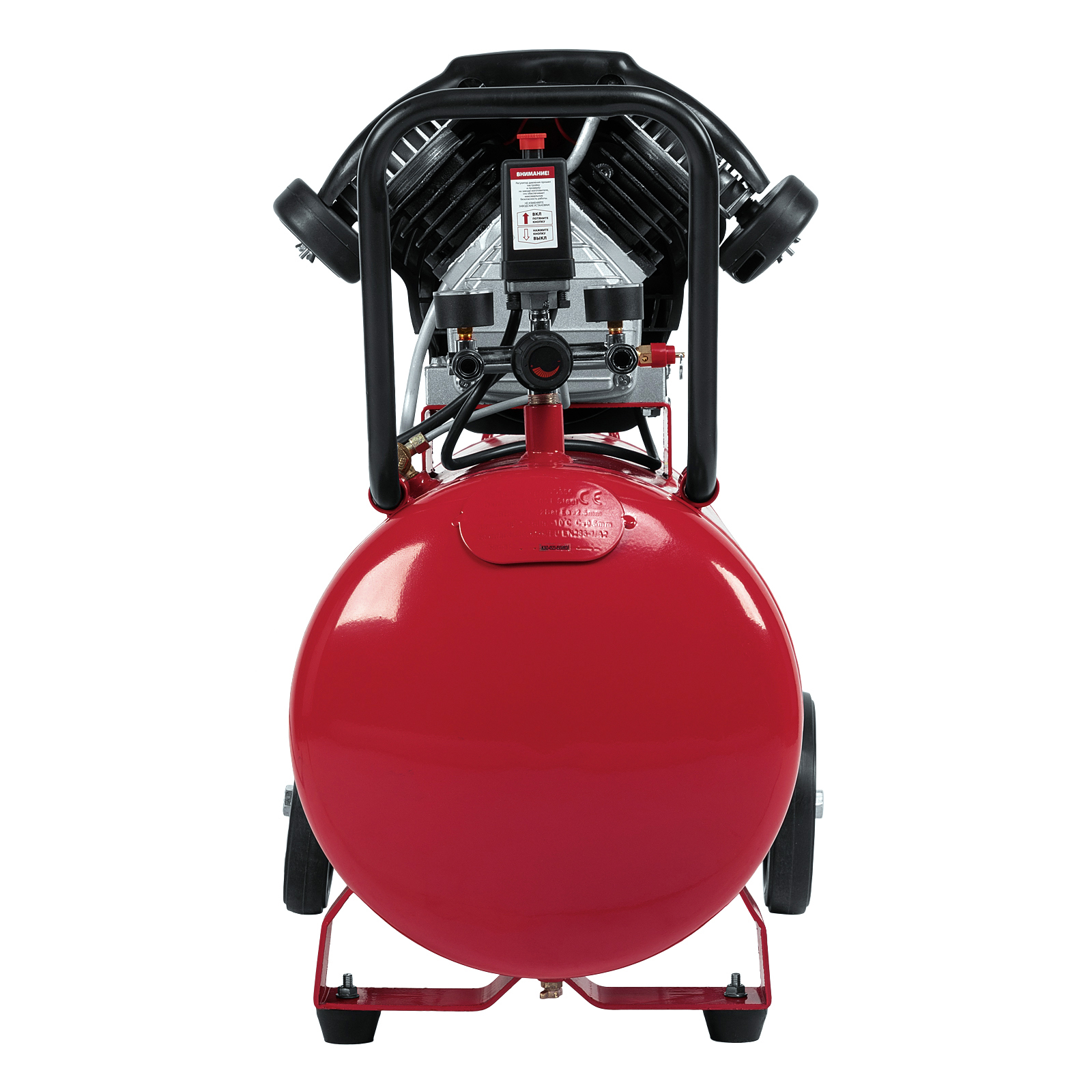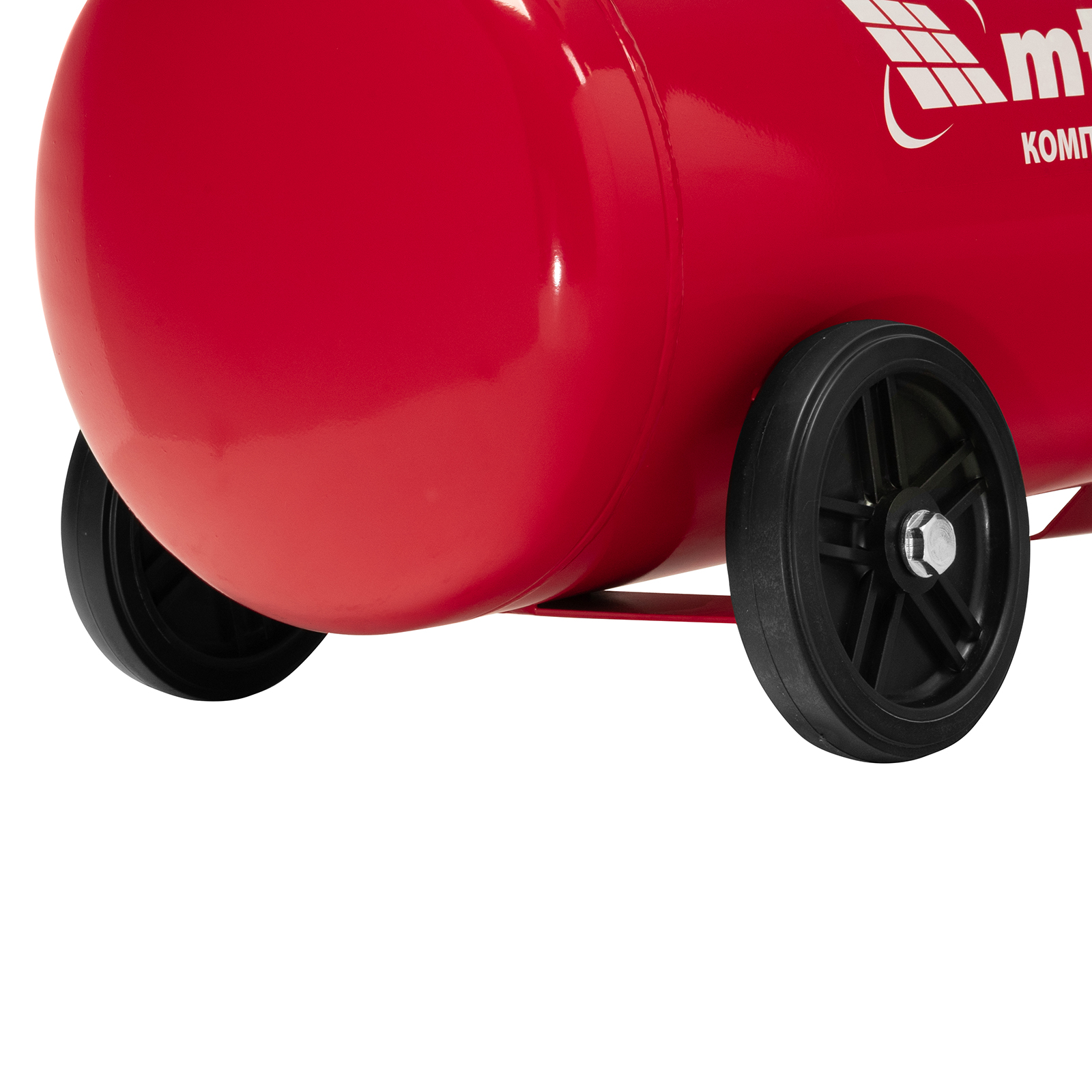 - Мобильность — благодаря колесам и рукоятке компрессор удобно разворачивать и перемещать по рабочей площадке.