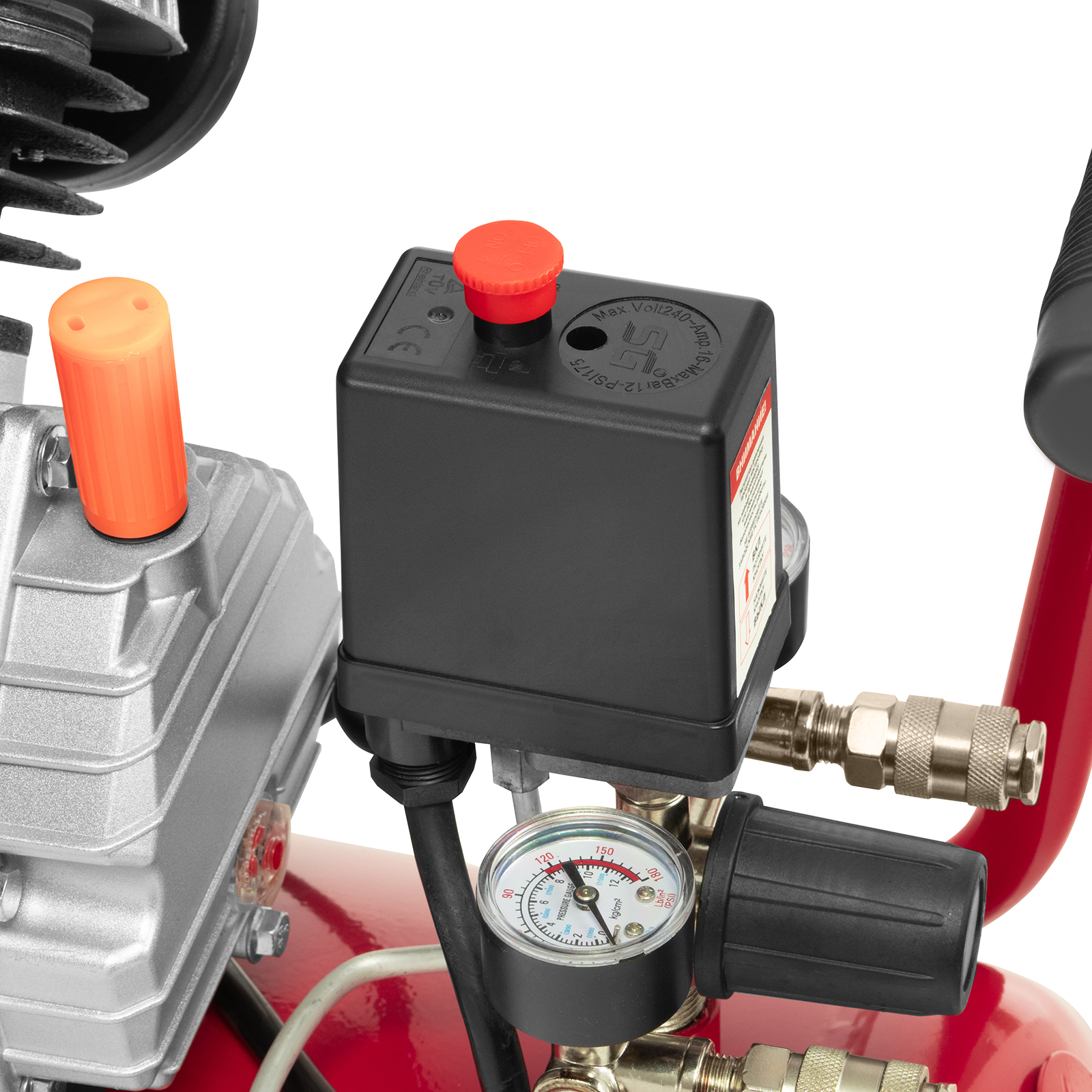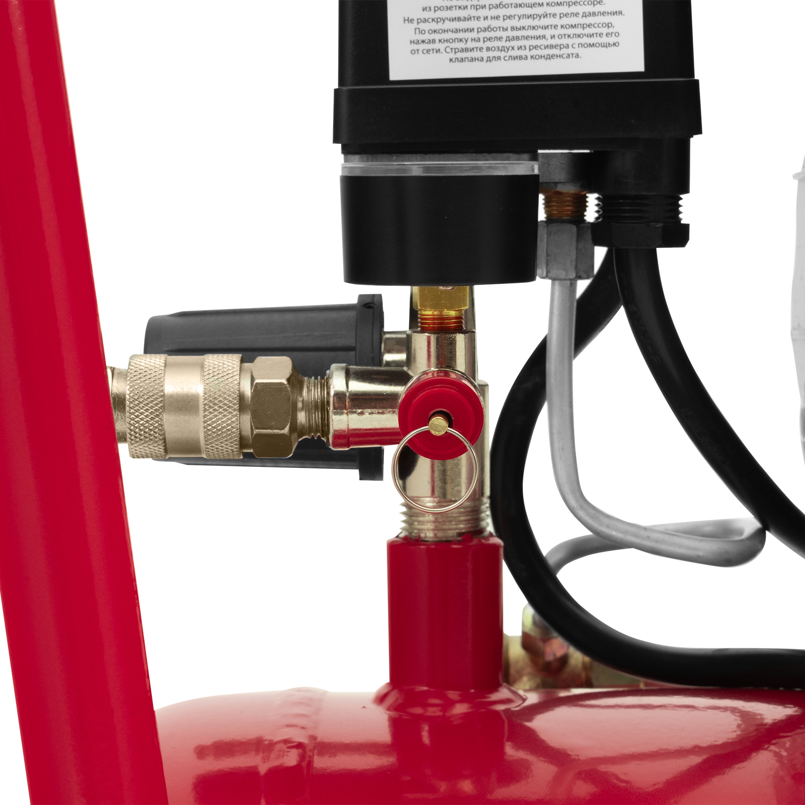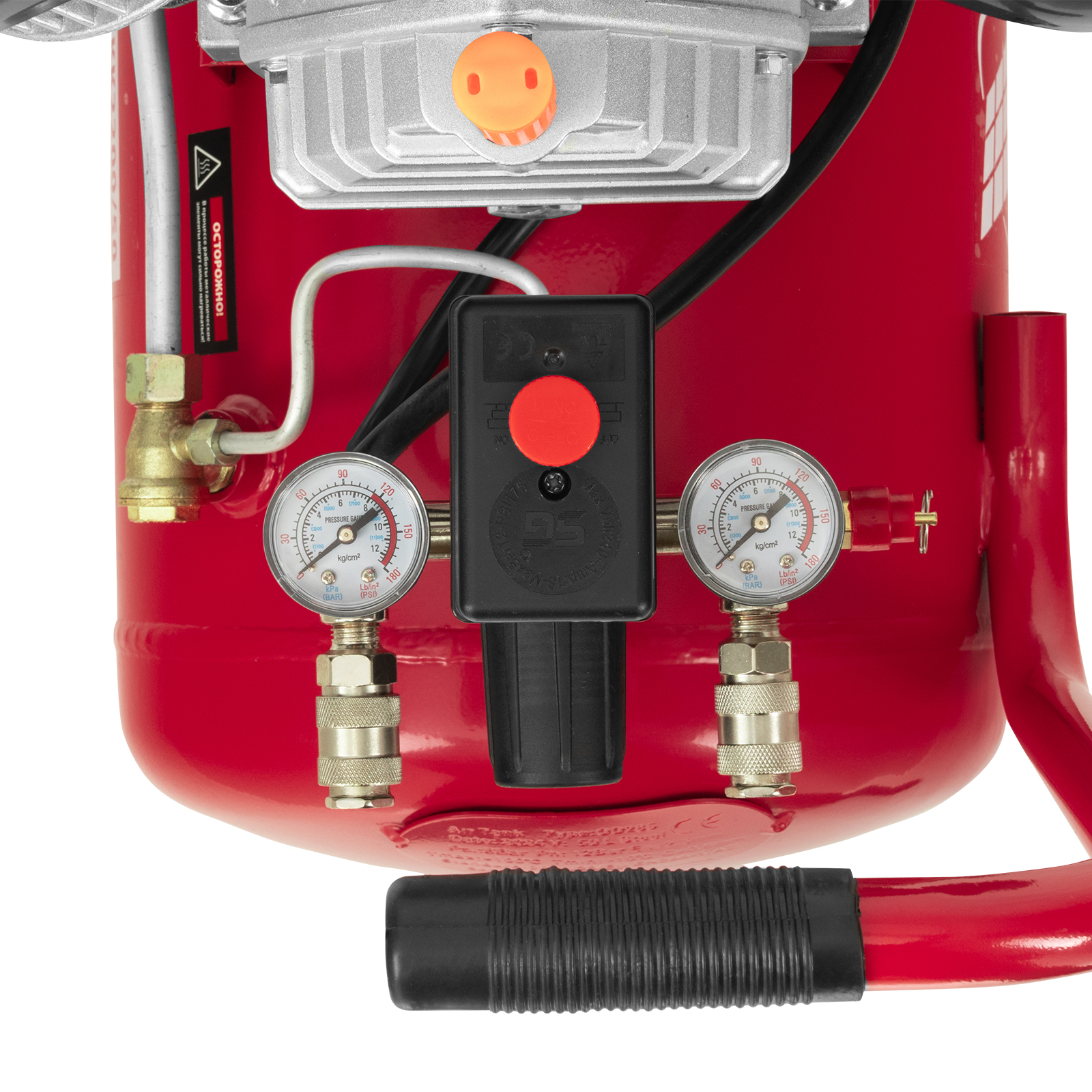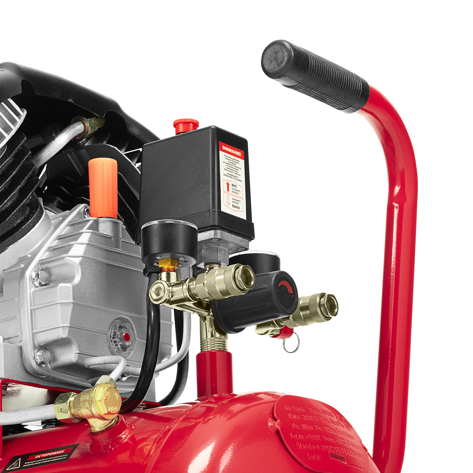 - Автономная работа — прессостат обеспечивает автоматическую остановку двигателя по достижении максимального рабочего давления и запуск при падении давления до минимального уровня.