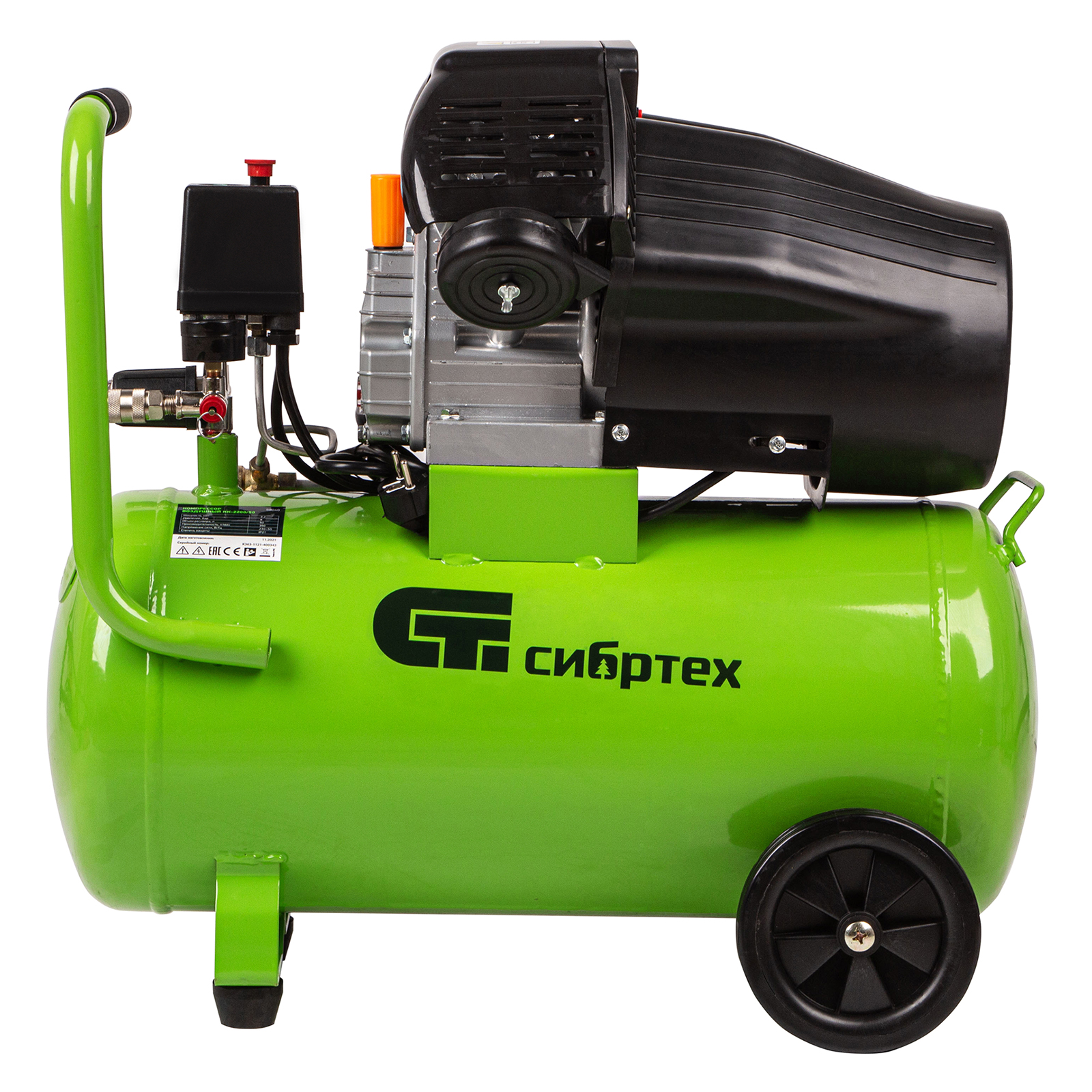 Универсальный передвижной компрессор идеально впишется в бытовые условия, автосервис, гараж, строительную площадку, небольшое производство. Его подключают к пневмоинструментам, например, к гайковерту или продувочному пистолету.,Устройство способно выработать за 1 час 350 л сжатого воздуха. Показатель мощности увеличен до 2.2 кВт, а объем ресивера составляет 50 литров. Двухцилиндровая компоновка, увеличенный магнитопровод статора и автоматизированная намотка двигателя позволили увеличить производительную мощность и достичь высокого рабочего потенциала.,Производитель предусмотрел систему защиты двигателя. Кожух из прочного пластика препятствует попаданию пыли и посторонних частиц в основной узел, сохраняет его от поломок. Системы защиты по току и от перегрева автоматически отключает систему при скачках напряжения и превышении нормальной температуры двигателя.,Еще одно преимущество компрессора — дополнительная обработка картера, которая обеспечивает плотное прилегание прокладок и защиту от протечек масла.