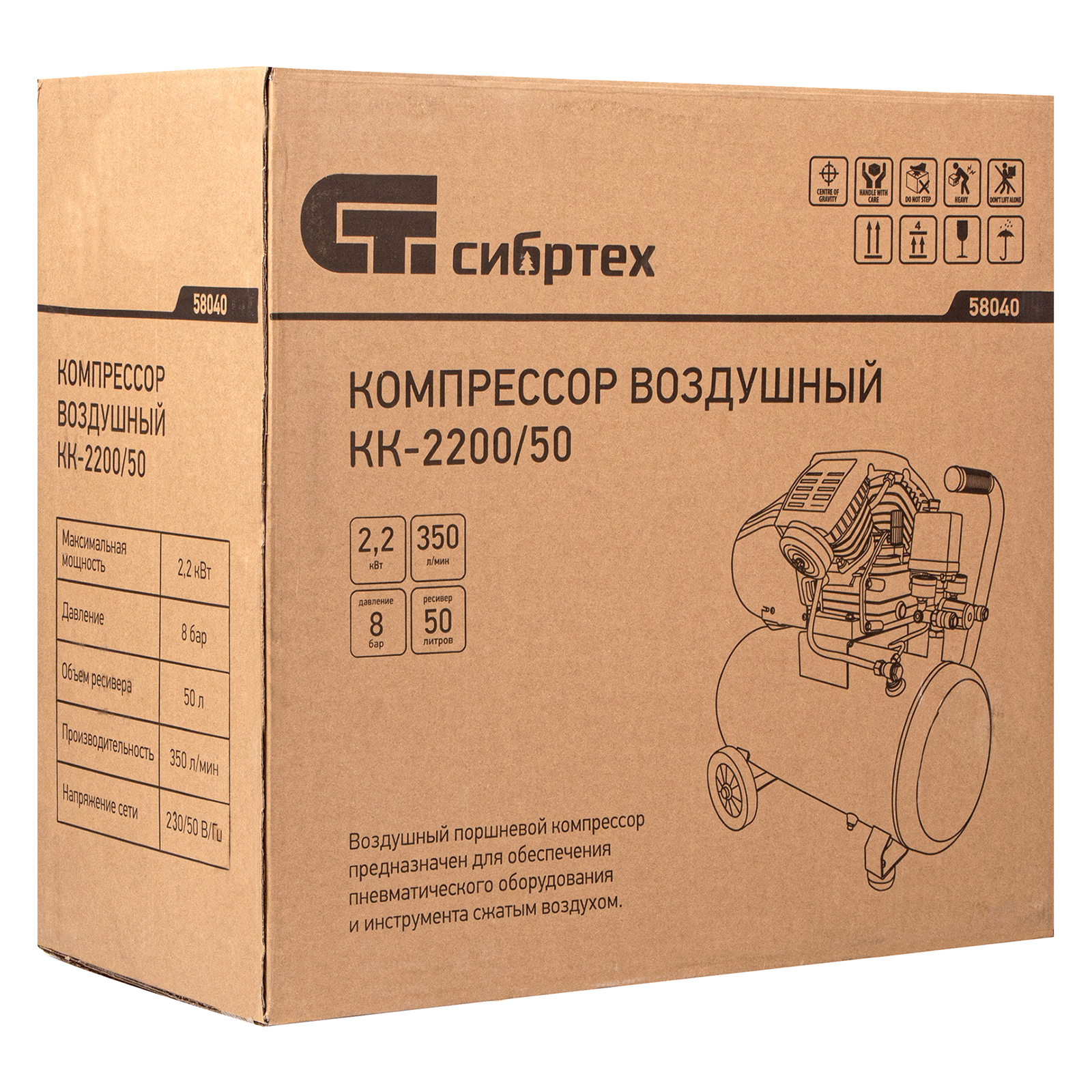 Компрессор воздушный КК-2200/50, 2.2 кВт, 350 л/мин, 50 л, прямой привод, масляный Сибртех в Краснодаре