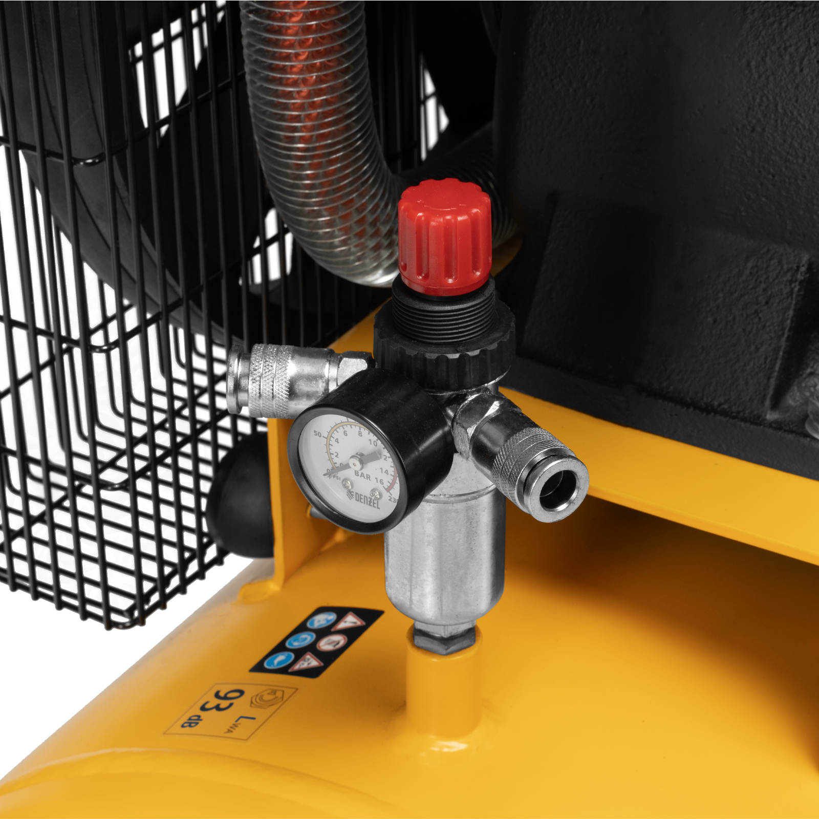 - Удобный контроль давления в ресивере и пневмомагистрали — компрессор оснащен двумя механическими манометрами.