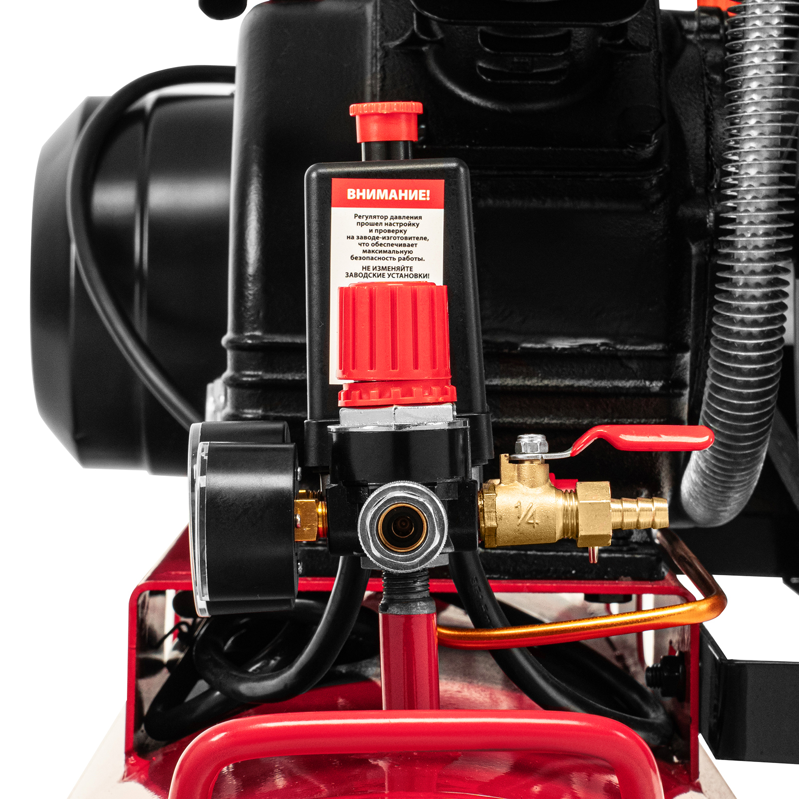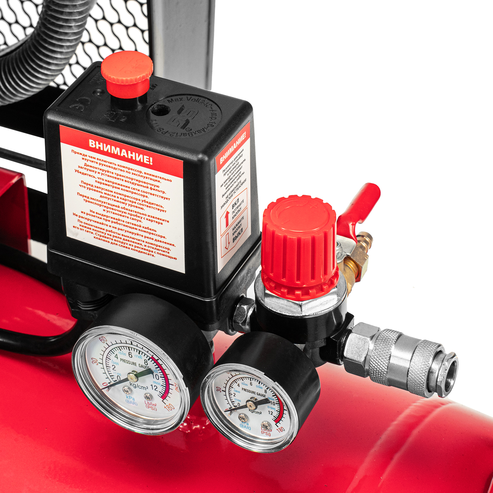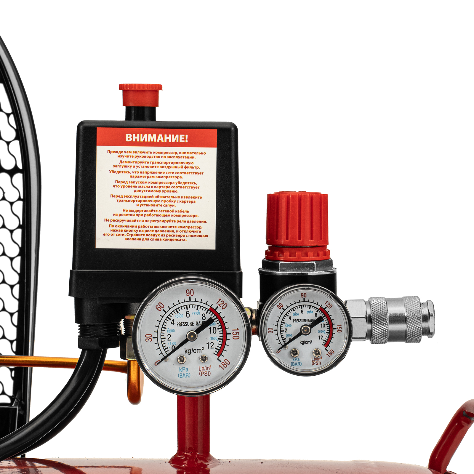 - Автоматическая регулировка производительности — прессостат останавливает двигатель при достижении максимального рабочего давления (8 бар) и запускает его при падении давления ниже минимально допустимого уровня.