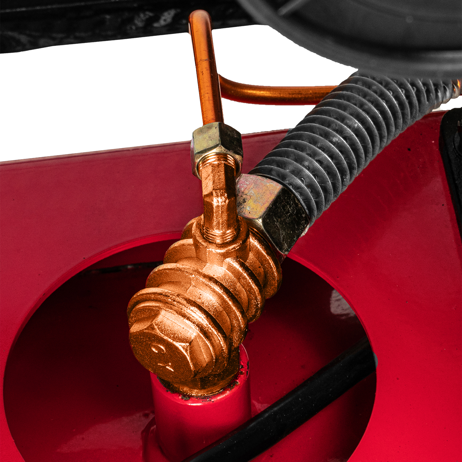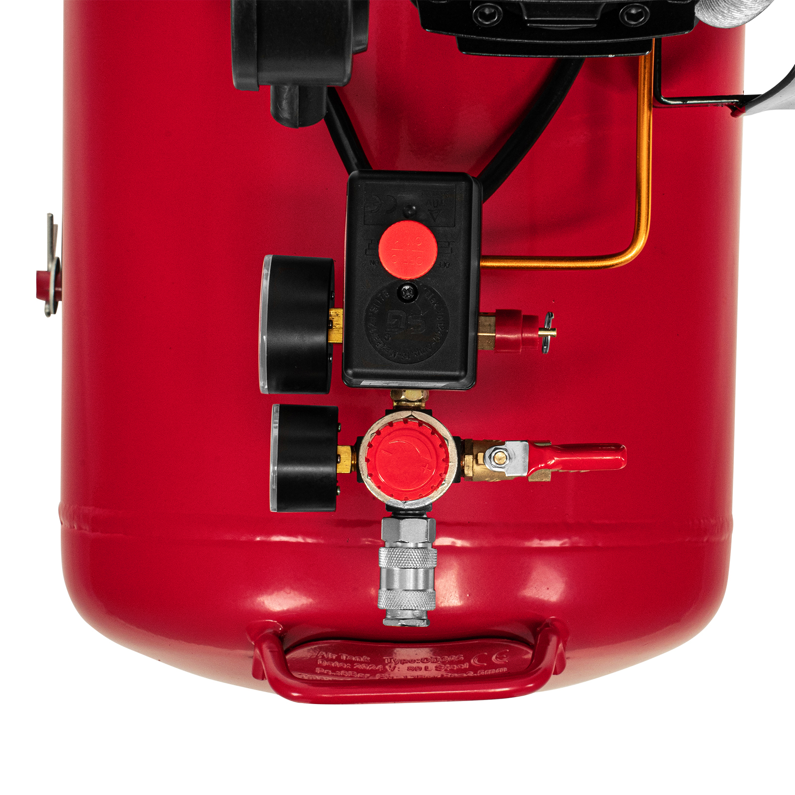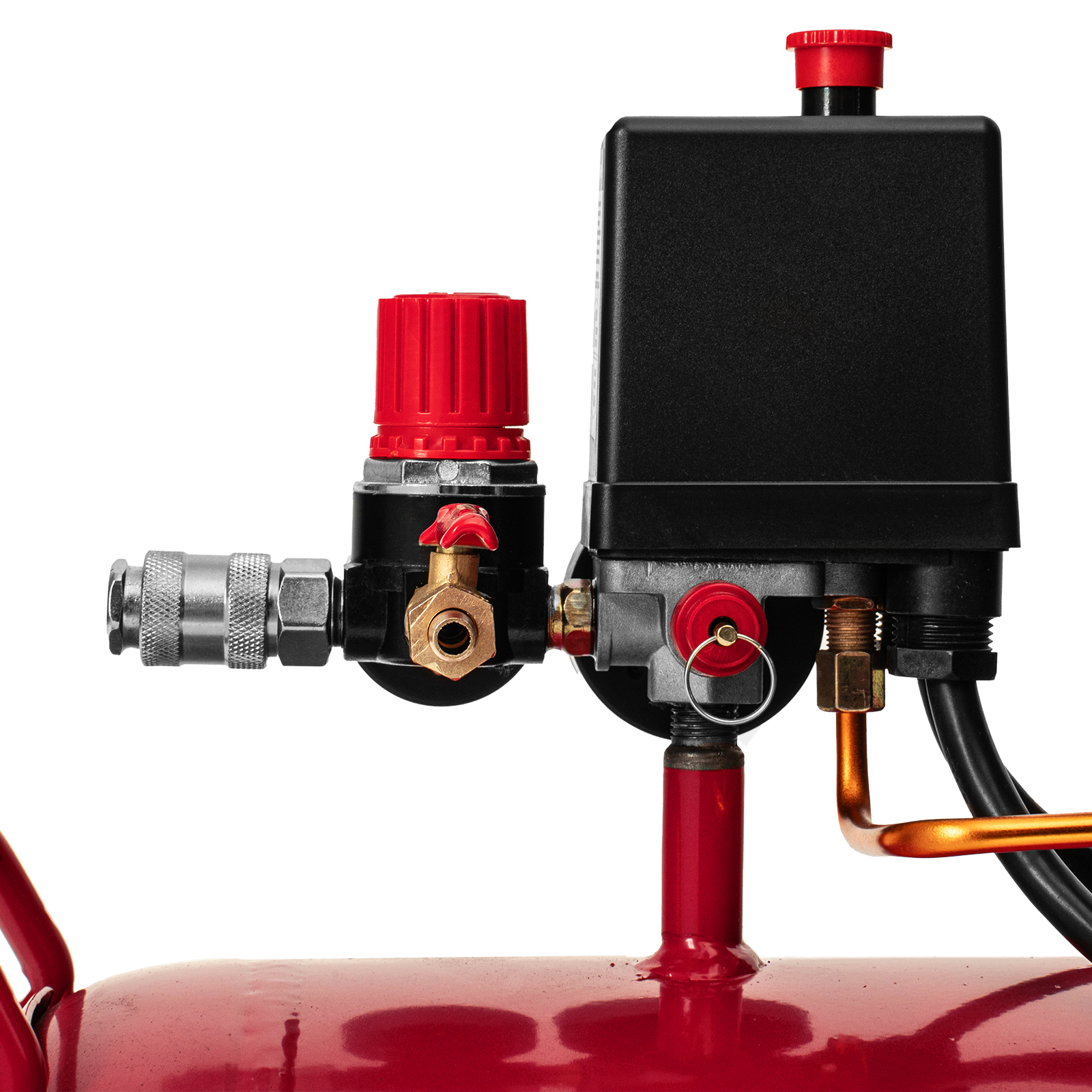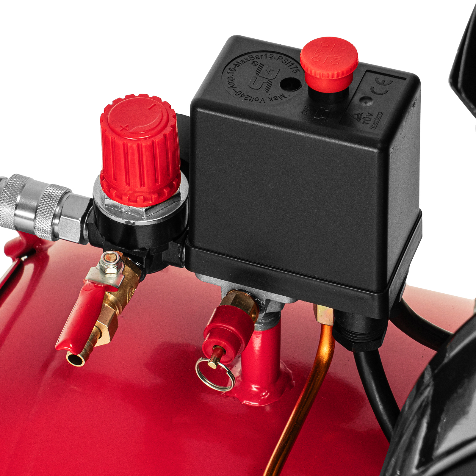 - Автоматическая регулировка производительности — прессостат останавливает двигатель при достижении максимального рабочего давления (8 бар) и запускает его при падении давления ниже минимально допустимого уровня.
