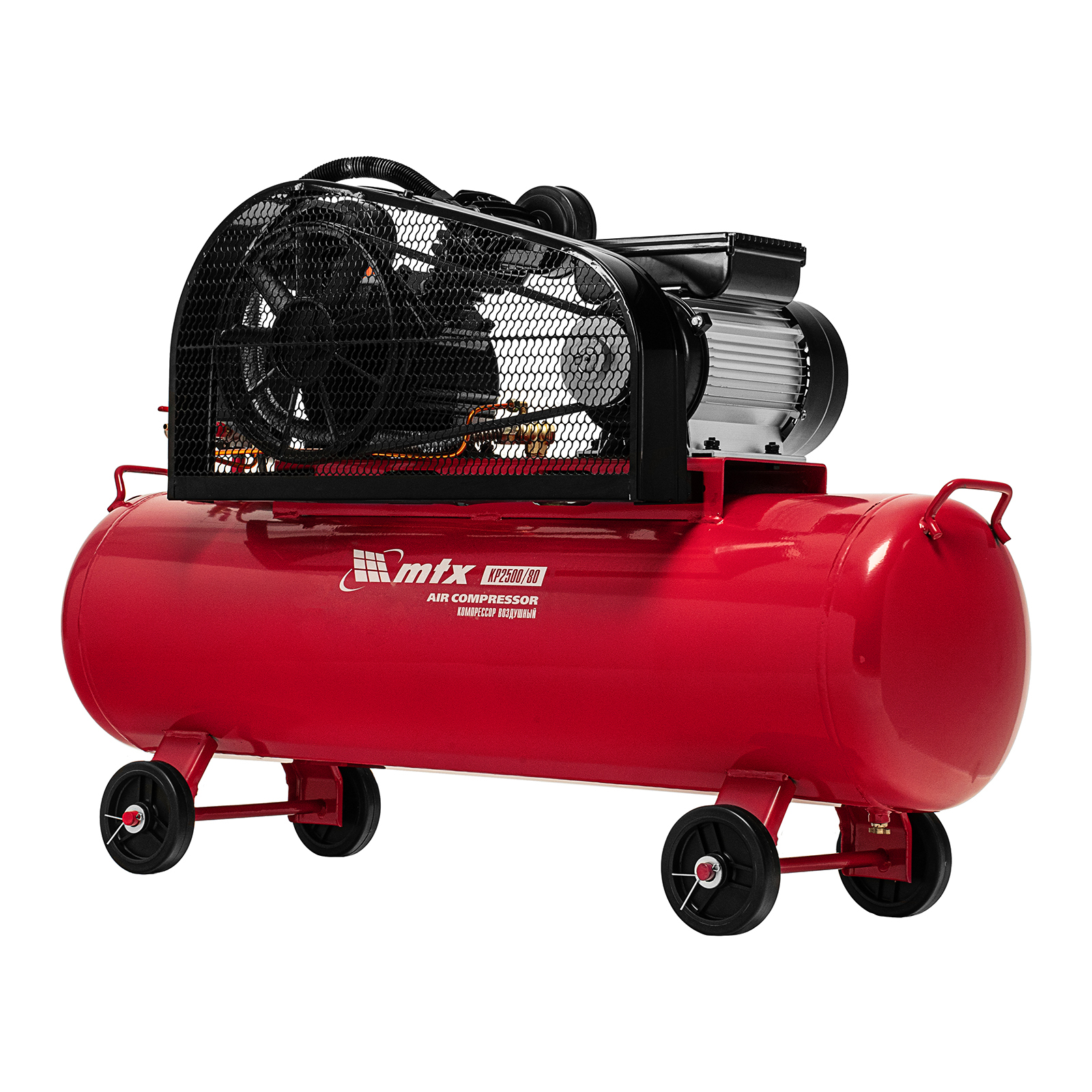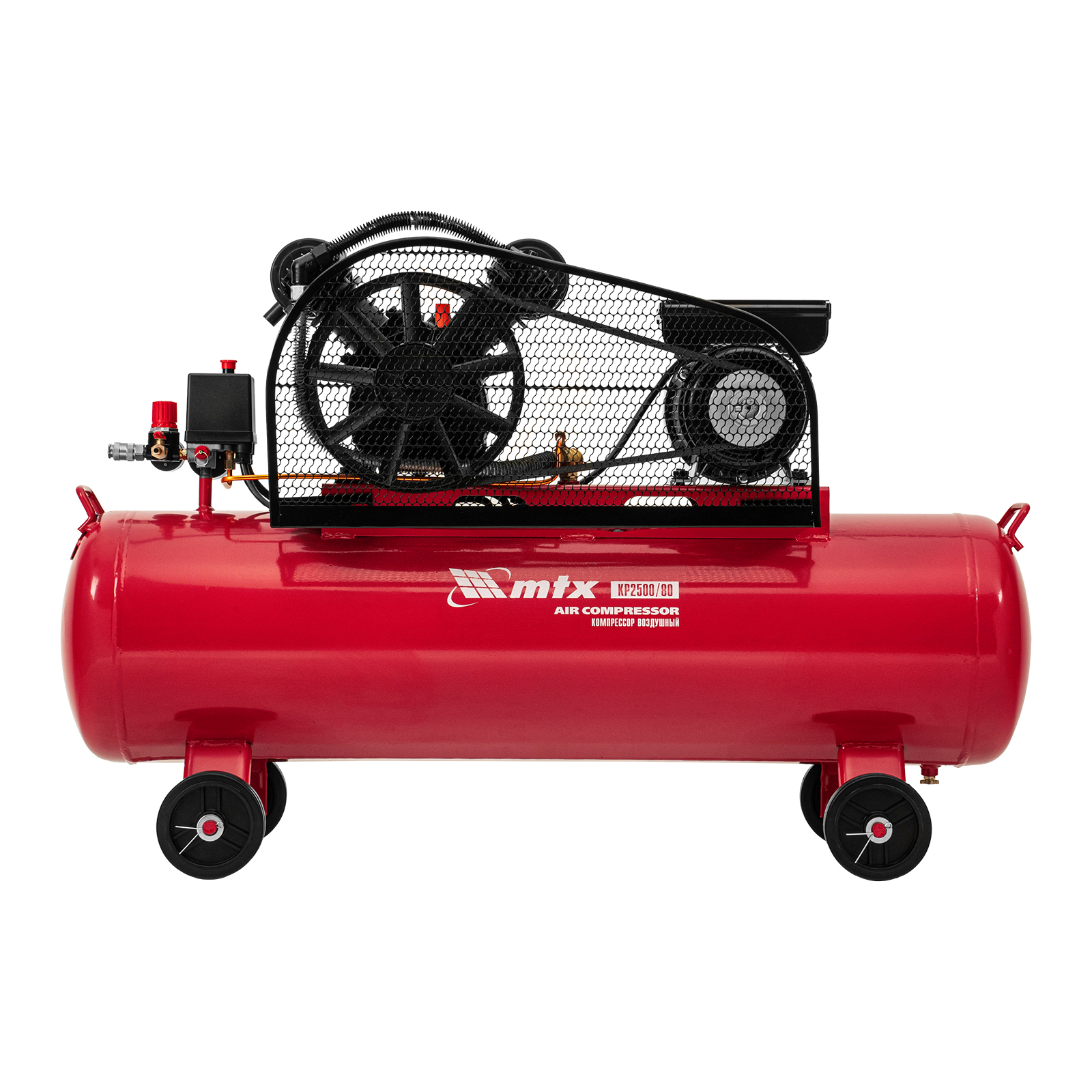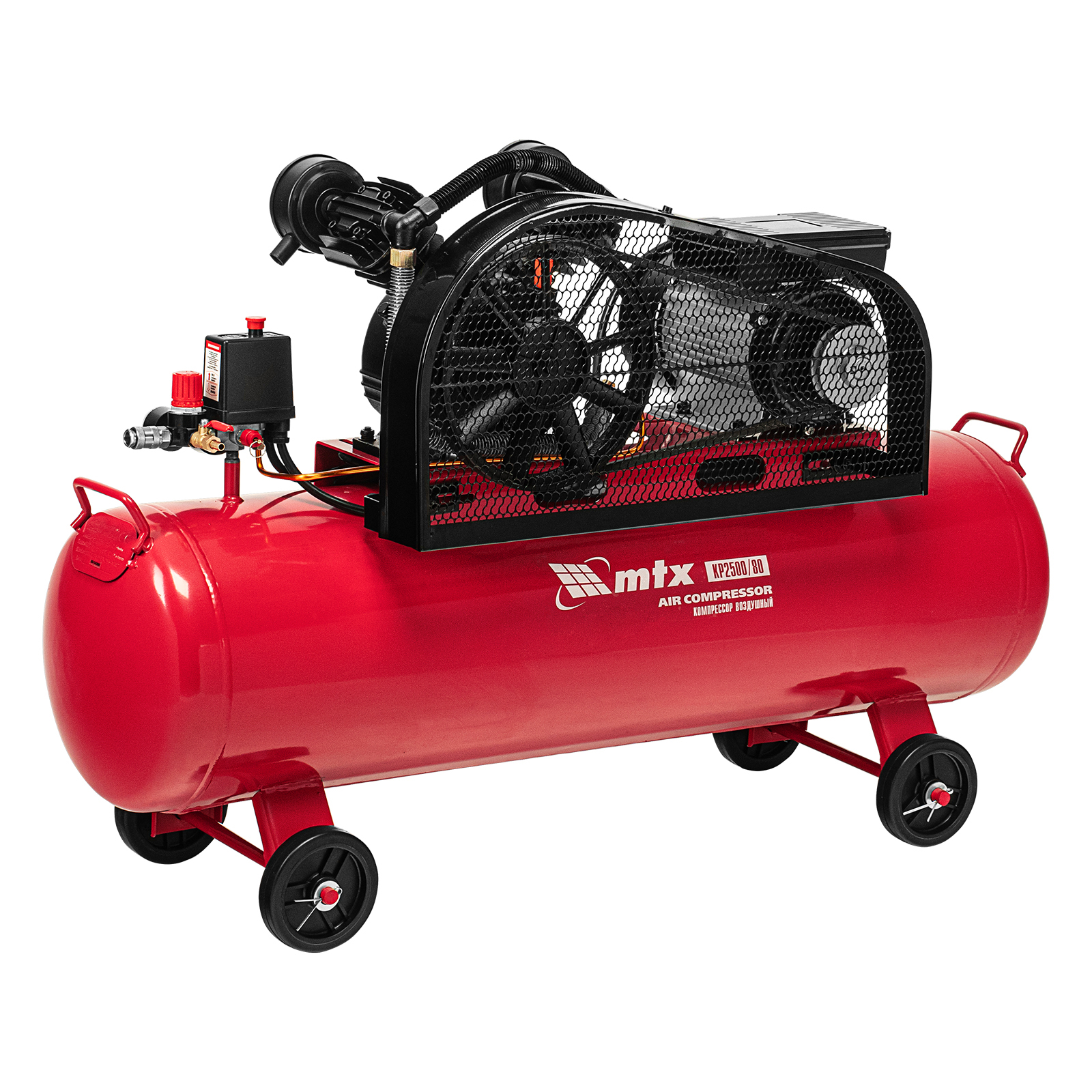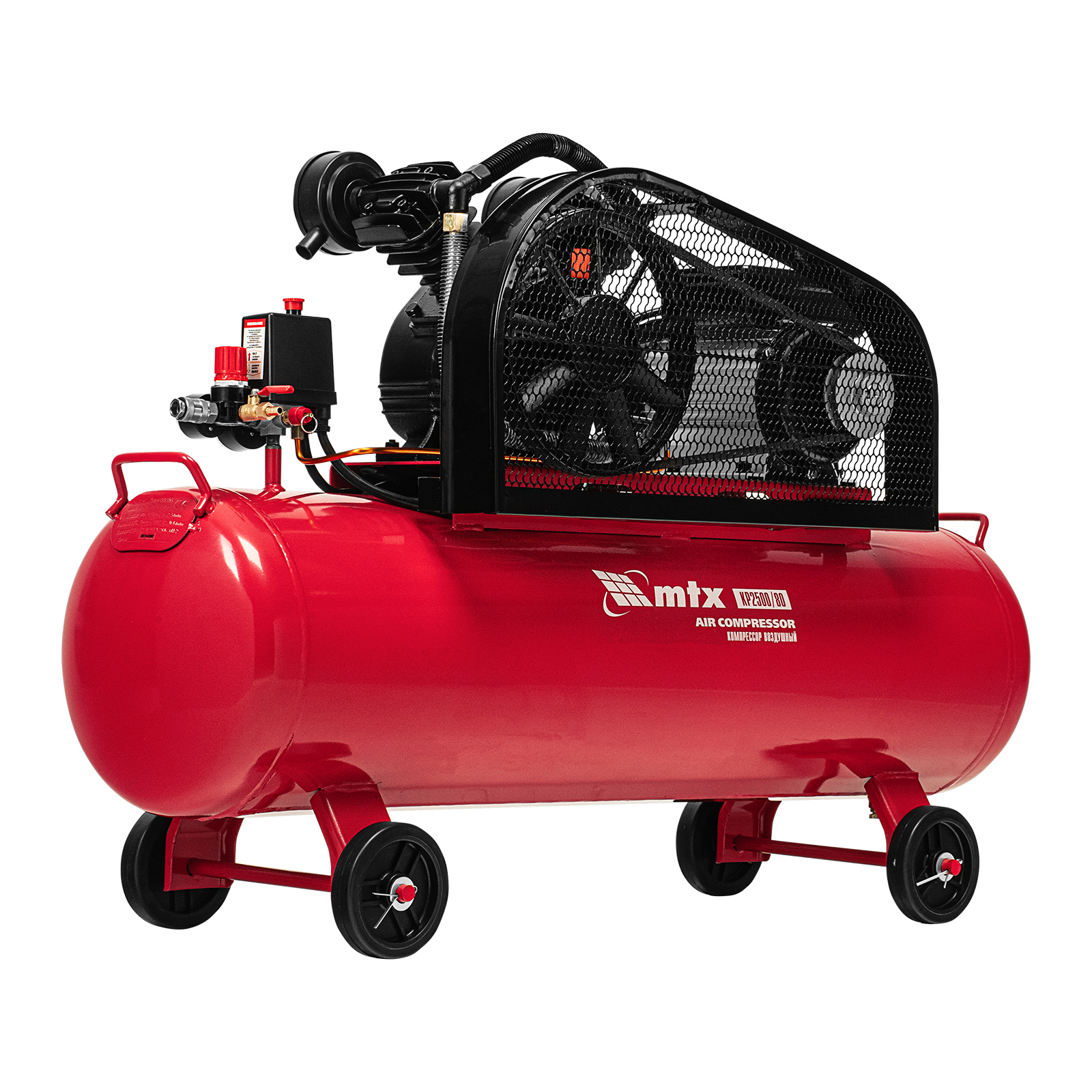 Компрессор воздушный МТХ КР2500/80 58022 с ременным приводом от электродвигателя, мощностью 2,5 кВт и производительностью 420 л/мин, с ресивером объемом 80 литров, применяется для подачи сжатого атмосферного воздуха к пневматическому инструменту. К нему можно подключить гайковерт, дрель, углошлифовальную машину, степлер, краскопульт, продувочный пистолет или другой пневмоинструмент. Для подключения предусмотрены 2 штуцера: быстросъемный и «елочка». Компрессор подходит для профессионального использования на предприятии автосервиса, строительной площадке, в мастерской.