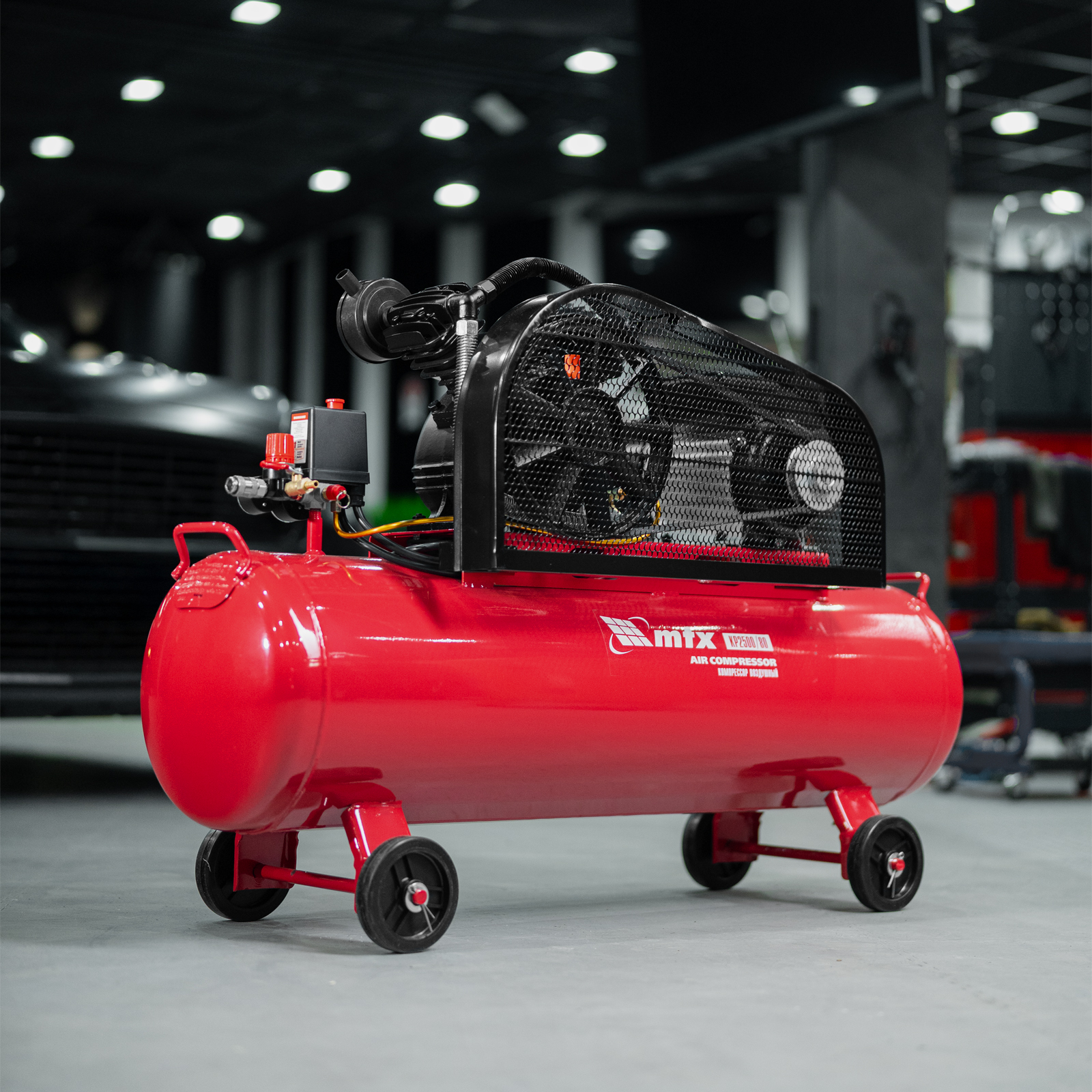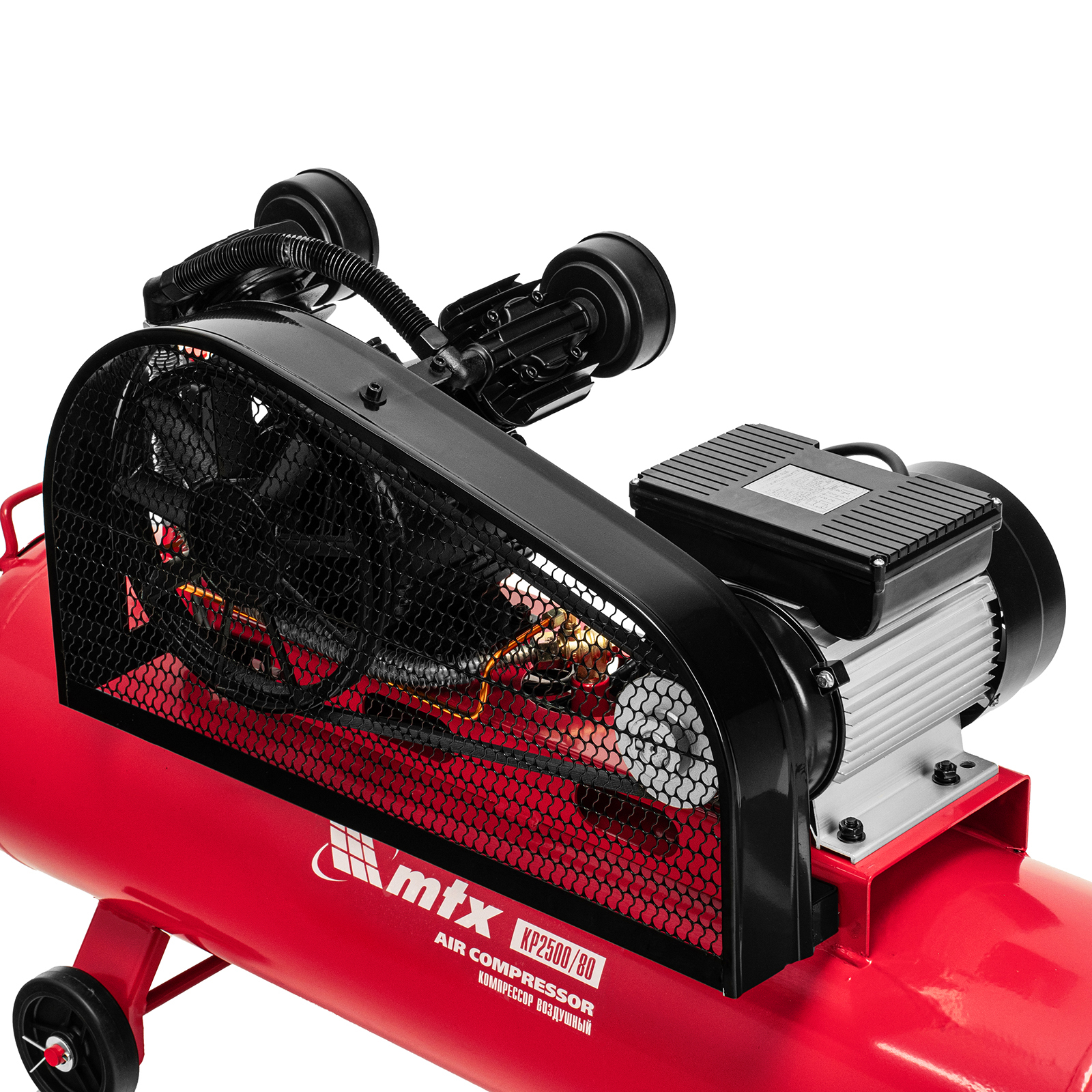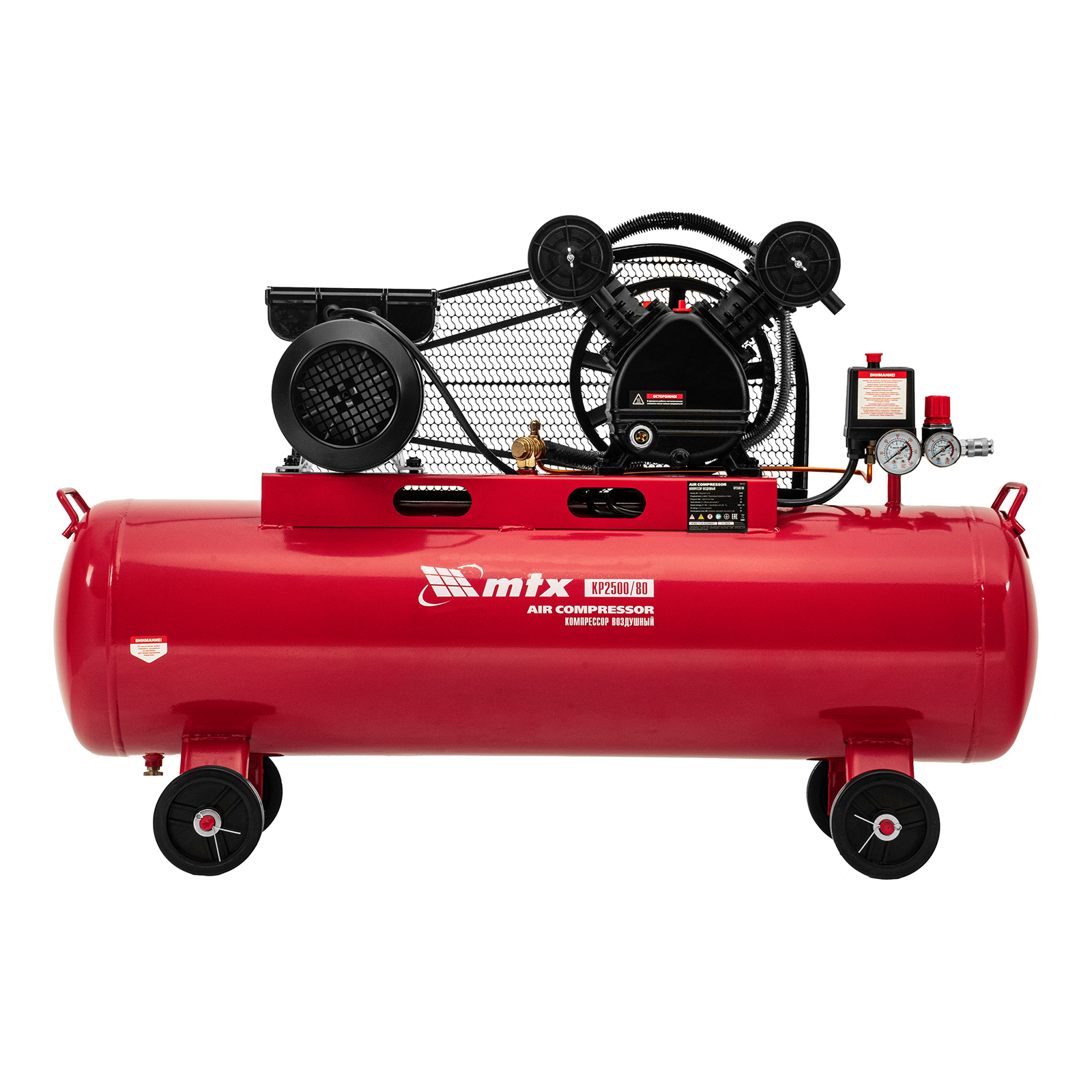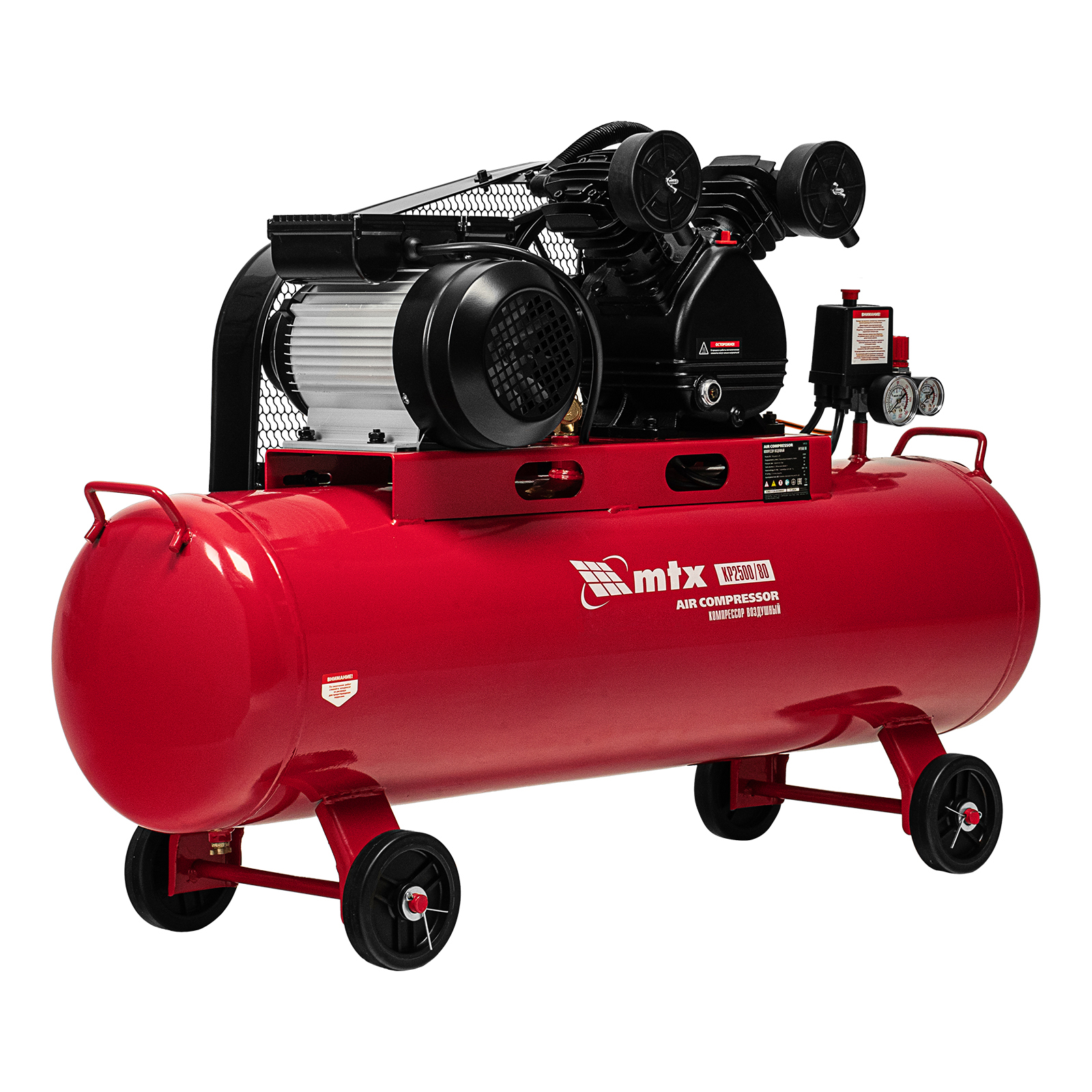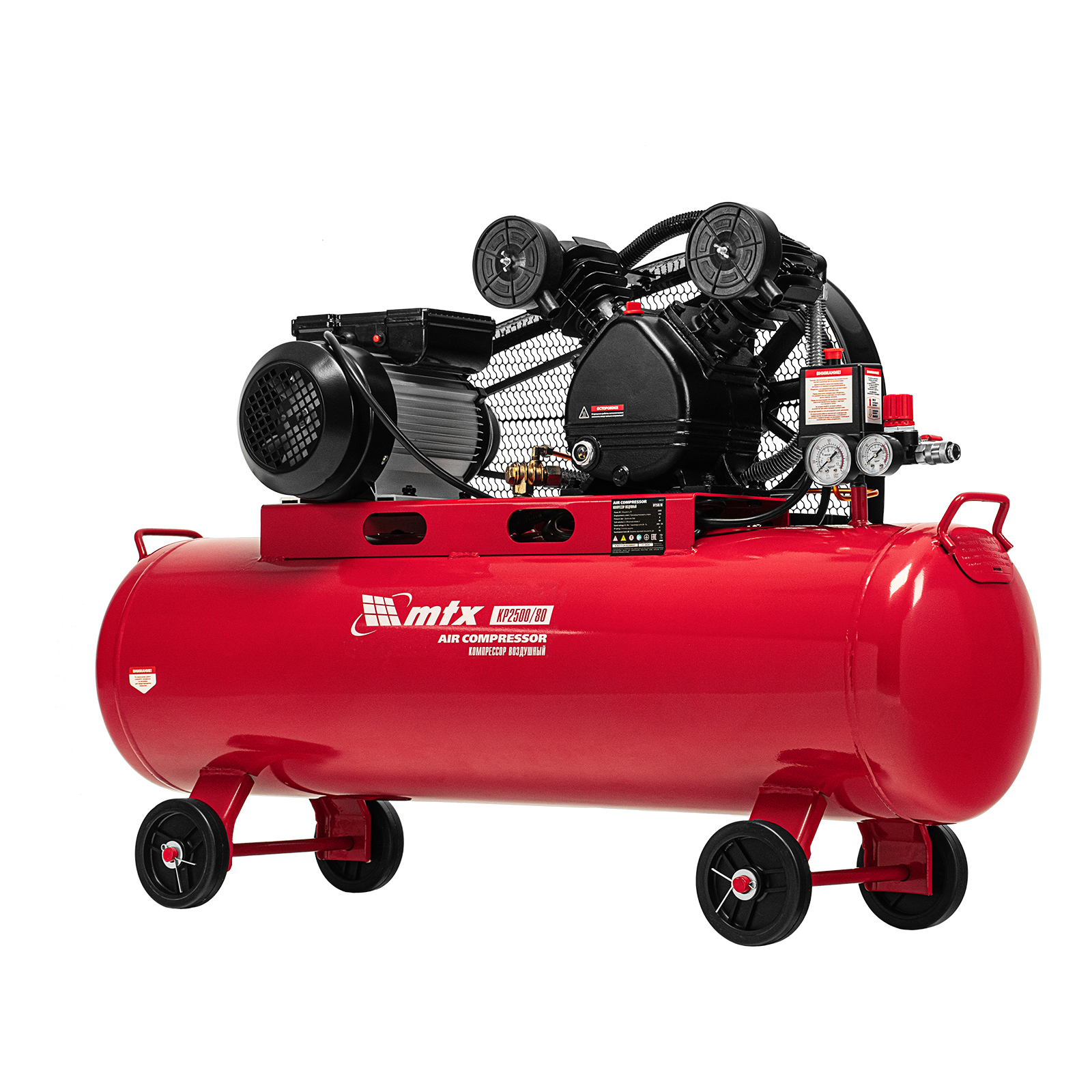 Компрессор воздушный МТХ КР2500/80 58022 с ременным приводом от электродвигателя, мощностью 2,5 кВт и производительностью 420 л/мин, с ресивером объемом 80 литров, применяется для подачи сжатого атмосферного воздуха к пневматическому инструменту. К нему можно подключить гайковерт, дрель, углошлифовальную машину, степлер, краскопульт, продувочный пистолет или другой пневмоинструмент. Для подключения предусмотрены 2 штуцера: быстросъемный и «елочка». Компрессор подходит для профессионального использования на предприятии автосервиса, строительной площадке, в мастерской.