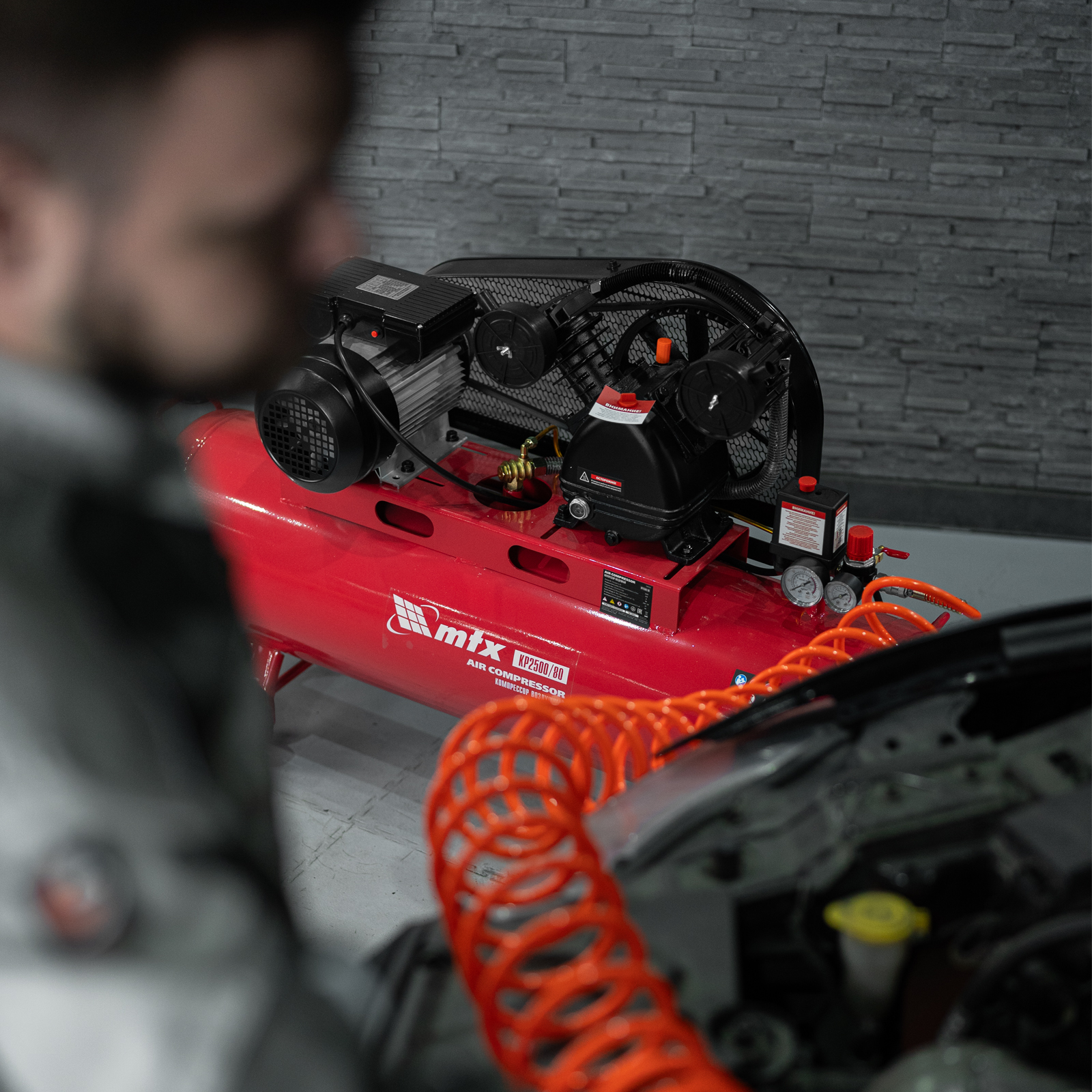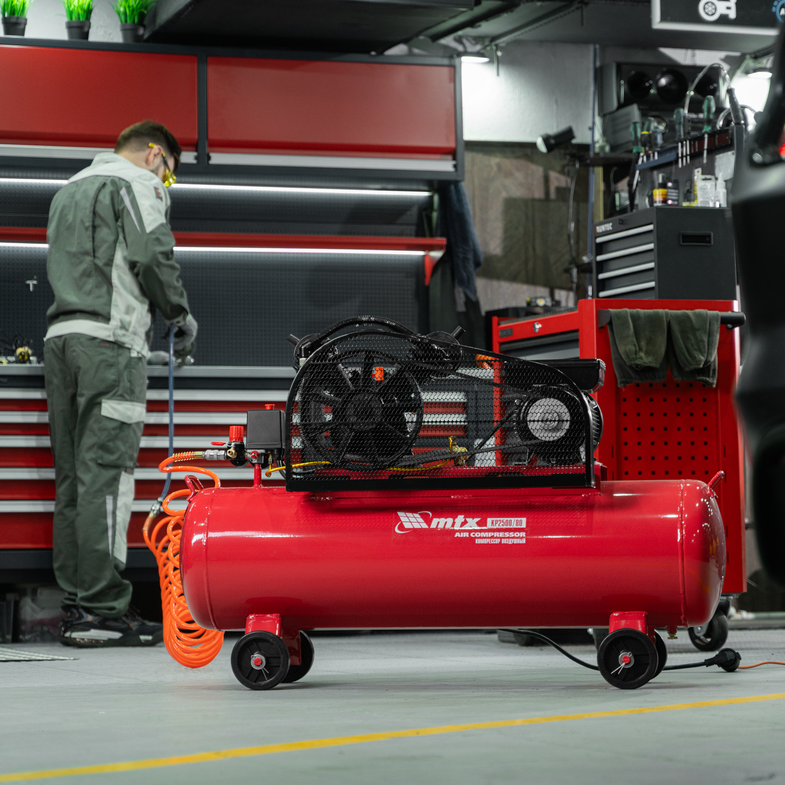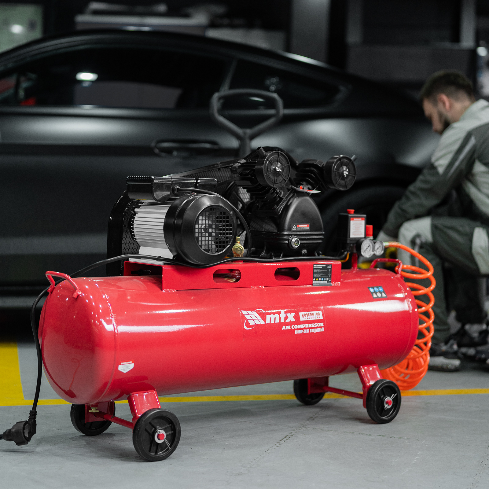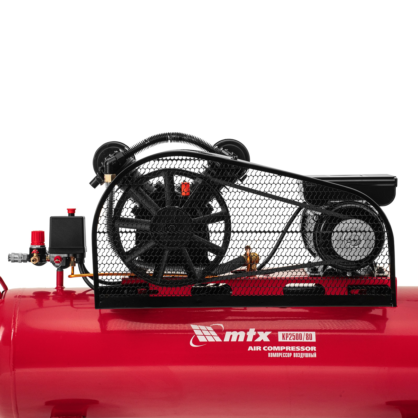 Компрессор воздушный МТХ КР2500/80 58022 с ременным приводом от электродвигателя, мощностью 2,5 кВт и производительностью 420 л/мин, с ресивером объемом 80 литров, применяется для подачи сжатого атмосферного воздуха к пневматическому инструменту. К нему можно подключить гайковерт, дрель, углошлифовальную машину, степлер, краскопульт, продувочный пистолет или другой пневмоинструмент. Для подключения предусмотрены 2 штуцера: быстросъемный и «елочка». Компрессор подходит для профессионального использования на предприятии автосервиса, строительной площадке, в мастерской.