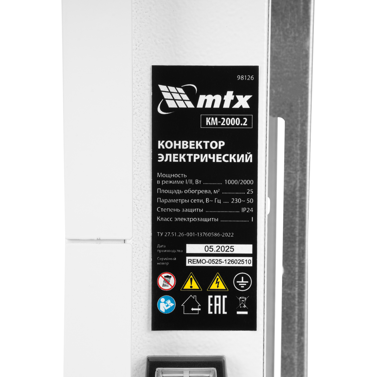 Конвектор электрический MTX KM-2000.2 98126 с X-образным нагревателем, колесами и термостатом, мощностью 2000 Вт, предназначен для использования в закрытых помещениях: квартирах, офисах, на производствах, в общественных местах и т.д. Рекомендуемая площадь обогрева составляет 25 кв.м. Х-образный нагревательный элемент обеспечивает быстрый и равномерный прогрев помещения до необходимой температуры, при этом не сушит воздух.
