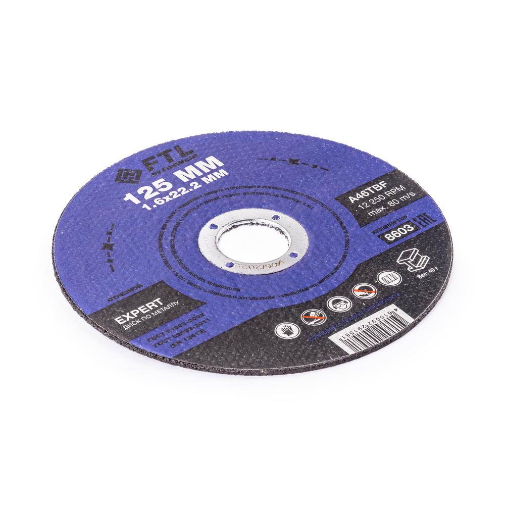 Диск отрезной по металлу FTL Expert 125 х 1,6 х 22,2 мм A46TBF - расходный инструмент для ручной угловой шлифовальной машины, предназначенный для резки различных изделий из чёрных металлов (чугунов). Конструктивно представляет собой плоский диск (тип 41), поверхность которого покрыта слоем абразивных частиц. Посыпка скреплена между собой бакелитовой связкой и армирована одной стекловолоконной сеткой и тканой подложкой. Поставляется во влагозащитной упаковке. Серия EXPERT - абразивный состав, оптимизированный для высокой износостойкости при резе чёрных металлов. Это свойство даёт увеличенный срок службы одного круга, давая возможность сделать значительно бóльшее количество резов заготовки, чем круги с обычным абразивом. Не рекомендуется для реза изделий из нержавеющей стали во избежание перегрева, прижога, окисления, потери эффективности легирующих добавок.ИЗНОСОСТОЙКОСТЬ: Благодаря премиальной формуле режущая и шлифовальная способность абразива снижается в процессе работы значительно медленнее, позволяя выполнить больше работы.УНИКАЛЬНЫЙ СОСТАВ: Технология производства включает в себя эксклюзивный рецепт абразива и смол: применение только твёрдых составов класса ВТ1, ВТ2, армирование сеткой из стекловолокна. Высокая твёрдость связывающей смолы позволяет сделать значительно большее количество резов по сравнению с кругами с обычным абразивом.МЕТАЛЛИЧЕСКОЕ КОЛЬЦО: Металлическое кольцо на диске обеспечивает плотную посадку на фланец УШМ, исключая биения и вибрацию при работе.ГЕРМЕТИЧНОСТЬ УПАКОВКИ: Диски упакованы в специальную термоусадочную герметичную плёнку, которая предохраняет от пыли и влаги при длительном хранении в условиях повышенной влажности, на строительных объектах и крупных промышленных производствах.ПРЕИМУЩЕСТВА:По чёрному металлу (!)Тип 41 (плоский)Высокая износостойкость (долгий срок службы)Состав на базе оксида алюминияПрофессиональный компаундМеталлическое кольцо для плотной посадки на фланец УШМВлагозащитная упаковкаКОМПЛЕКТАЦИЯ: Отрезной круг по чёрному металлу в термоусадочной плёнке со вкладышем – 10 шт.