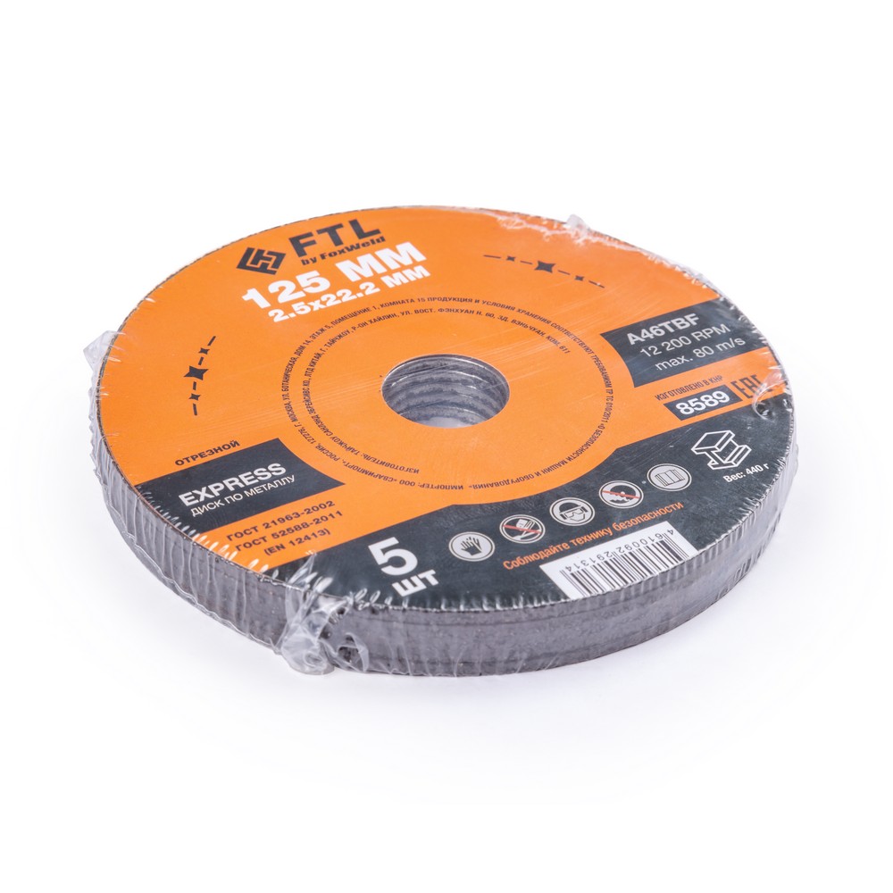 Диск отрезной по металлу FTL Express 125 х 2,5 х 22,2 мм A46TBF - расходный инструмент для ручной угловой шлифовальной машины, предназначенный для резки различных изделий из чёрных металлов (чугунов). Конструктивно представляет собой плоский диск (тип 41), поверхность которого покрыта слоем абразивных частиц. Посыпка скреплена между собой бакелитовой связкой и армирована одной стекловолоконной сеткой и тканой подложкой. Поставляется во влагозащитной упаковке. Серия EXPRESS представляет абразивный состав высокой твёрдости, оптимизированный для скоростного реза чёрных металлов. Не рекомендуется для реза изделий из нержавеющей стали во избежание перегрева, прижога, окисления, потери эффективности легирующих добавок.ИЗНОСОСТОЙКОСТЬ: Благодаря премиальной формуле режущая и шлифовальная способность абразива снижается в процессе работы значительно медленнее, позволяя выполнить больше работы.УНИКАЛЬНЫЙ СОСТАВ: Технология производства включает в себя эксклюзивный рецепт абразива и смол: применение только твёрдых составов класса ВТ1, ВТ2, армирование сеткой из стекловолокна. Высокая твёрдость связывающей смолы позволяет сделать значительно большее количество резов по сравнению с кругами с обычным абразивом.МЕТАЛЛИЧЕСКОЕ КОЛЬЦО: Металлическое кольцо на диске обеспечивает плотную посадку на фланец УШМ, исключая биения и вибрацию при работе.ГЕРМЕТИЧНОСТЬ УПАКОВКИ: Диски упакованы в специальную термоусадочную герметичную плёнку, которая предохраняет от пыли и влаги при длительном хранении в условиях повышенной влажности, на строительных объектах и крупных промышленных производствах.ПРЕИМУЩЕСТВА:По чёрному металлу (!)Тип 41 (плоский)Быстрый резСостав на базе оксида алюминияМеталлическое кольцо для плотной посадки на фланец УШМВысокая твёрдость составаВлагозащитная упаковкаКОМПЛЕКТАЦИЯ: Отрезной круг по чёрному металлу в термоусадочной плёнке со вкладышем – 5 шт.
