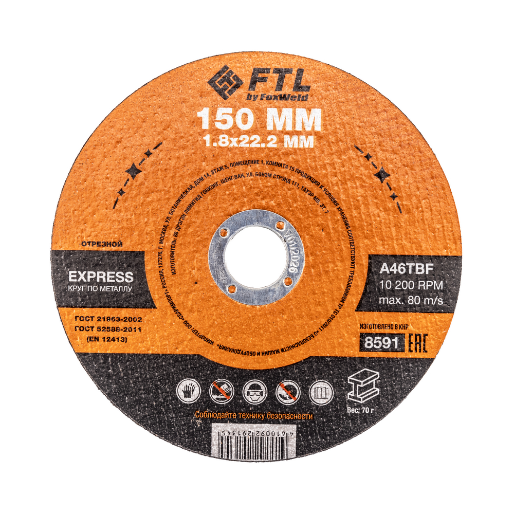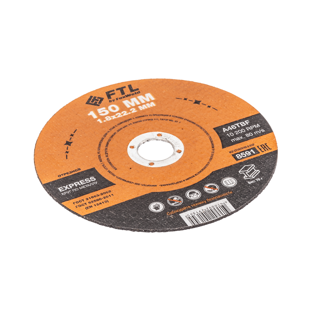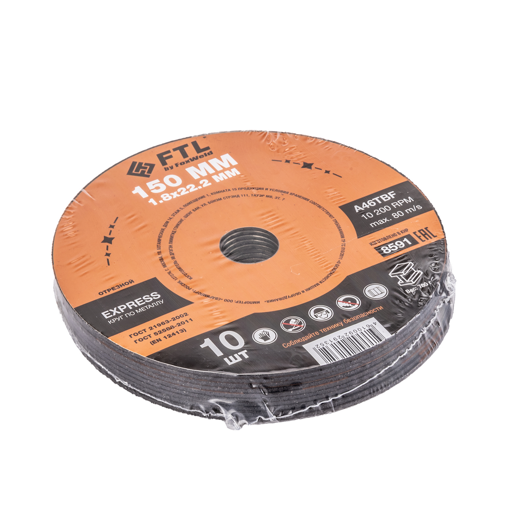 Диск отрезной по металлу FTL Express 150 х 1,8 х 22,2 мм A46TBF - расходный инструмент для ручной угловой шлифовальной машины, предназначенный для резки различных изделий из чёрных металлов (чугунов). Конструктивно представляет собой плоский диск (тип 41), поверхность которого покрыта слоем абразивных частиц. Посыпка скреплена между собой бакелитовой связкой и армирована одной стекловолоконной сеткой и тканой подложкой. Поставляется во влагозащитной упаковке. Серия EXPRESS представляет абразивный состав высокой твёрдости, оптимизированный для скоростного реза чёрных металлов. Не рекомендуется для реза изделий из нержавеющей стали во избежание перегрева, прижога, окисления, потери эффективности легирующих добавок.ИЗНОСОСТОЙКОСТЬ: Благодаря премиальной формуле режущая и шлифовальная способность абразива снижается в процессе работы значительно медленнее, позволяя выполнить больше работы.УНИКАЛЬНЫЙ СОСТАВ: Технология производства включает в себя эксклюзивный рецепт абразива и смол: применение только твёрдых составов класса ВТ1, ВТ2, армирование сеткой из стекловолокна. Высокая твёрдость связывающей смолы позволяет сделать значительно большее количество резов по сравнению с кругами с обычным абразивом.МЕТАЛЛИЧЕСКОЕ КОЛЬЦО: Металлическое кольцо на диске обеспечивает плотную посадку на фланец УШМ, исключая биения и вибрацию при работе.ГЕРМЕТИЧНОСТЬ УПАКОВКИ: Диски упакованы в специальную термоусадочную герметичную плёнку, которая предохраняет от пыли и влаги при длительном хранении в условиях повышенной влажности, на строительных объектах и крупных промышленных производствах.ПРЕИМУЩЕСТВА:По чёрному металлу (!)Тип 41 (плоский)Быстрый резСостав на базе оксида алюминияМеталлическое кольцо для плотной посадки на фланец УШМВысокая твёрдость составаВлагозащитная упаковкаКОМПЛЕКТАЦИЯ: Отрезной круг по чёрному металлу в термоусадочной плёнке со вкладышем – 10 шт.