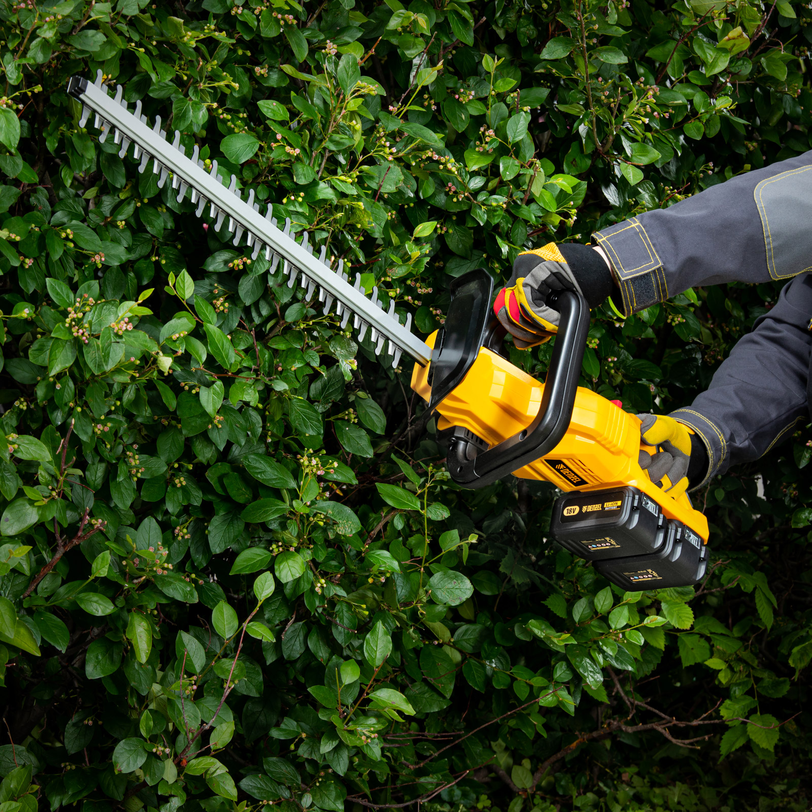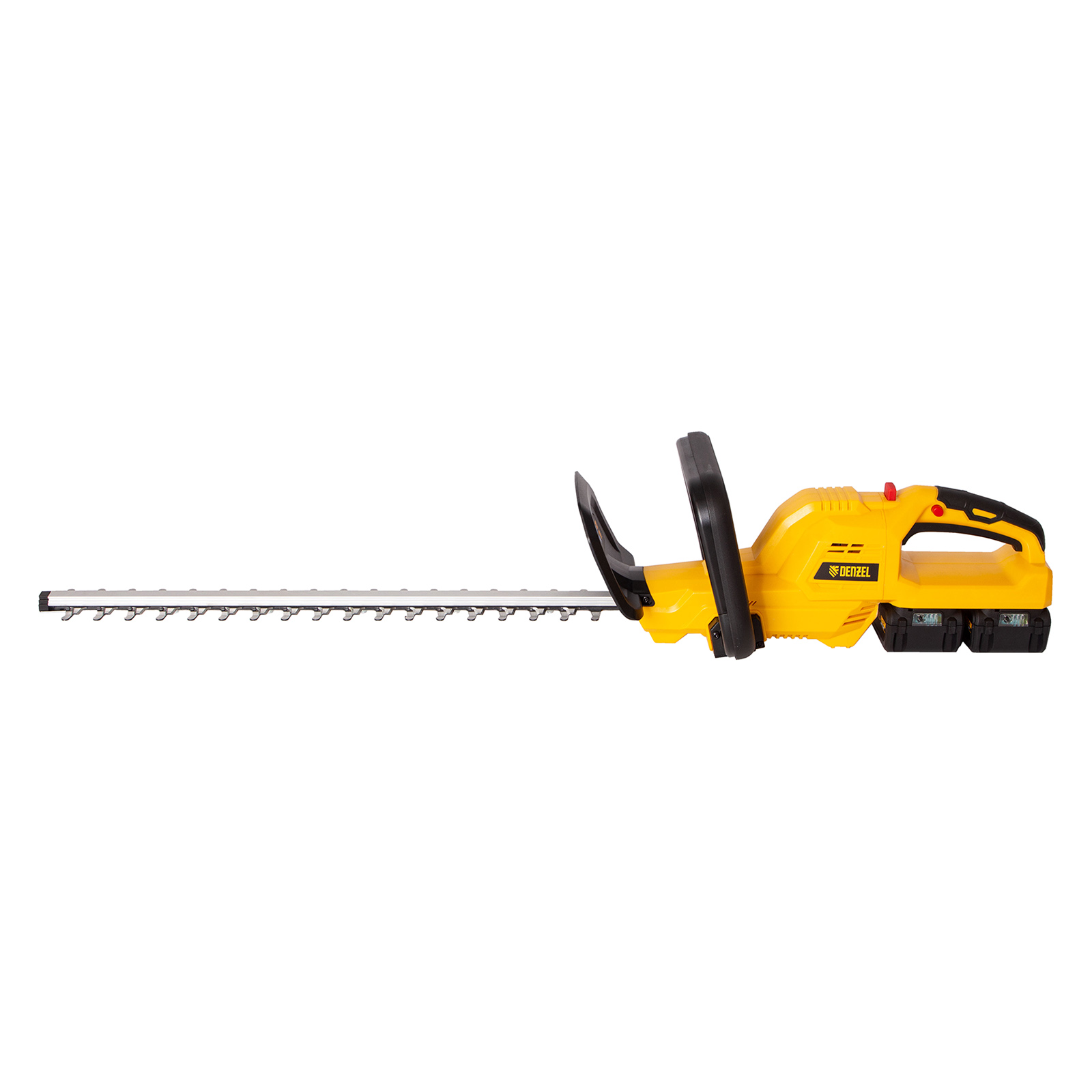 Аккумуляторный кусторез Denzel RBC510-36 59410 с двумя Li-Ion батареями емкостью 4 Ач и суммарным напряжением 36 В, с поворотной ручкой, используется для стрижки кустарников и тонких веток деревьев, подрезания дикой поросли травы. С его помощью можно создать живую изгородь или ландшафтные скульптуры из декоративных растений. Нож длиной 510 мм обеспечивает толщину реза 24 мм.,Кусторез не зависит от сети электропитания, поэтому работать с ним можно в самых отдаленных участках сада. Устройство не выделяет вредных выхлопов и работает намного тише в сравнении с бензиновыми аналогами.
