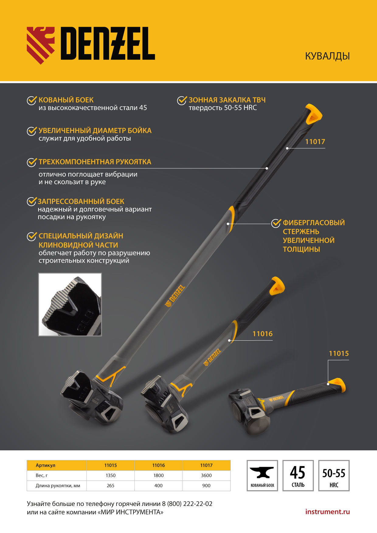 Кувалда Denzel 11016 с клиновидным бойком весом 1,8 кг и фибергласовой рукояткой с TPR-покрытием предназначена для нанесения ударов. Две рабочие зоны делают ее универсальной в работе: клиновидный боек позволяет разрушать кирпичную кладку, конструкции из бетона и камня, а плоский боек — забивать большие гвозди, колья, клинья и выполнять другие ударные работы. Инструмент также подходит для сгибания и придания формы металлическим деталям. Используется при проведении слесарных, строительных и кузовных работ, подойдет и для бытового применения.