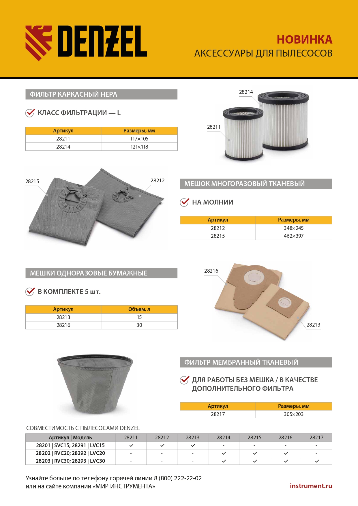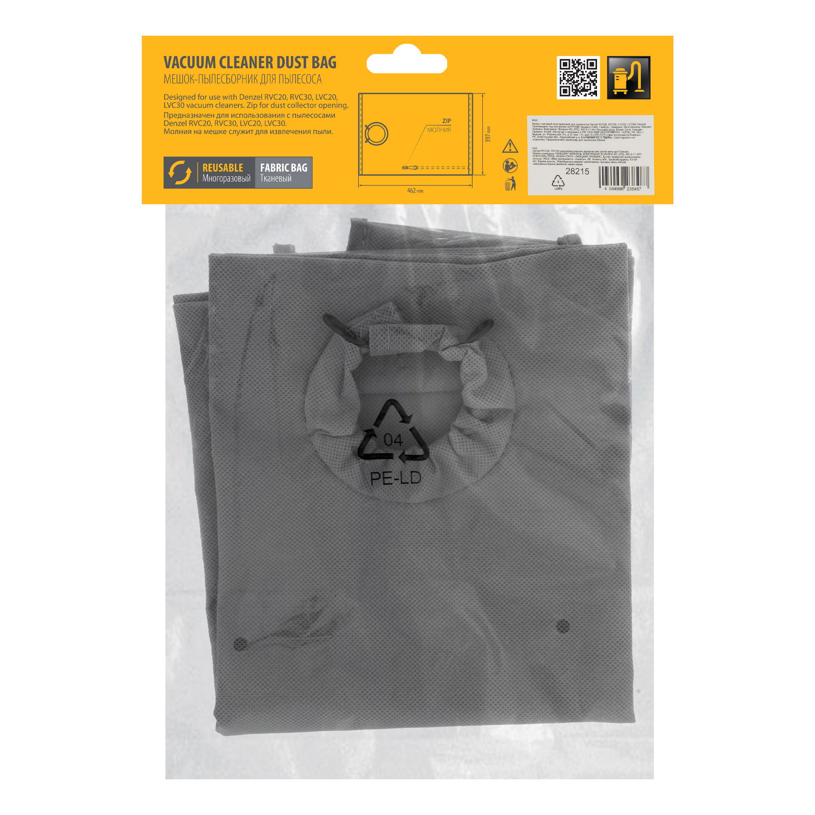 Многоразовый тканевый мешок Denzel 28215 — сменный аксессуар для строительных пылесосов RVC20 (28202), RVC30 (28203), LVC20 (28292), LVC30 (28293). Устанавливается в бак пылесоса и служит для сбора мусора во время сухой уборки.