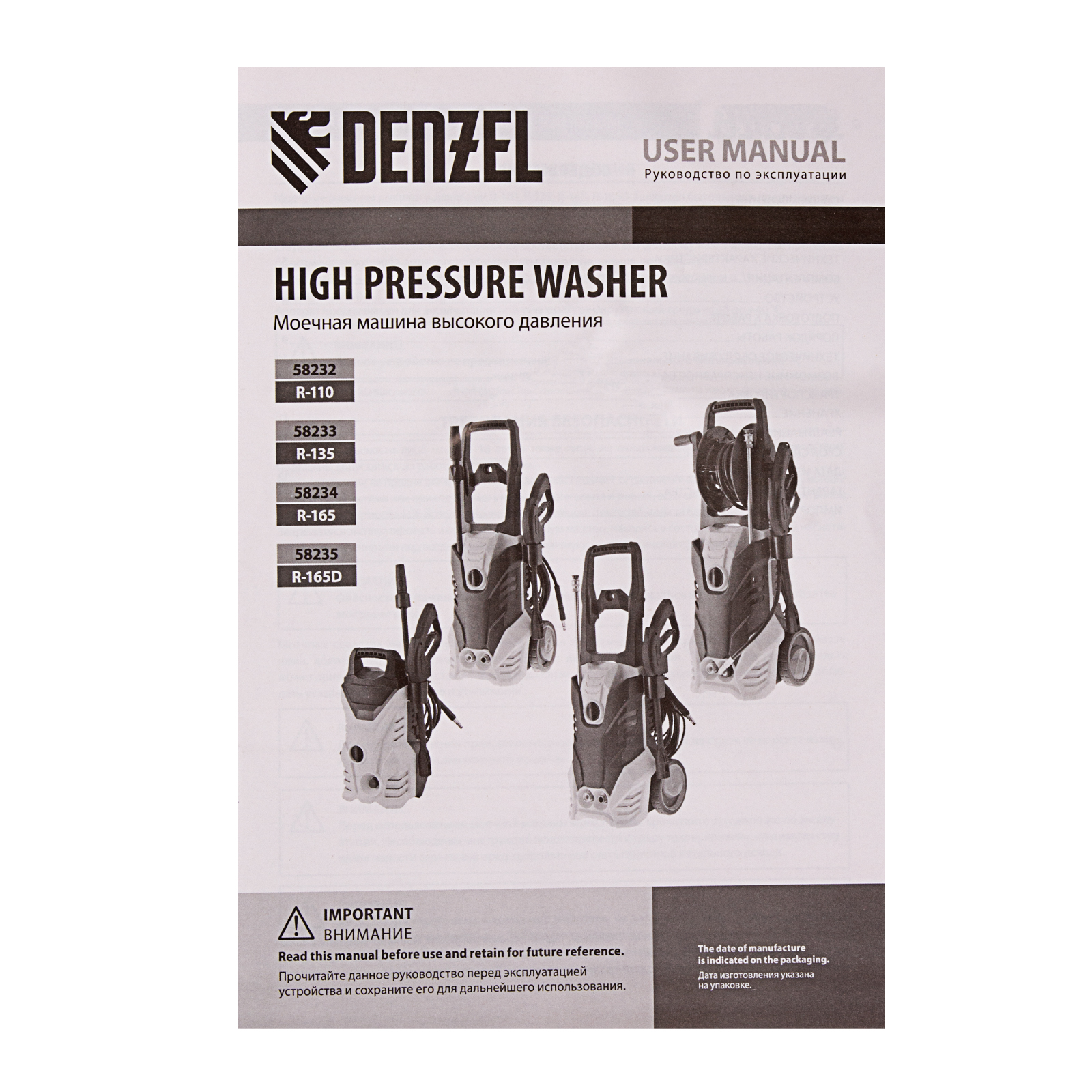 Моечная машина высокого давления R-165, 2200 Вт, 165 бар, 7 л/мин, колесная Denzel в Краснодаре